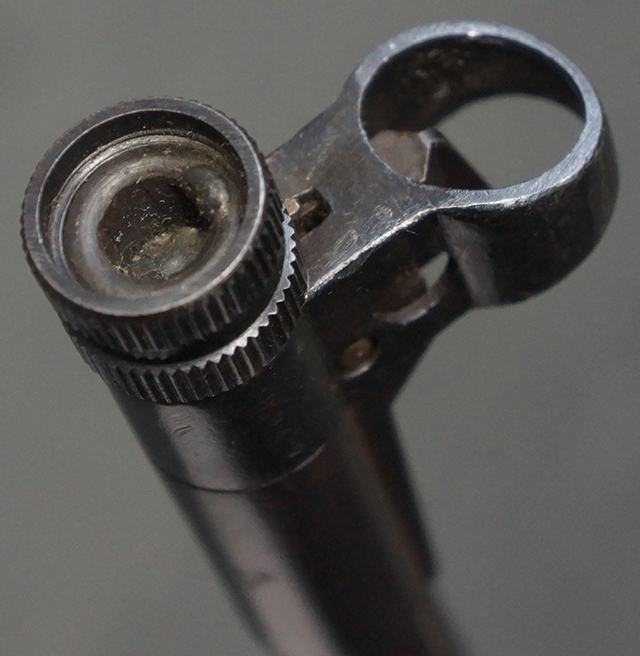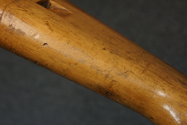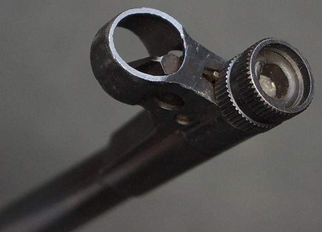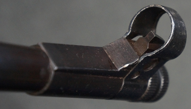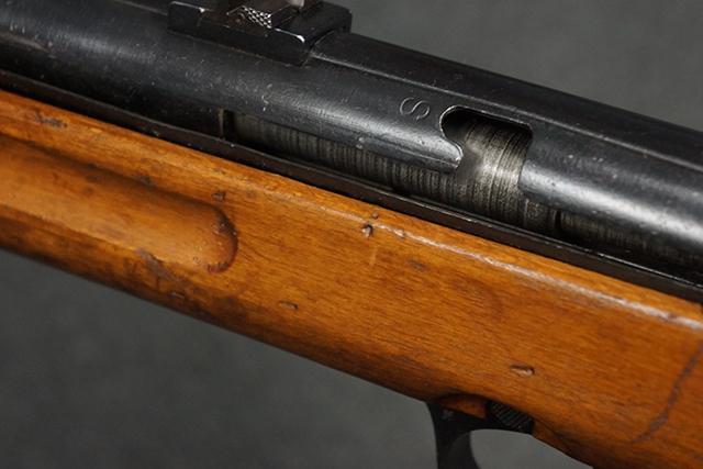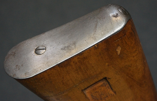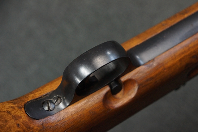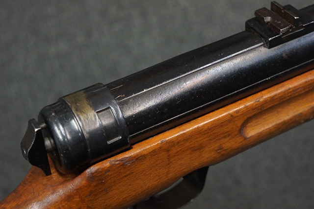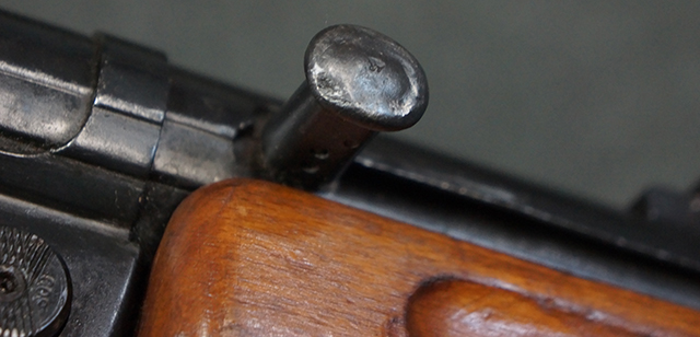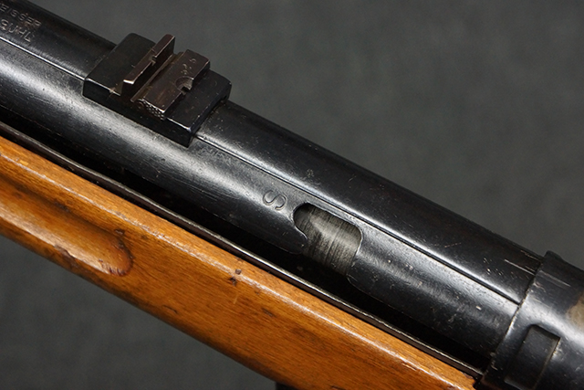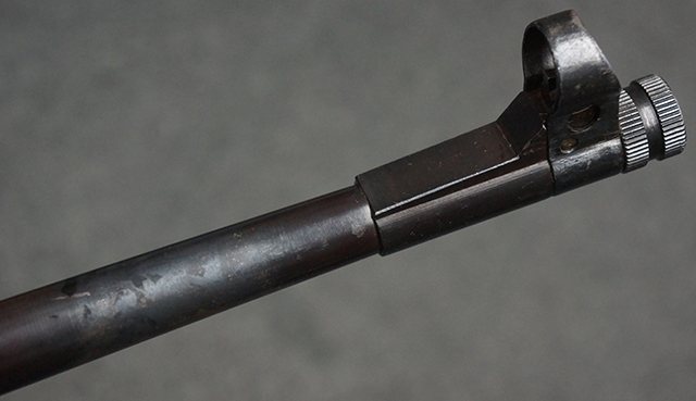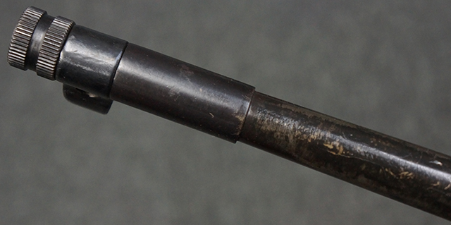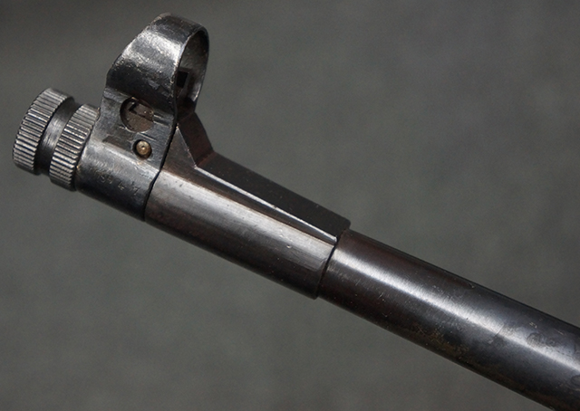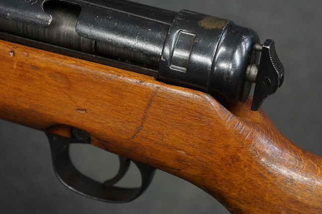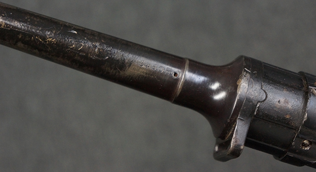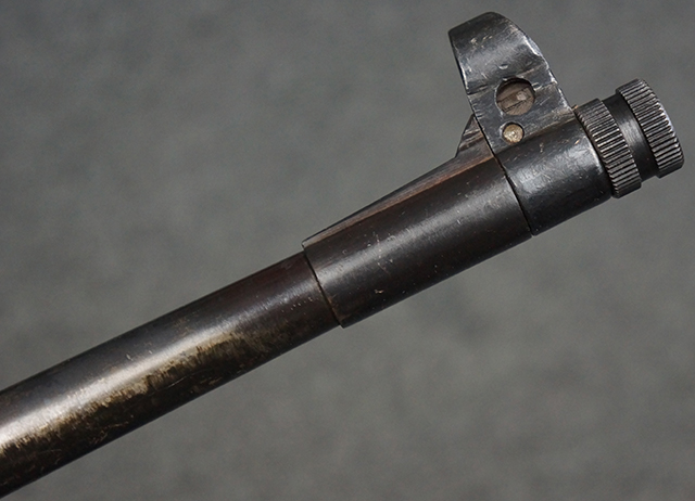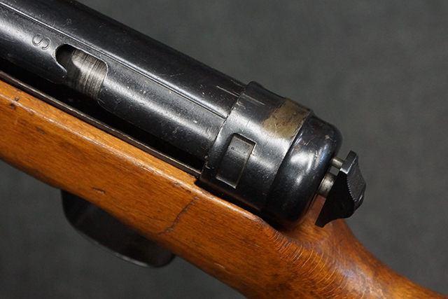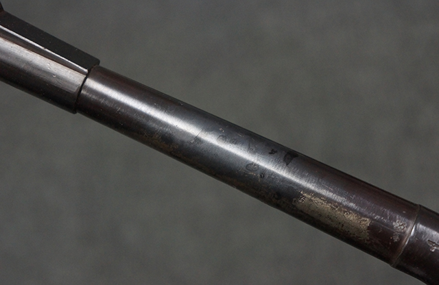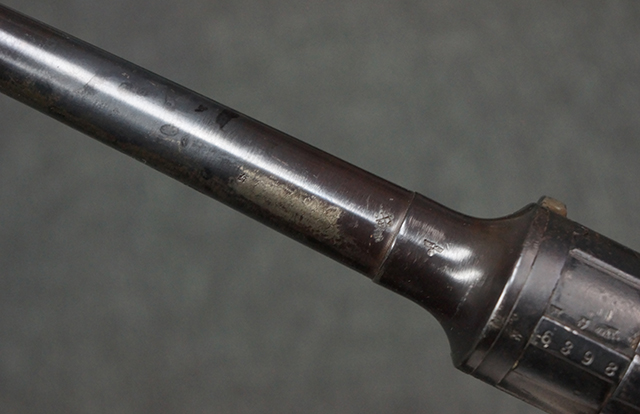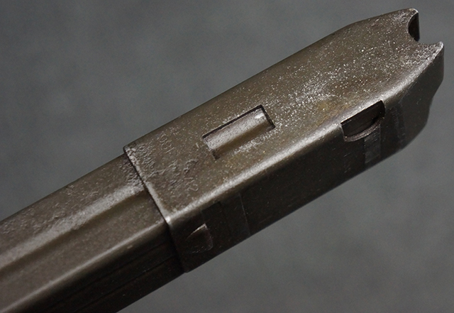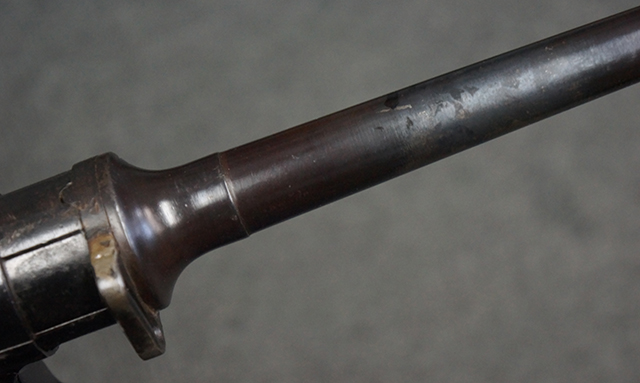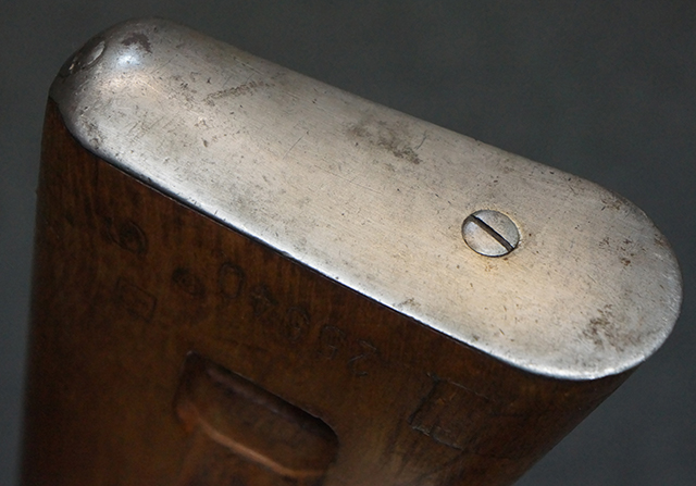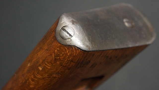 木製ストックはやや明るい色合いで、やや打ち傷や線傷が見受けられるものの、目立った破損等は見受けられず、艶の有る仕上げが残ったしっかりとした状態が保たれています。 銃床右側面のハンドガード下部、銃把付近及びバット・ストック後端上部にやや目立つ打ち傷が見受けられますが、いずれも強度的には影響の無いレベルです。 バット・プレート近くの左側面下部に接ぎ木による当時の修理跡が見受けられます。 傷みやすいバット・プレートについては全体に白磨きのような状態となっており、若干の小傷や表面錆は見受けられるものの、目立った変形などは見受けられず、比較的良好な状態が保たれています。