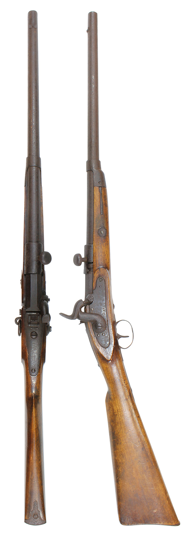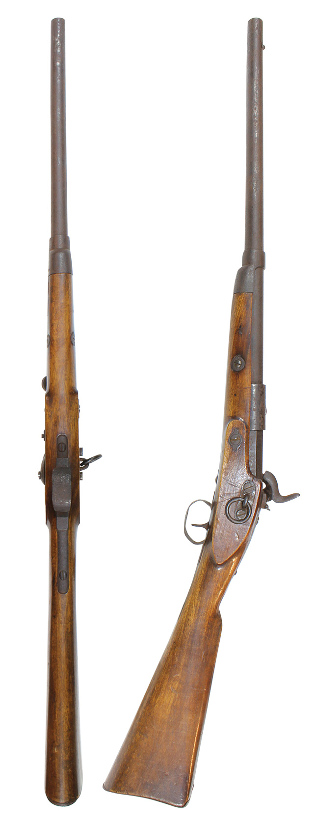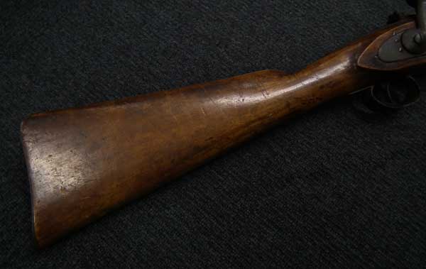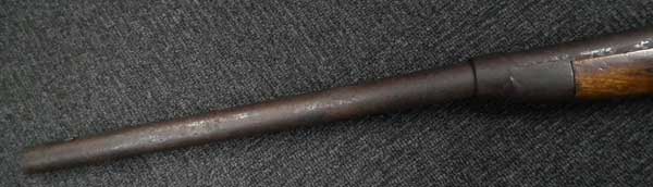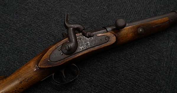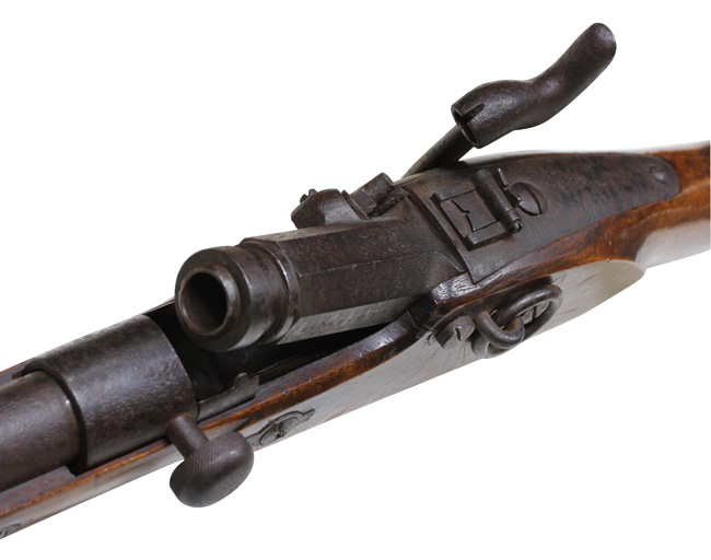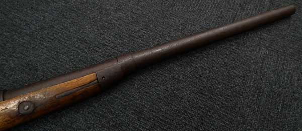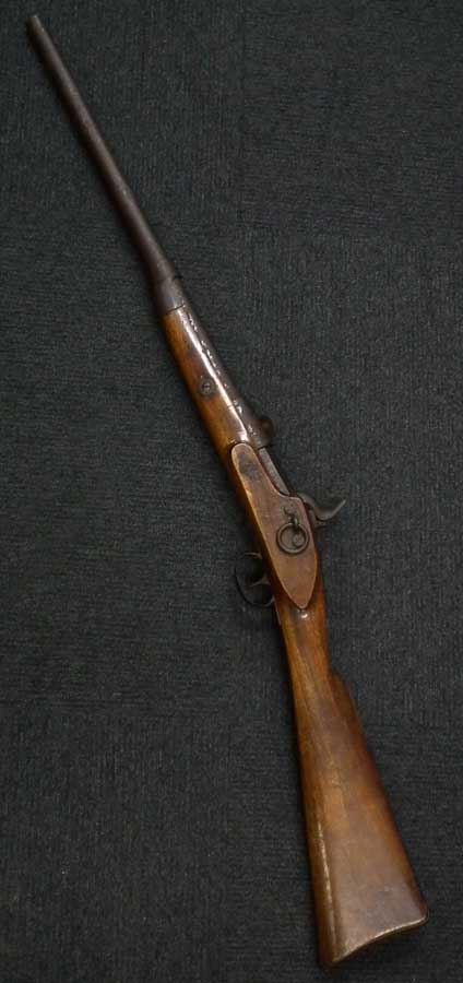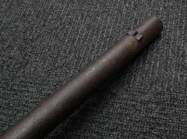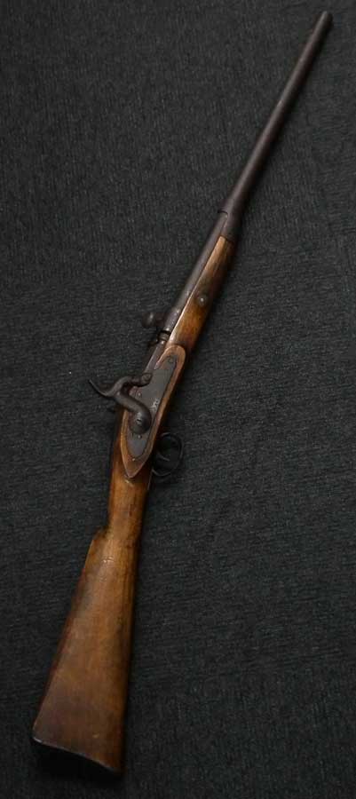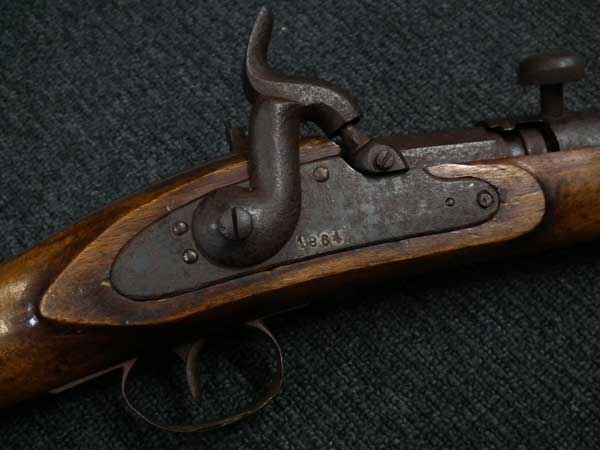 前装式から後装式に装弾方法が変わって行く中で、多くの種類の(元込式)装弾メカニズムが考案され、リンドナー カービンはその中で数少ない南北戦争で使用された品でした。 南北戦争で使用された後装式の中で比較的初期に実用化されたシステムで日本では「遊底こう起式」と呼ばれています。 「遊底こう起式」は海外でも珍しく日本にはホール ライフルとリンドナー ライフルが幕末に輸入された記録があります。 その一つのホール ライフルは世界初の後装式軍用銃として、日本ではペリーが徳川幕府に献上したライフルとして有名です。 一方リンドナー ライフルは国内でも現存数が少なく、弊社で2挺もとり扱ったのは奇跡とも言えます。 「遊底こう起式」とは薬室前方に筒状の駐筒と呼ばれるカバーが付いており、その右側面のハンドルを持って左側に約180度回転させることによって薬室のロックが開放される仕組みになっています。 薬室後部に蝶番とバネが付いており、駐筒によって留められているロックが解除されると薬室前部が蝶番を軸にこう起(起き上がる)して薬室の前から装弾を行う機構の品を指します。薬室前部をこう起させるにはまず撃鉄を起こしておく必要があります。 装弾が終われば、起き上がった遊底を下に閉め駐筒を今度は右側へ約180度回転させて完全に閉鎖する仕組みです。 この駐筒によって薬室前部と銃身後部という「最もガス漏れが生じる部分を完全に閉鎖する」当時としては画期的なシステムでした。 弾薬は装薬と弾頭を紙で包んだだけの単純なもので、雷管などは付いていませんでした。 発射後にはペーパー・カートリッジは消失して排莢の必要はありませんでした。 ペーパー・カートリッジといっても弾頭と装薬を一まとめに包んだだけの簡単なものです。 撃発装置は右側のプレート(サイド・ロック)に付いたサイド・ハンマーによる一般的な独立した雷管外火式です。 ホール ライフルがトップ・ハンマーであったので容易に区別がつきます。 本品にはサイド・プレートの番号以外には刻印がなく、刻印での製造元の判別はつきません。 弊社での推測ですがアメリカ南部連合国で南北戦争中の1864年に製造されたものではないでしょうか。 本モデルはリンドナーの初期型 騎兵銃(カービン)で、当時のアメリカ製騎兵銃と共通するサドル・リングと呼ばれる大きな環(リング)がサイド・ロックの反対側(左側)に付いています。
