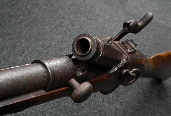 駐筒(カバー)を左方へ180度回転させると、バネの力で遊底前部が起き上がる仕組みはこの銃だけのアイデアですので、希少価値だけではなく構造的に非常に興味深い品です。所荘吉氏著「増補 図解古銃事典」のP.146の写真とストックの形状はやや異なるものの、機関部は全く同じものです。(MM)