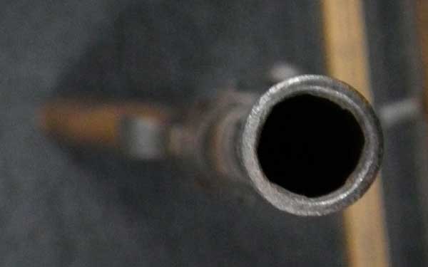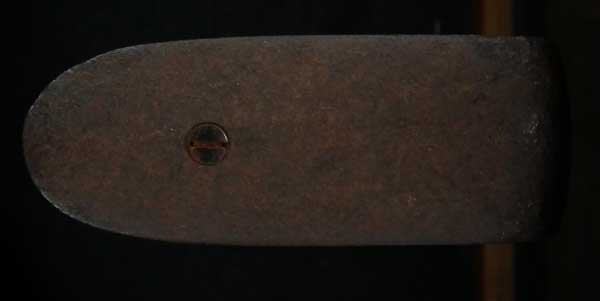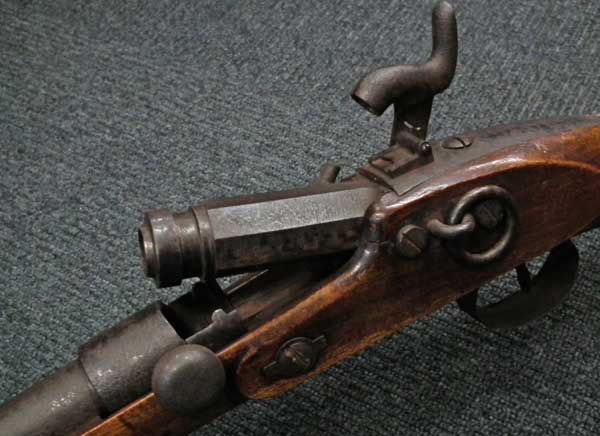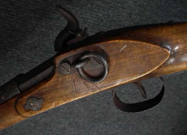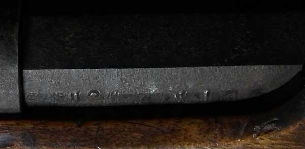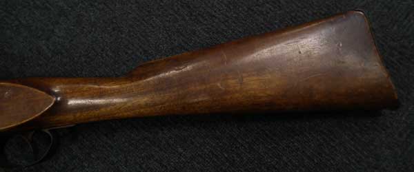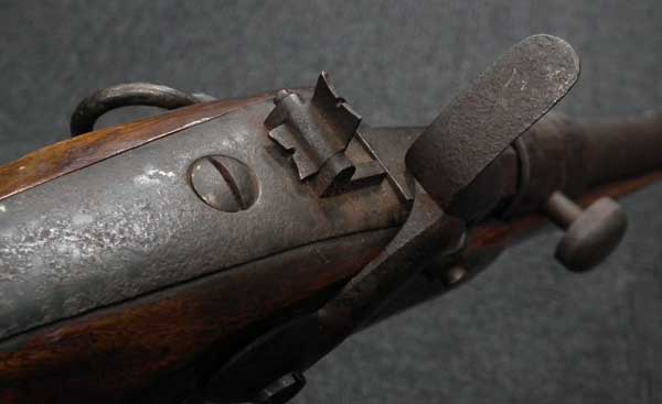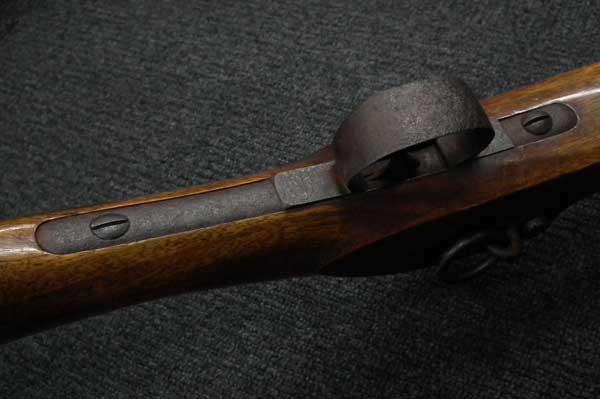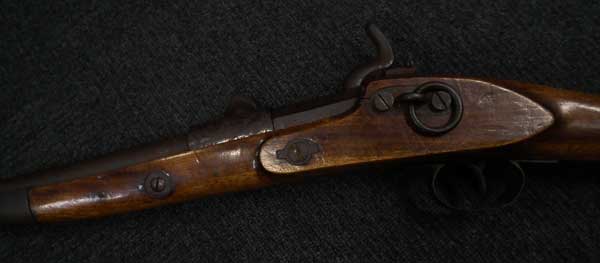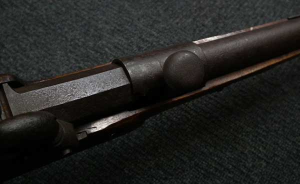 リンドナー カービン初期型は.58口径で全長38 3/4in.、騎兵が馬のサドルに銃を掛けるためのリング(サドル・リング)が本体左側に付いていましたが、後期型はトリガーガード後部にスリング・スイベルの形となって移動しました。 またリア・サイトも初期型は機関部とストックを留める上部タング上にあったのに対して、後期型はブリーチ・ブロックの前に移動しました。初期型には刻印が無く、後期型にはブリーチ・ブロックの上に「EDWARD LINDNERS PATENT/ MARCH 29, 1859」と刻印が入っています。 またサイド・プレートにも「S/AMOSKEAG MFG CO/MANCHESTER., N.H.」と刻印が入っています。 以上の違いから本品はリンドナー カービンの初期型になります(ブリーチ・ブロック上の刻印は確認出来ません)。