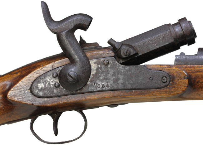 全体に渡って金属部のサビ、朽ち込みがございますが、現状は本状態で落ち着いています。サイド・ロックに1864の刻印が見られます。反対の左遊底側面に何らかの刻印が見られますが経年により判別ができかねます。