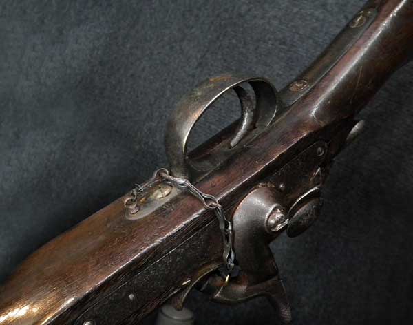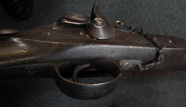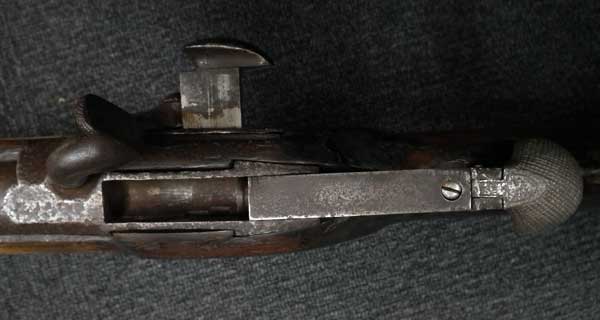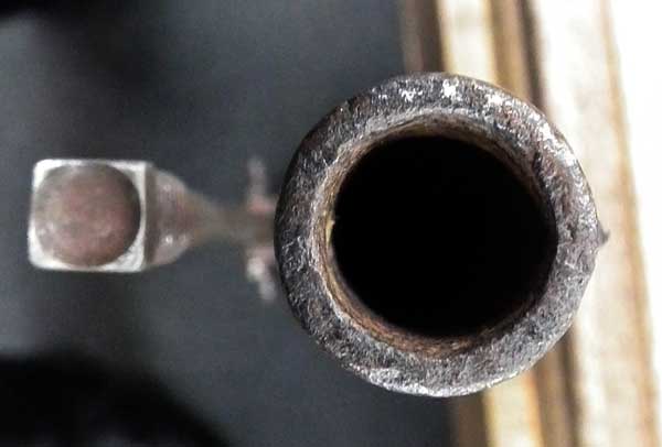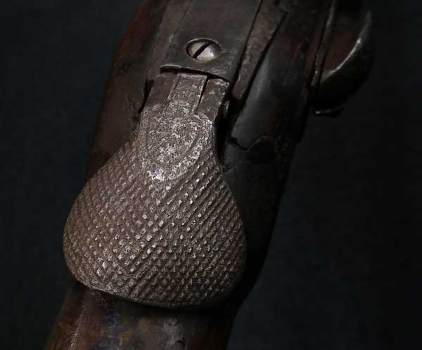 鉄部は錆、朽ち込みは全体に渡って有り、特に機関部前方の銃身上部は斑になっているためにやや目立ちます。 トリガーガードなどの真鍮部分は存外に状態が良く、表面の仕上げも残っており、僅かに角の金色に光る状態が良い感じです。バットプレートだけは斑に剥げが見られます。
