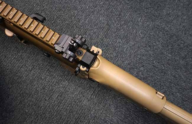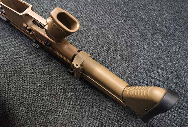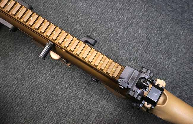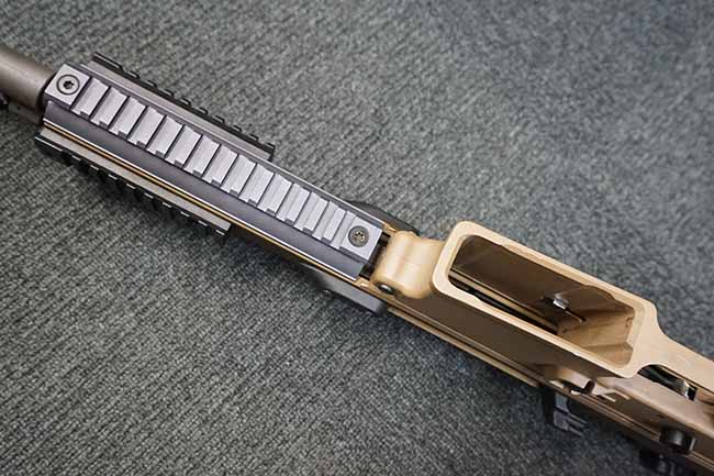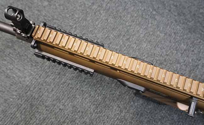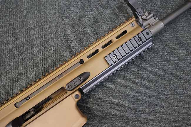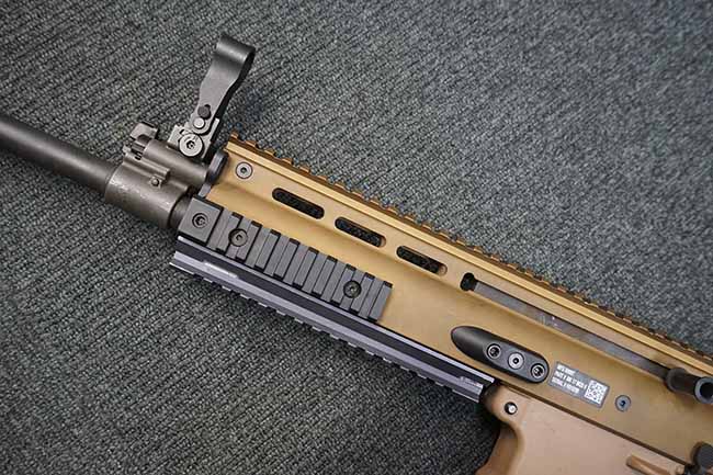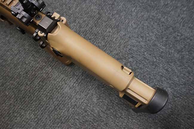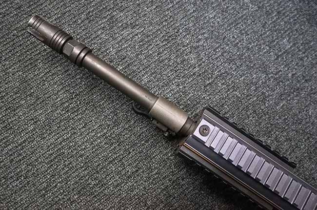 サプレッサーはFN社製のバードゲージ型で、GEMTECH社のサイレンサーを取り付ける突起が二箇所出ています。 アッパー・レシーバーの上にピカティニ・レールが装備されていますので、各種光学機器の装着が可能です。