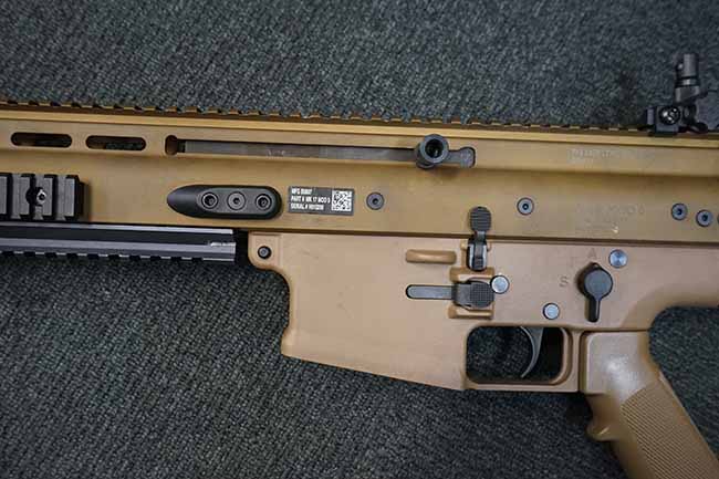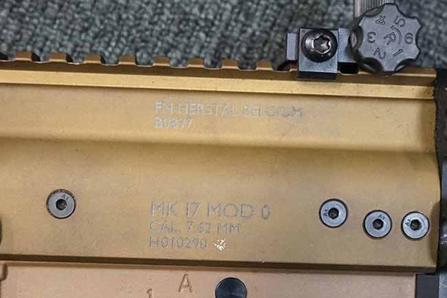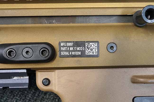SCAR-HはMK17 MOD 0として米軍に正式採用され、2009年に第75レンジャー連隊に600挺配備されました。 本品は米軍仕様のFN SCAR-H ショート・バレル・モデルです。 13インチ(330mm)のショート・バレルを装備します。 米軍モデル名、シリアル No.、そしてQRコードが小さなメタル・プレートに入っています。 更にバーコードとシリアルが入ったステッカーも貼ってあるのがユニークです。 Gen3と呼ばれる第三世代の品でM16型グリップ、6段階調節式のストック、樹脂製のロアレシーバーが装備されています。