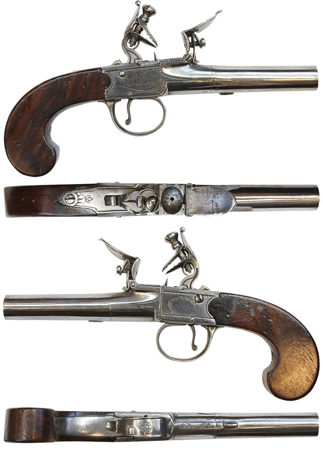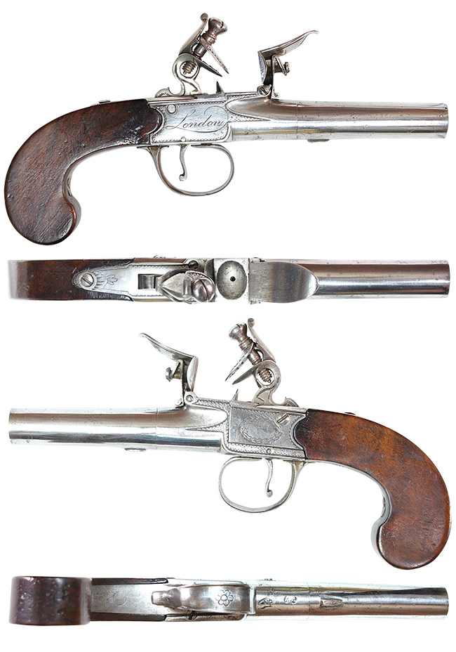 珍しいペア (一対の2挺セット) の英国で1790年頃に製造されたポケット・サイズのフリントロック シングル・ショット ピストル (火打式単発拳銃) です。 本体右側面にLONDONの刻印 (メーカー・ロゴのような感じ) があります。 反対側の左側面には、楕円形のリース (花輪模様) があり、通常はここにメーカー刻印が入ります。 93mmの全銃身長の内、63mmの銃身前方 (約2/3) がネジ込み式になって取外しが可能です。 その取外し可能な銃身の下部分にラグ (銃身の軸方向に長い細長い突起) があります。 ペア (2挺) の内一挺のみに本体と取り外せる銃身部分に「1」の数字が打たれています。 それはペアの銃身を間違えてもう一挺の銃に付けてしまわないための印です。 この回して取り外しができる銃身はTurn-off Barrel と呼ばれます。 これはフレームと銃身が一体型の場合は銃口からパッチと呼ばれる布切れと一緒に弾を押し込んで装弾しますが、Turn-off Barrel の場合は銃身を外し、薬室に直接装薬を入れて口径より大きな弾を乗せて銃身を取り付けて使用します。 それによって銃口からの装弾よりも大きな初活力 (Muzzle Energy) を得る事ができます。 本品はFlintlockと呼ばれる火打ち式銃砲ですが、特にこの形状の品を撃発機構が側面にあるSidelockに対してBoxlockと呼びます。 Boxlockはハンマーを含む撃発機構が箱型の本体 (フレーム) の中に収まっており、本品のような小型の拳銃に取り入れられました。 ハンマーが本体の中央にくるのでセンター・ハンマーとも呼ばれます。 18世紀末頃から19世紀中頃まで流行したデザインです。