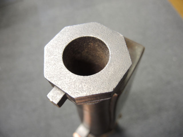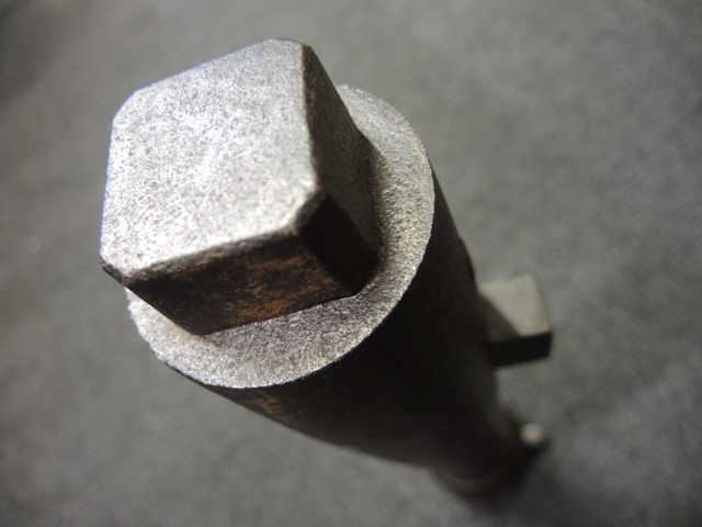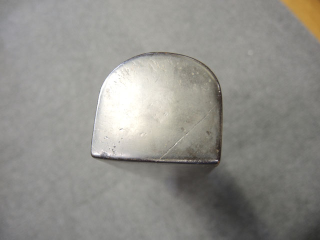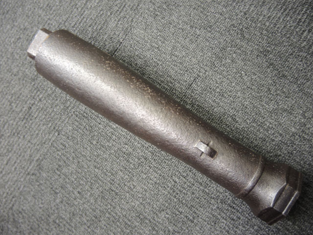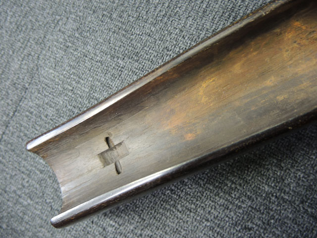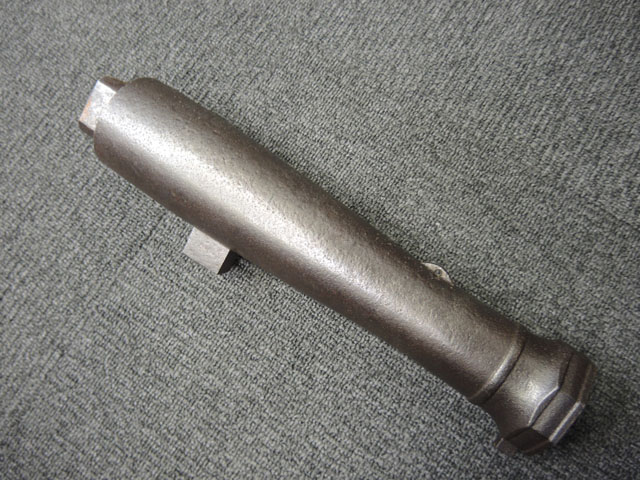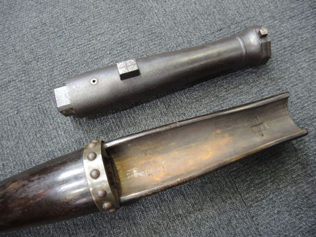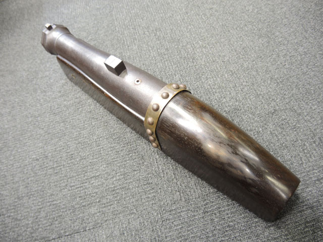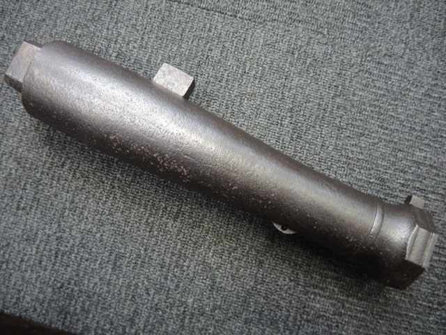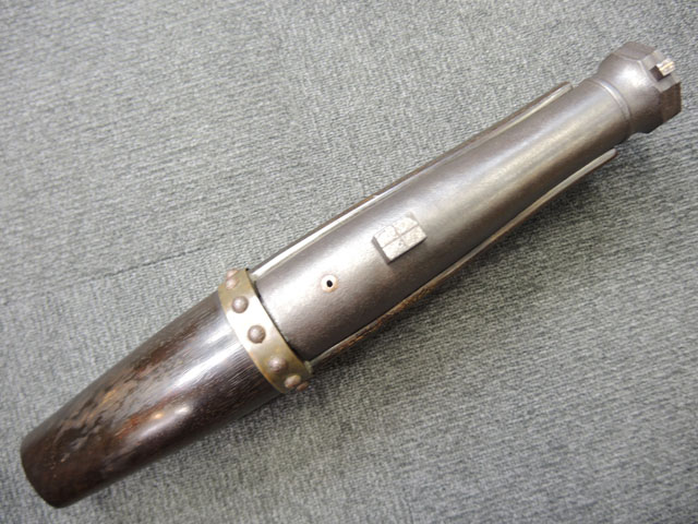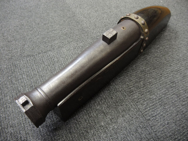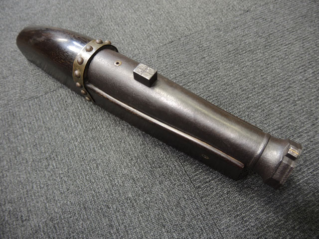 棒火矢筒は日本独特の火器で、口径が20mm~40mmの五十目筒、百目筒に相当するものが主流となっています。 棒火矢筒には大砲のように銃身 (砲身) 後方上部に火穴 (火口) があり、そこに直接火種を付ける「指火式点火法」になっています。 砲身の長さについても、10cm程度のものから大火矢筒 (または大棒火矢筒) と呼ばれる30cm近くある品も存在します。 本品の口径は30mmで、砲身長は約280mmとなっています。 本品の砲身形状は円筒形で、後方に向かって緩やかに広がった形状となっており、最小径45mm、最大径60mm程度となっています。 砲口部には八角柑子が設けられており、見栄えの良い作りとなっています。 棒火矢筒は弾丸を発射するものではなく、棒火矢を発射するもので、これらは実戦で使用された品ではなく、江戸時代の「天下泰平時代」に砲術家が生活の糧を得るために、棒火矢を飛ばして見世物にしていたと言われています。 これは確かな確証があるわけではありませんが、火矢筒が実戦に使われた記録も無く、更に固定された台座から的を定めるような構造にもなっていない事によるものと思われます。 本品についてもたんけん形の先目当と筋割の元目当は取り付けられているものの、台座は固定となっています。 萩野流の自由台を使用した狙いを定めることができる品も存在しましたが、あくまでも砲術家の客寄せ的な余技の道具であったと言われています。 (MM)(KK)