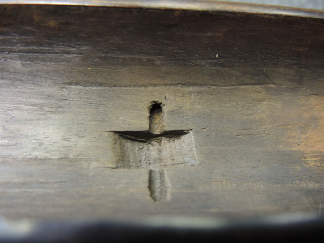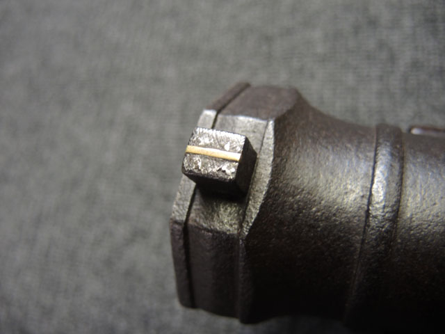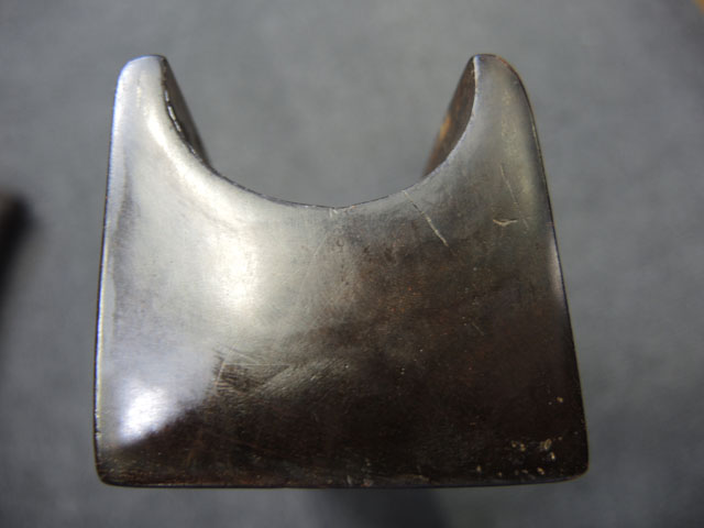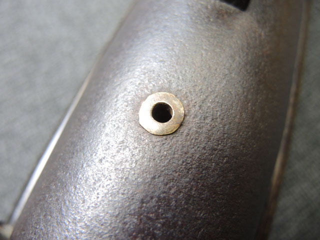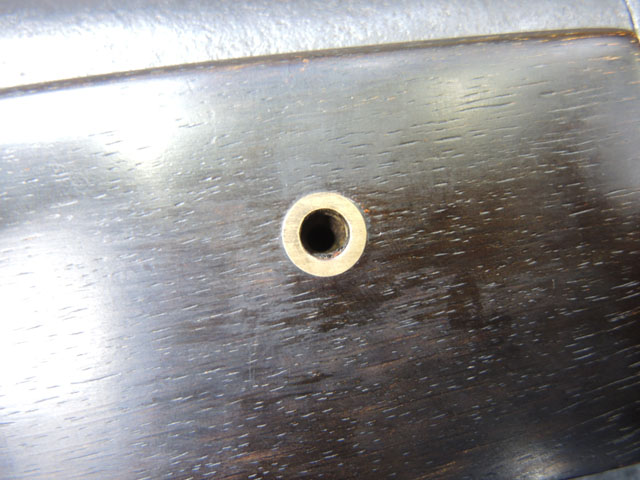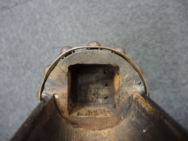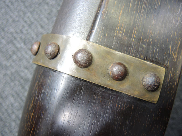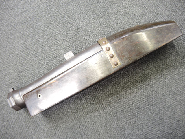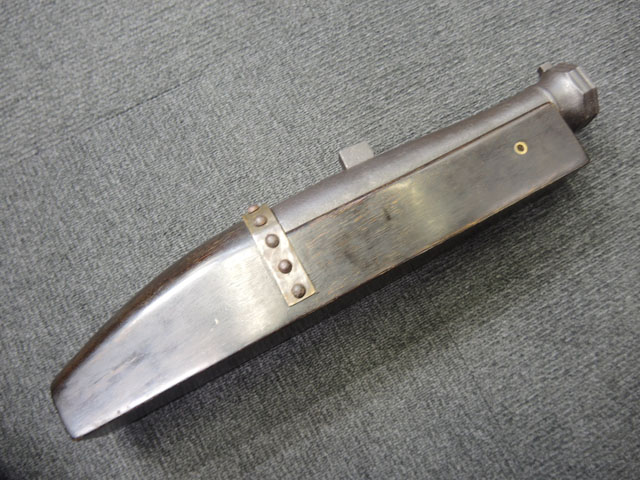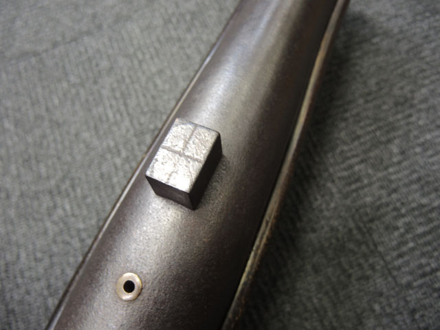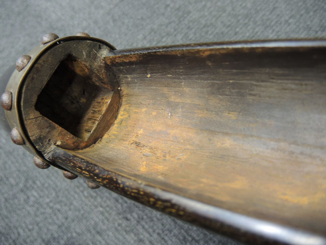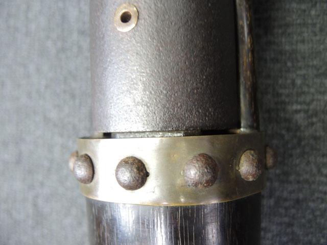 本品の身は黒錆に覆われていますが、これは当時の日本における防錆方法であった錆付けによるもので、欧米のようにブルー仕上げがなかった日本では一般的なものでした。 鉄部は若干の表面錆痕を除いて目立った欠損等は見受けられず、総じて良好な状態が保たれています。 火穴の部分は真鍮製の縁取りがされています。 たんけん形の先目当はサイト・ブレードに相当する照準線に沿った突起部分が真鍮製になっています。 また、先目当と元目当上面には銀と思われる金属が象嵌のような方法で薄く張られています。 台座は元々やや黒みがかった色合いの木製で、若干の打ち傷や擦れ等は散見されるものの、大きな欠損等は見られず、こちらも概ね良好な状態が保たれています。 台座後部及び砲身取り付け部後方の木部に若干のひびが見られますが、いずれも強度的には影響の無いレベルのものです。 台座下面にやや目立つ打ち傷や線傷が見受けられますが、通常展示する際には見えない部分ですので、あまり気になりません。 目釘穴は一か所で、砲身下部の目釘金具と台座の目釘穴の位置は一致しており、目釘穴には砲身の火穴と同じような真鍮製の縁取りがされています。 尚、目釘は付属致しません。 台座の砲身後部にあたる部分には装飾用の真鍮板が取り付けられており、鉄製の丸頭鋲で固定されています。 台座の時代は江戸末期頃ではないでしょうか。 砲身内は砲口から砲身後部まで抜けて (通って) おり、火穴も抜けています。 尚、尾栓は現状固着しており取り外しは出来なくなっています。