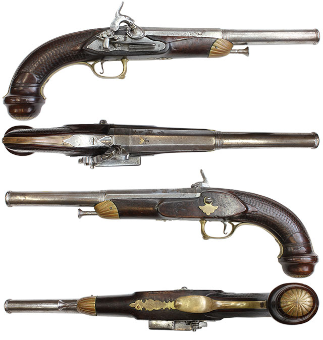本品のサイド・プレートを含む全ての金属パーツは白磨き鉄製で、美しい品です。 ミュクレット式パーカッション・ロックは機構的に古いシステムで他のシンプルなパーカッション式に比べると滑らかさには欠きますが、引金を引くとハンマーは落ちます。 フル・コック、ハーフ・コックともに正常にコックされます。 銃身の薬室上部にあたる部分にスペインらしい、真鍮象嵌 (何のデザインかは不明) とキリシタン・クロスが入っています。 これはスペインのこの時代の銃に見られる特徴です。 サイドプレート撃発機構の下側に「GP」と刻印があります。 木部の先端 (ラム・ロッドが入る部分)、グリップの下方まで伸びたトリガーガード、グリップ後方のバック・ストラップ、グリップ底部にあるグリップ・キャップは真鍮製でどれも相応しい時代色が付いています。 木部は一か所を除いては完全で、艶のある程度の良い品です。 また木部のグリップ部、左右に浅いですが、鱗状の模様が彫られています。 木製ストックの左側上部 (火皿前方部分) の一部が割れており、その部分が分離しています。 飾っておく分には、その部分は取れ落ちないので特に補修等はしておりません。 木製接着剤などでの修理は可能と思われます。 この部分の難があるため、お値打ち価格に設定してありますが、国内に入っている古式銃の中ではとても珍しい品です。 各種の撃発機構の違いのバリエーションを集める上では欠かせないモデルです。 オリジナルの鉄製ラム・ロッドが付属致します。 (MM)