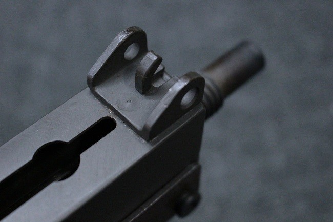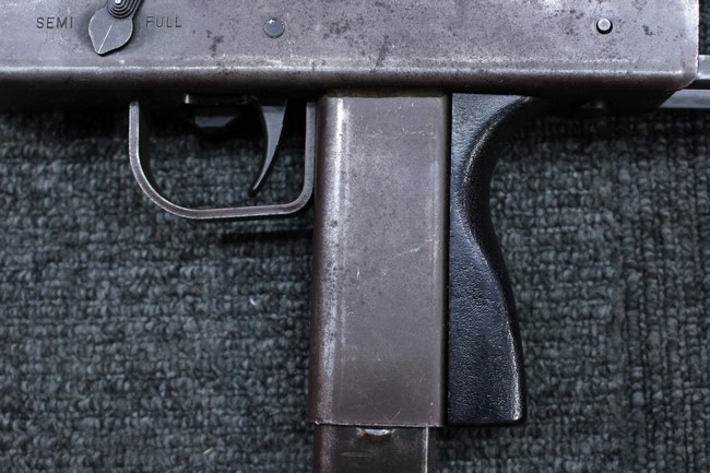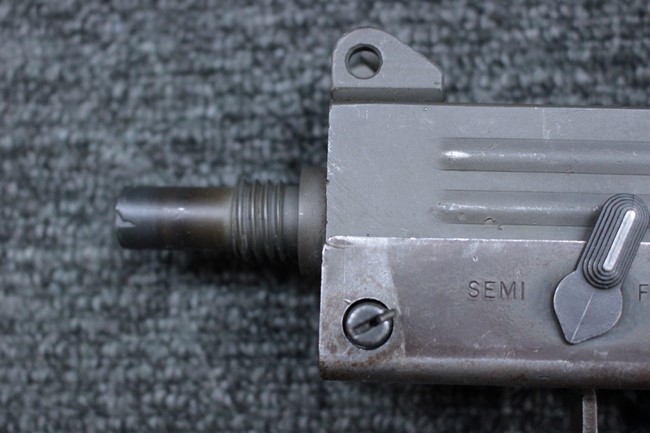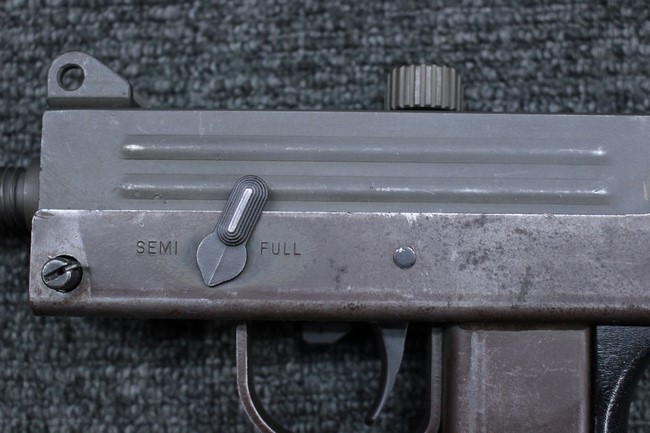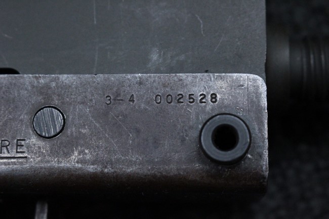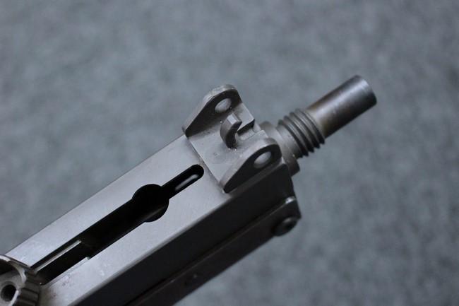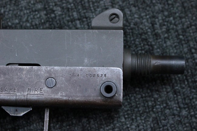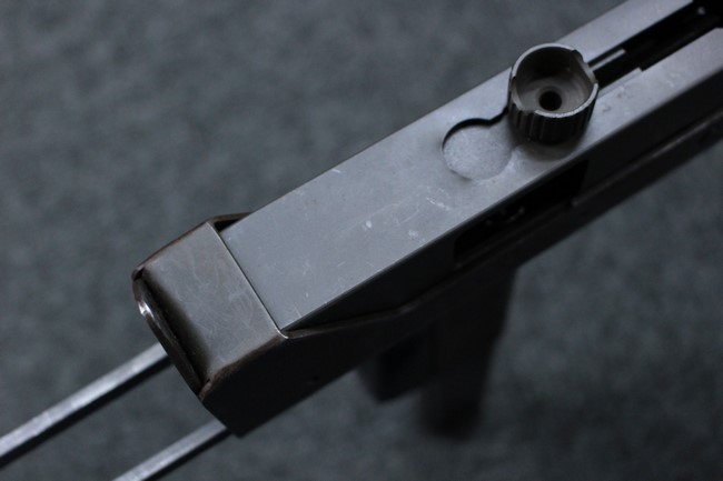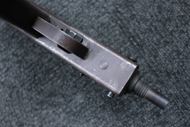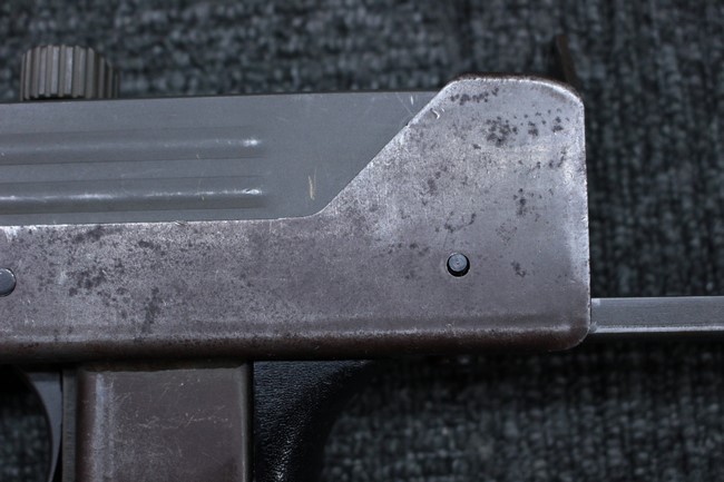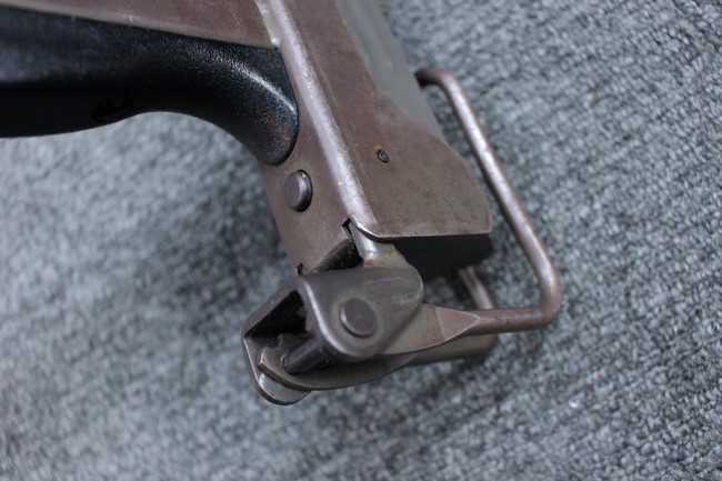本品はアッパー・レシーバーは英国でMAC10/MAC11を生産していたS.F.Firearms社製で、ほぼ未使用のグレー・パーカー仕上げになっています。 若干の小傷はありますが仕上げがはっきりと残っており、充分に良い状態と言えます。 また銃身側に付いているハンド・ストラップ、及びその金具は付属しておりません。 これはS.F.Firearms社製であるためかと思われます。 一方ロア・レシーバーは軍で使用されたパーカー仕上げが使い込まれた感じになっています。 全体的に赤っぽく退色しており、小傷が散見されます。 それに伴う表面錆の跡も見受けられますが、朽ち込みには至っておらずあくまで表面的なものです。 伸縮式のワイヤー・ストックは小気味良く動作し、ロックもしっかりと掛かります。 セレクターは少々スプリングのテンションが甘くなっていますが、クリック感が残っています。 セーフティはトリガーとの連動は有りませんがはっきりとしたテンションが残っています。 本品にはアッパー・レシーバーとローアー・レシーバーを固定するピンはGew.3タイプの品で代用してあります。そのため僅かに前後に遊びがあります。