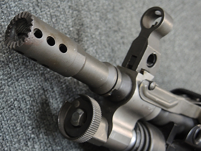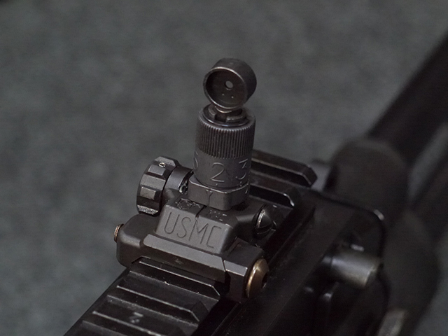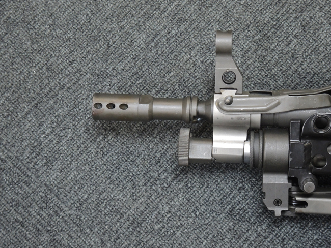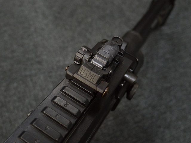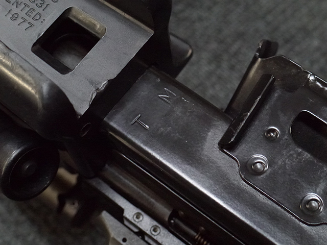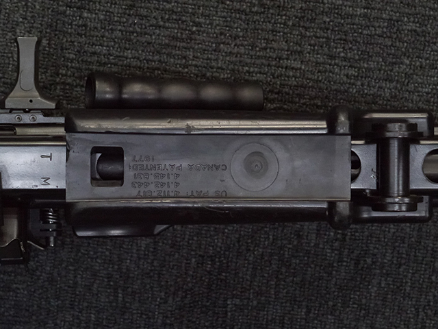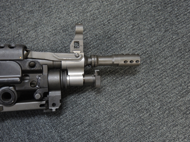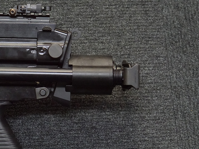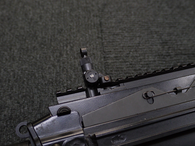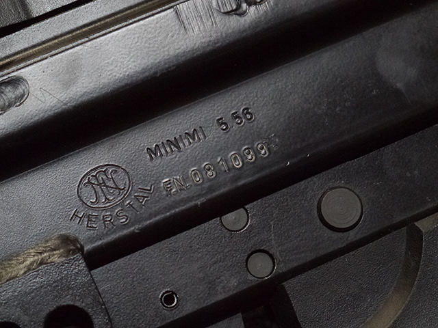本品のシリアルNo.は081099で、レシーバー左側面にはシリアルNo.の他、FN社のロゴや「MINIMI 5.56」のモデル名刻印が入っています。 弊社はベルギーのFN社と長年の交渉の末、FN F2000、FN P90、FN MINIMI、FN SCARとFN社製の軍用銃の仕入れに成功し、本品もその中の一挺です。 これらは将来的に引き続き入荷するのは困難な品となっております。 本品には米軍のM249タイプのハンドガード及びヒート・シールドが装備されています。 リア・サイトはナイツ・アーマメント社 (KAC) 製の600mまで対応した折り畳み式バックアップ・サイトが付属致します。