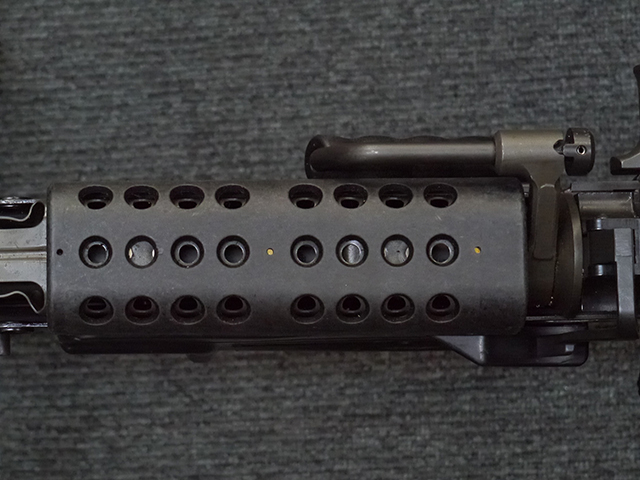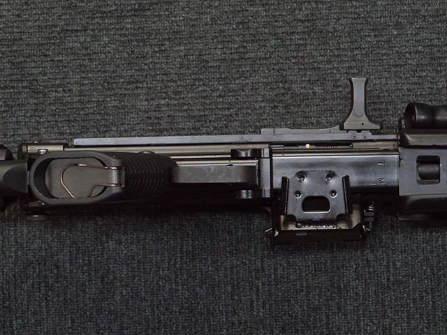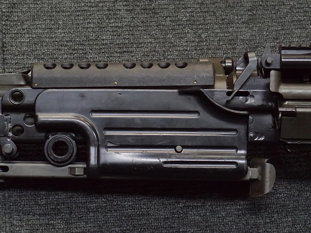 本品は全体に使用感は少なく、金属部は若干の保管に伴う小傷や擦れは見られるものの、大きな破損や欠損等は見られず、良好な状態が保たれています。 グリップやストック部についても同様に若干の打ち傷や擦れの他は大きな難点は見られません。 グリップ下部のコンパートメントの蓋の開閉についても問題なく行う事が可能です。 樹脂製ハンドガードは金属部に比べてやや使用感が見受けられ、打ち傷や擦れが見られますが、こちらも大きな破損や欠損等は見受けられず、しっかりとした状態が保たれています。 ストックの伸縮やフィード・カバーの開閉については問題なく行う事が可能です。 また、マガジン給弾部には別売りのSTANAGタイプのマガジンの装着も可能です。 本品はM249タイプのハンドガードとヒート・シールドが付いて価格据え置きのお値打ちな品です。