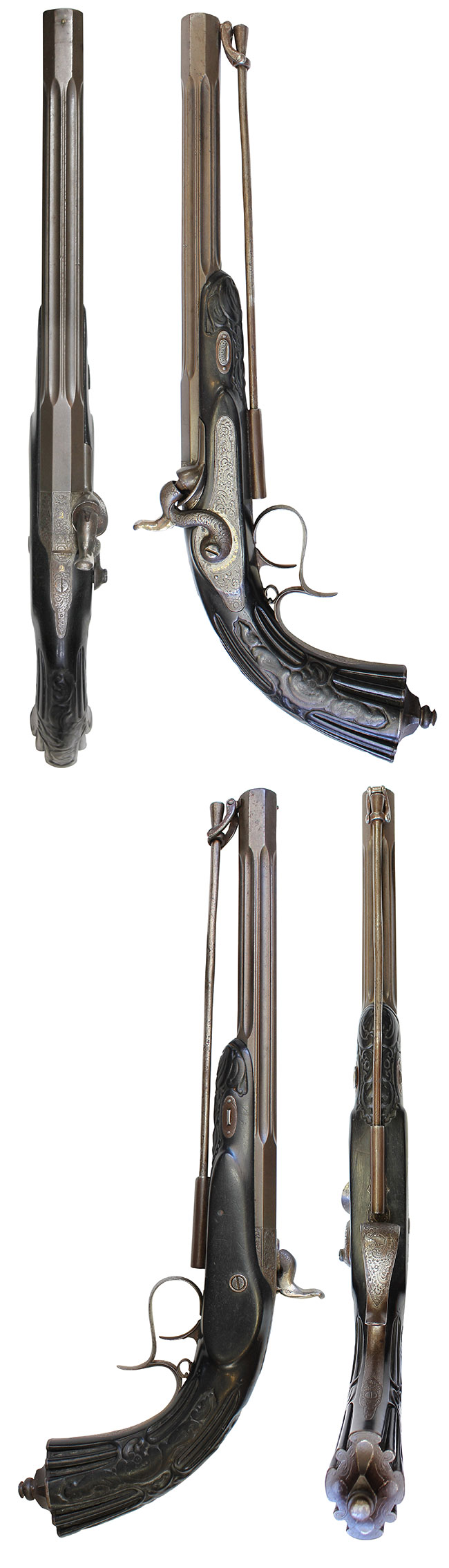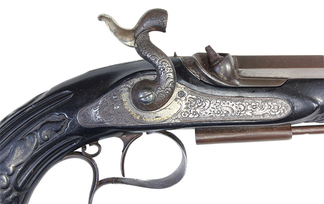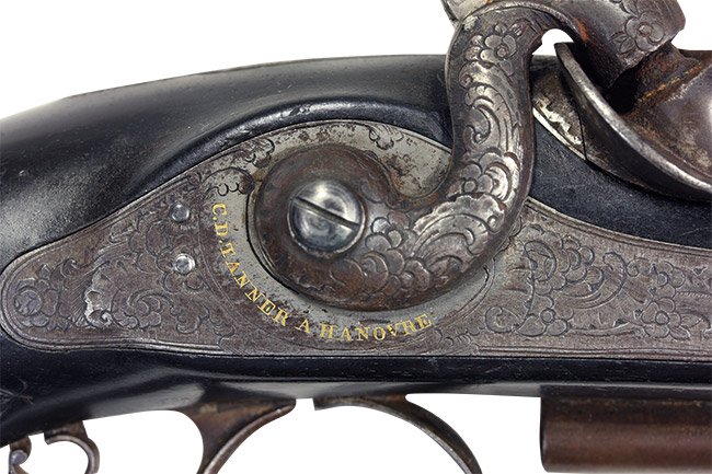 本品は銃に刻まれたC.D.Tannerの会社名から1858年以前の作品で、1840年代の同社の特徴的な形状をしています。特に深くライフリングが刻まれた重厚なオクタゴン銃身の各面(八面)に見事なグルーブ(溝)が彫られた手の凝った作りは1840年代の同社の作品の特徴です。サイドロックを始め各金属部品には緻密な唐草模様彫刻が施されており、銃身上面後部とそのすぐ後ろにあるタング部分には当時の所有者のイニシャルと思われる「L」のモノグラムが金象嵌で入っています。またサイドプレートのハンマー軸後部にはフランス語で「C.D.TANNER A HANOVER」の金象嵌文字が入っていることからフランス貴族の為に造られた品ではないでしょうか。木部はピアノの黒鍵にも使われる上質で硬い素材である漆黒(黒っぽい)色の黒檀(Ebony)で出来ており、特徴的な多くの滑り止め溝がグリップ部分に縦に彫られています。金属部全体的にC.D.Tanner社が得意とする緻密と言う言葉が相応しい見事な唐草模様が彫られています。