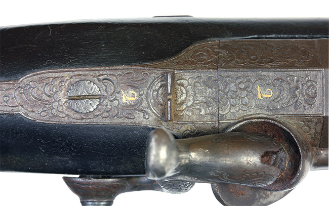 本銃の特徴的な銃身部のグローブはわずかな小キズこそあれ、はっきりと形を残しています。 銃口内は独特のライフリングはしっかり見ることができます。 金属部のサイドプレート、トリガー・ガードにあるエングレーブはしっかり残っており、2箇所の「L」のモノグラムやフランス語で「C.D.TANNER A HANOVER」の金象嵌の文字も、現在でもはっきりした金色として見ることできます。 フランス第二帝政時代の貴族が元の所有者だった可能性もあります。 可動式のラム・ロッドは現状で特に問題無く動きます。 ただ収納時の固定はあまくグラつきます。 木部は黒檀系の素材の元々の固さから、現在でもしっかりとしています。 また木部の最前部と、グリップ左右と後方にある唐草模様の彫刻も形を維持しており、特にグリップの左右それぞれに唐草模様を取り囲むように8本ずつ彫られた2mmから4mmの幅の溝は深々とくっきり残っています。 見た目としても、構えた際の感触としても楽しむことができます。 銃身の下(ストックで隠れている部分)にプルーフ刻印とナンバー(119)が入っています。