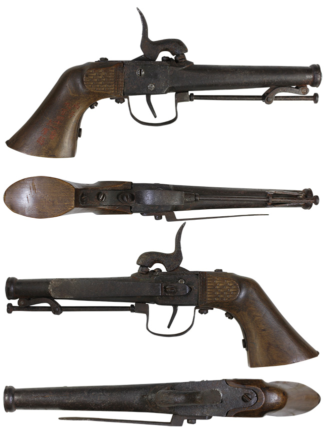 本品は幕末に日本国内で製造された登録証付きの管打ち式古式銃です。 グリップが木製以外、他は全鉄製で撃鉄が引き金の真上に付いた「センター・ハンマー式」です。