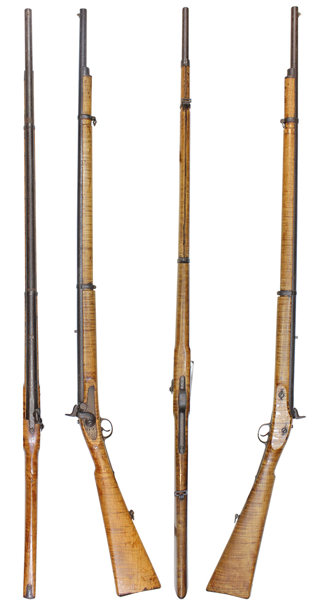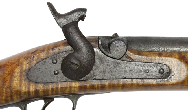 木製銃床は美しい虎目の模様が入った日本ではあまり見かけない明るい材質です。 銃身を含む鉄部全体に時代錆が付いています。 作動は完全で、ハンマーを起こすとフル・コックの位置で止まり、トリガーを引くとスムーズにハンマーが落ちます。 火口から銃口は詰まり無く抜けています。 さく杖 (ラム・ロッド) は付属致しません。 (MM)
