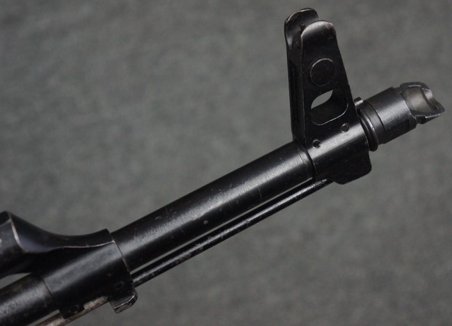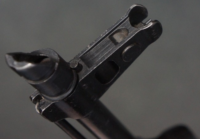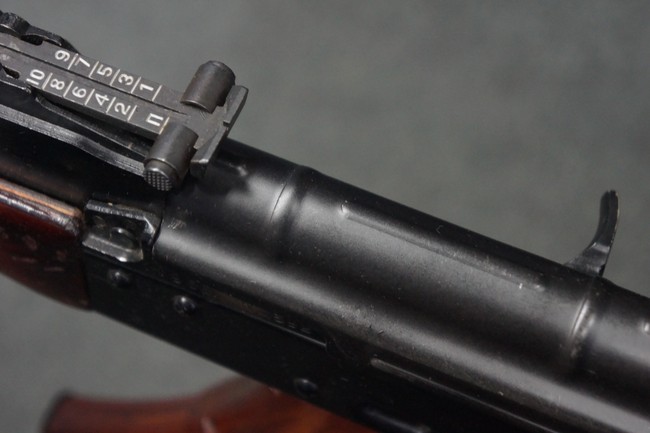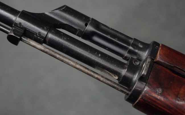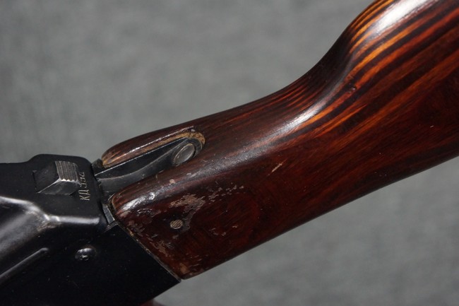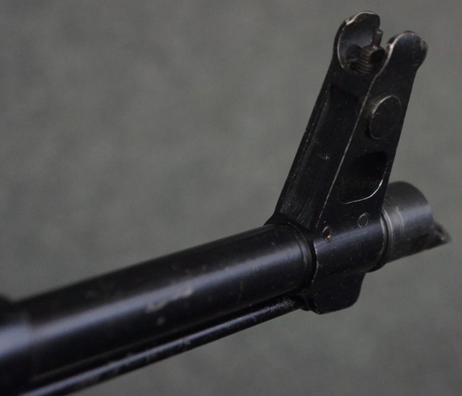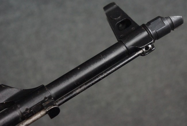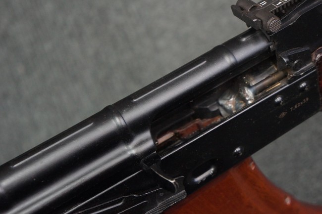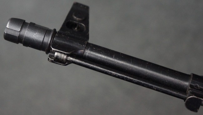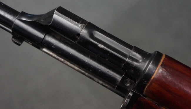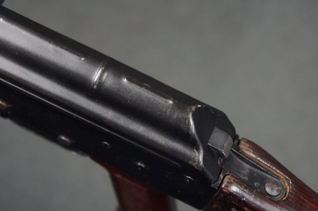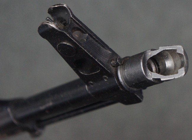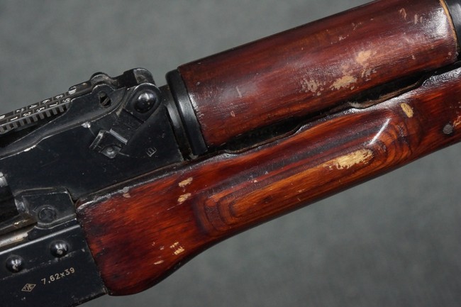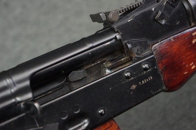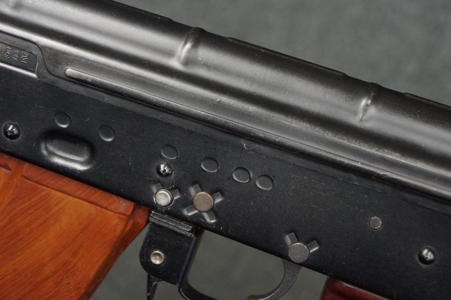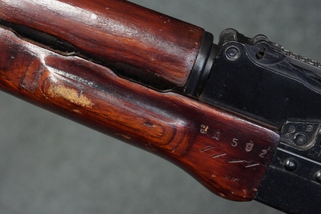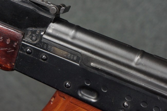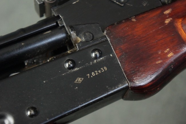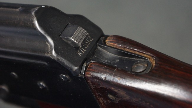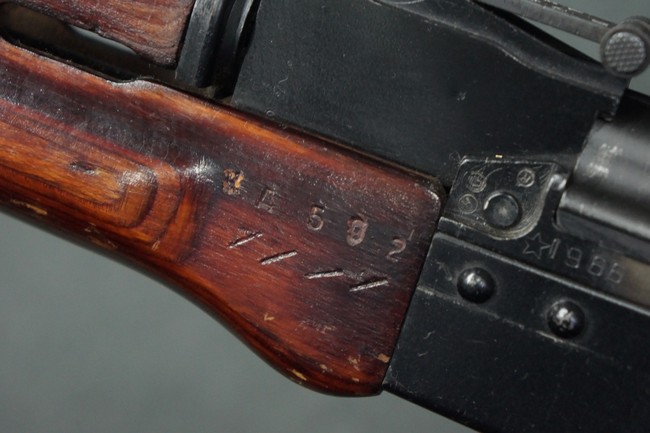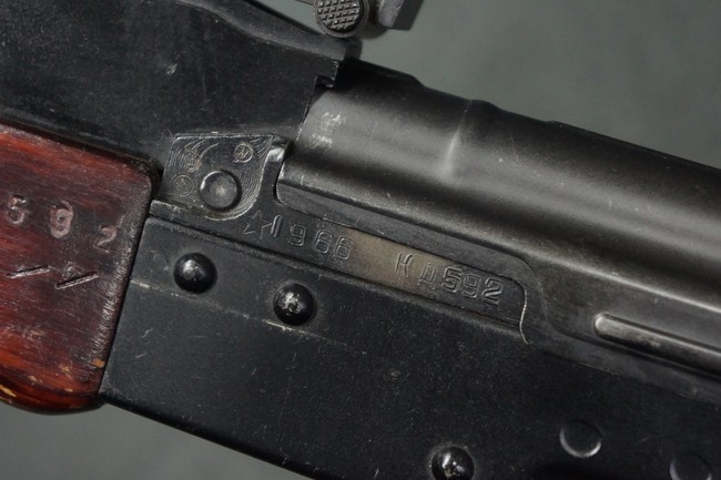 本品はロシア製オリジナルのAKM自動小銃で、機関部左側面にはシリアルNo.592の他、ツーラ造兵廠製を示す星のマークや1966の製造年刻印が入っています。 AKMは製造時期によって各部の仕様が異なり、1960年代半ば頃から生産された中期以降の生産品では、グリップが樹脂製となり、フロント・サイト・ベースの前後面に窪みが追加されました。 スリング・スイベルは前期型と同様にバット・ストック下部に設けられています。 本品のシリアルNo.は、レシーバー、レシーバー・カバー、ロア・ハンドガード、ボルト・キャリア、リコイル・スプリング・ガイドが592でマッチしています。 尚、本品のレシーバー前部右側面には「7,62×39」の刻印が見られます。