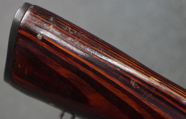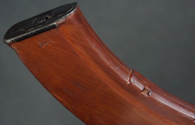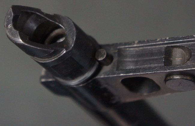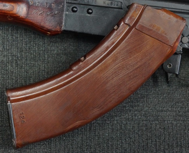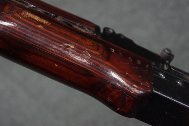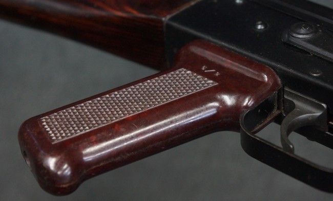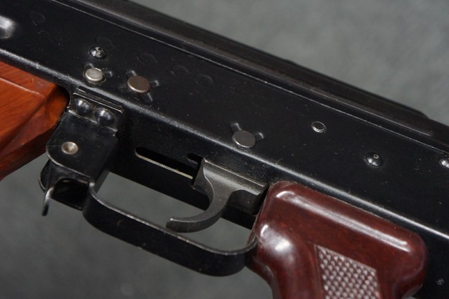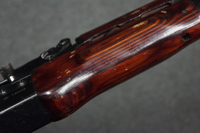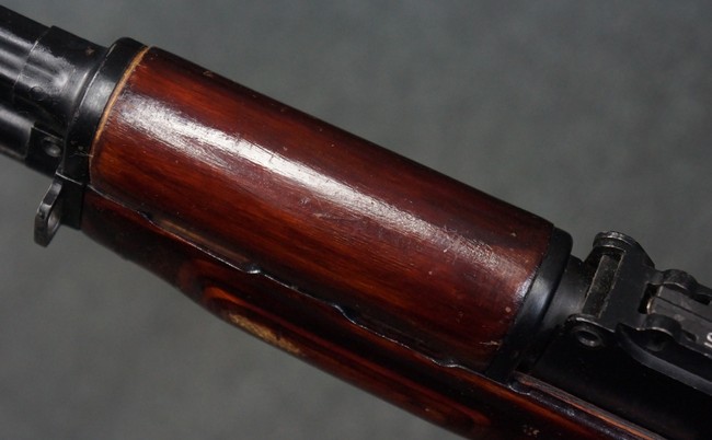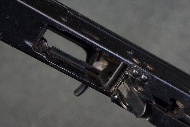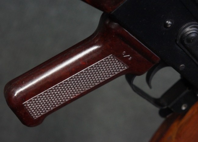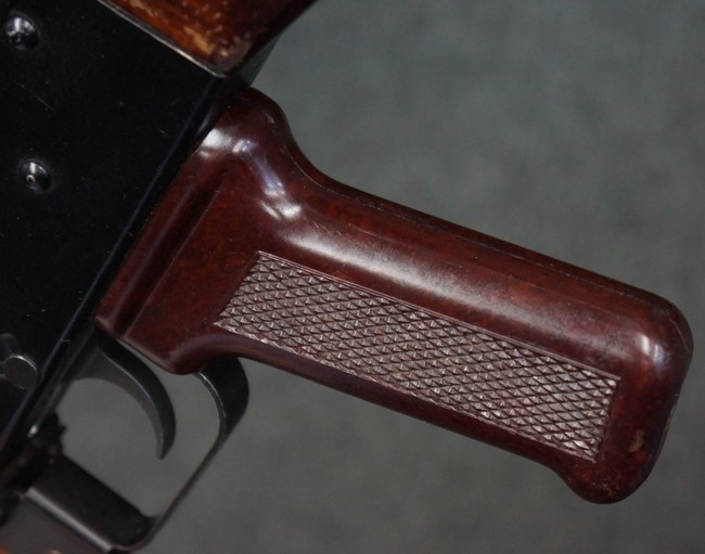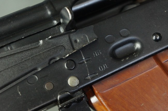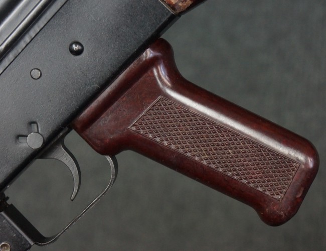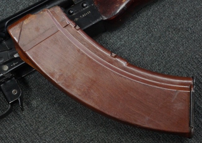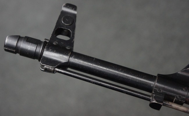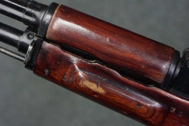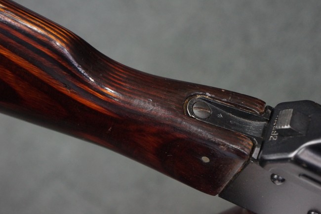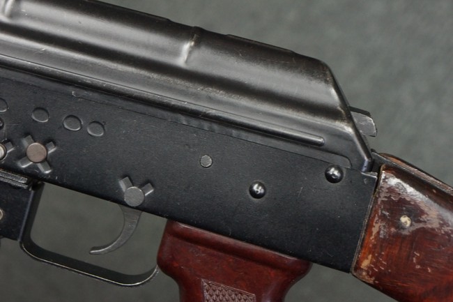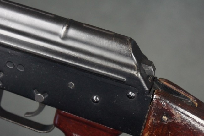 本品はロシア製オリジナルのAKM自動小銃で、機関部左側面にはシリアルNo.592の他、ツーラ造兵廠製を示す星のマークや1966の製造年刻印が入っています。 AKMは製造時期によって各部の仕様が異なり、1960年代半ば頃から生産された中期以降の生産品では、グリップが樹脂製となり、フロント・サイト・ベースの前後面に窪みが追加されました。 スリング・スイベルは前期型と同様にバット・ストック下部に設けられています。 本品のシリアルNo.は、レシーバー、レシーバー・カバー、ロア・ハンドガード、ボルト・キャリア、リコイル・スプリング・ガイドが592でマッチしています。 尚、本品のレシーバー前部右側面には「7,62×39」の刻印が見られます。