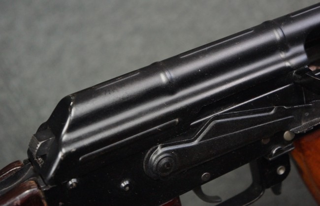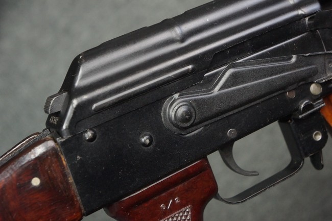 基本的な構造はAK-47自動小銃と同一ですが、大きな特徴としてレシーバーが削り出しによる製造からプレス製へと変更になり、生産性の向上と軽量化を実現しました。 また、ハンドガードやバット・ストックはAK-47では単材であったのに対し、AKMではラミネート製へと変更されました。 フル・オートマチック射撃時の制御を容易にする為、バット・ストックの形状も直銃床型へと変更された他、銃口部には斜めに切り落とされた形状のマズル・ブレーキが追加されたのも特徴です。 さらにトリガー機構にはボルトが完全に閉鎖するまでハンマー・リリースのタイミングを遅延させるための部品が組み込まれているのも特徴です。 尚、リア・サイトの最大射程はAK-47では800mまでとなっていましたが、AKMでは1,000mまで延長されています。 マガジン・ウェル上方のレシーバー両側面には本体強度を向上させるための窪みが設けられており、これらの窪みはマガジンを正常な位置に固定する機能も果たしています。