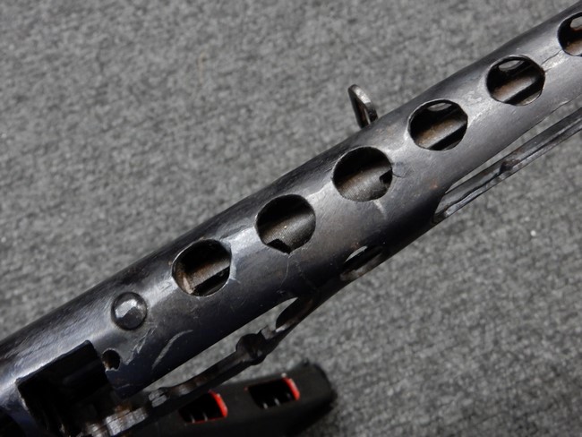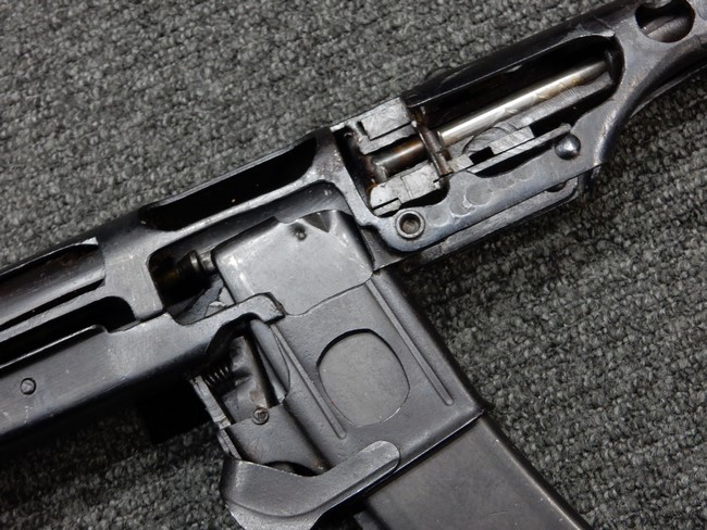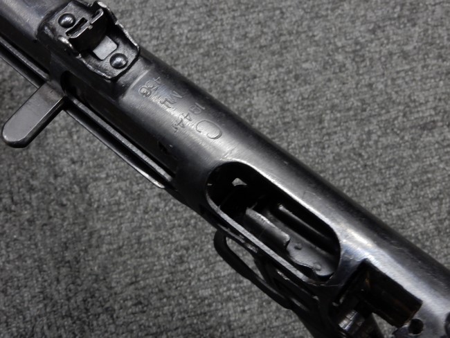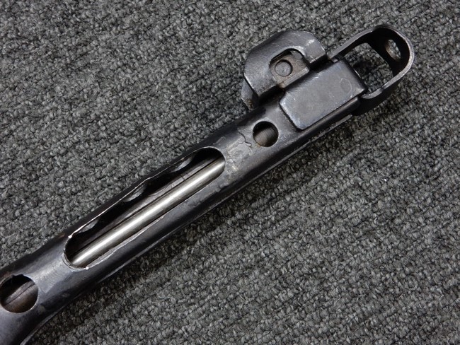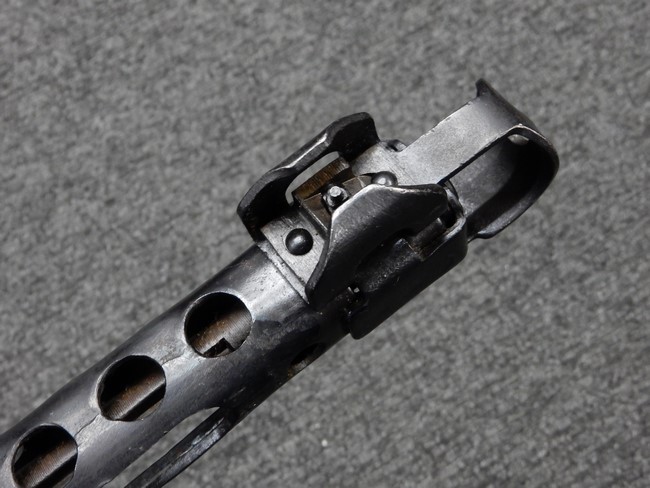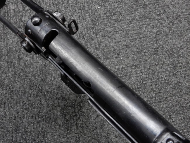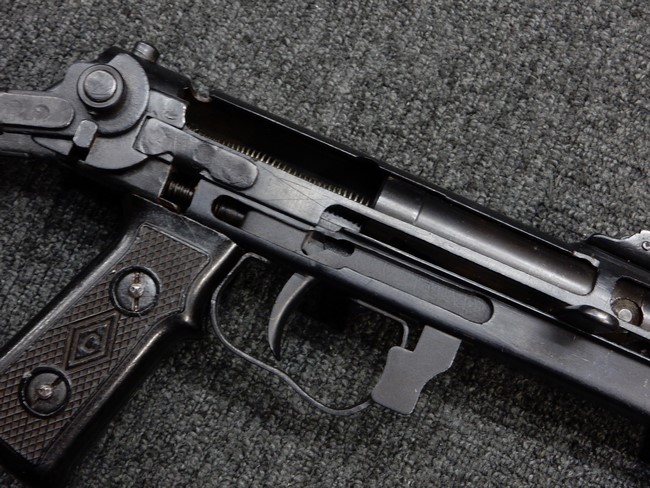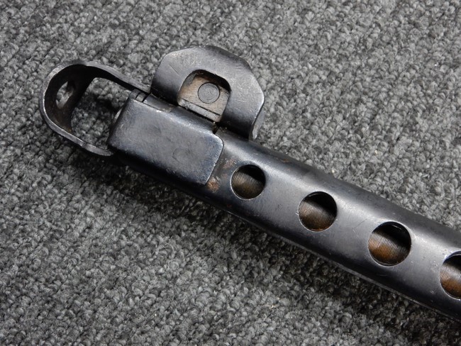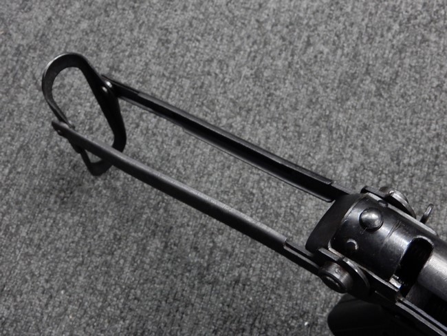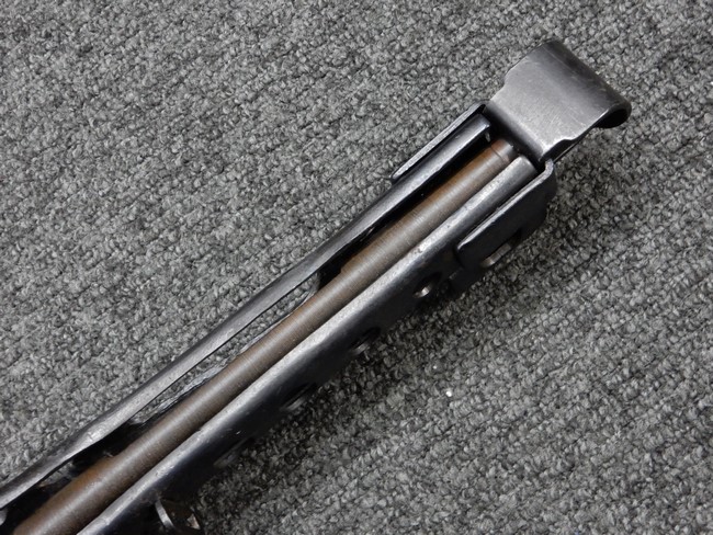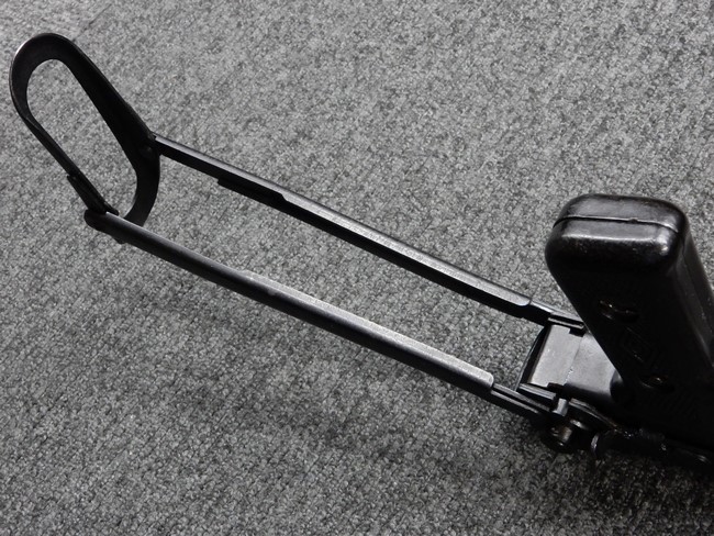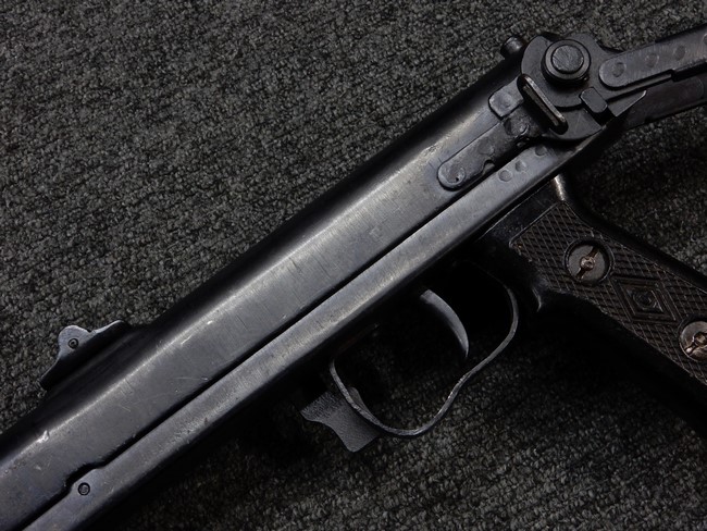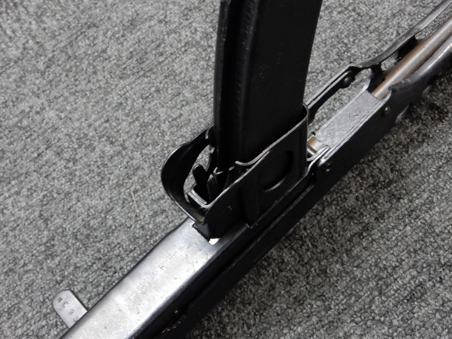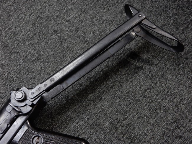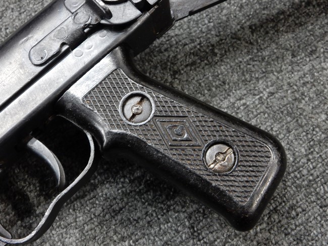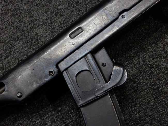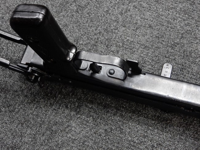 機関部右側面にカット箇所が集中しており、カット面にペイントなどはありません。 マガジンのみ前面2ヶ所がカットされ赤いペイントで縁取りされています。 銃本体は戦時生産のためか全体的にツールマークの残る粗い仕上げの表面ですが、目立つ傷や錆はありません。 バレルジャケット上に一ヶ所のみ細かな亀裂がありますが、構造上、これ以上広がる事は無く、強度的にも問題ありません。 ストックは初期型が装着されています。展開収納の作動は固すぎず柔らか過ぎずで程よいタイトさで、ストック自体に歪みもありません。 樹脂製グリップも細かな擦り傷はあるものの、破損の無い良好な物が付属します。トリガーガードはトリガー前方で拡がった他に見られない独特な形状の物が装着されています。