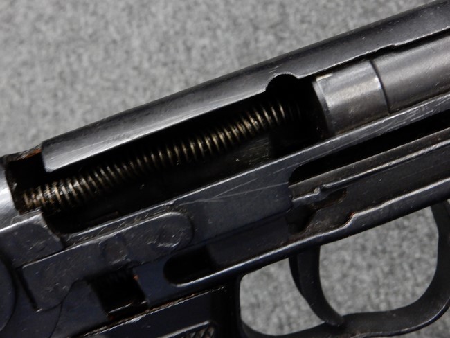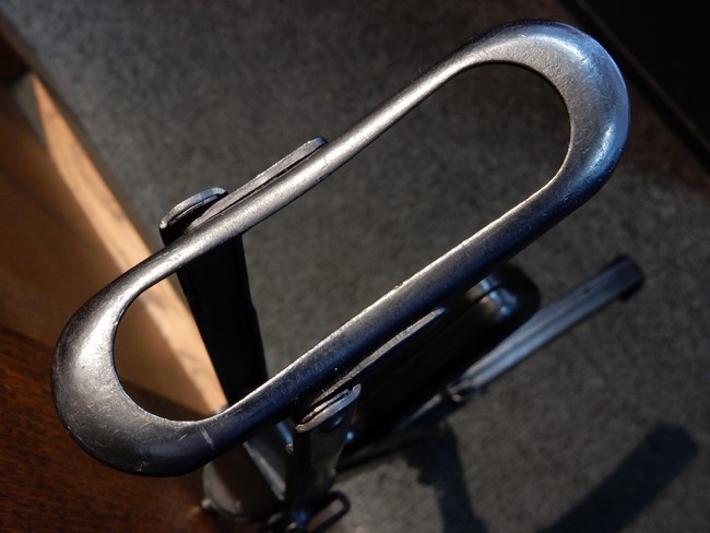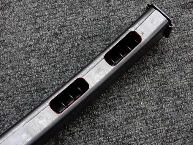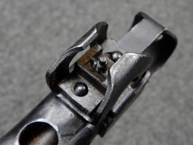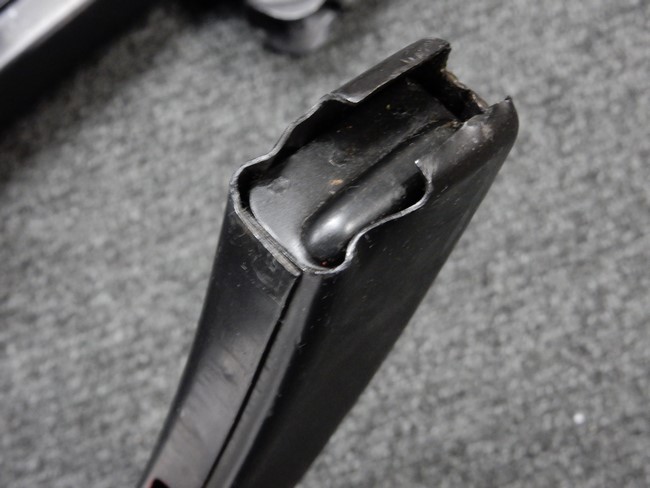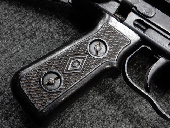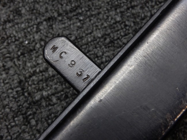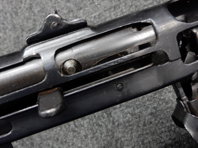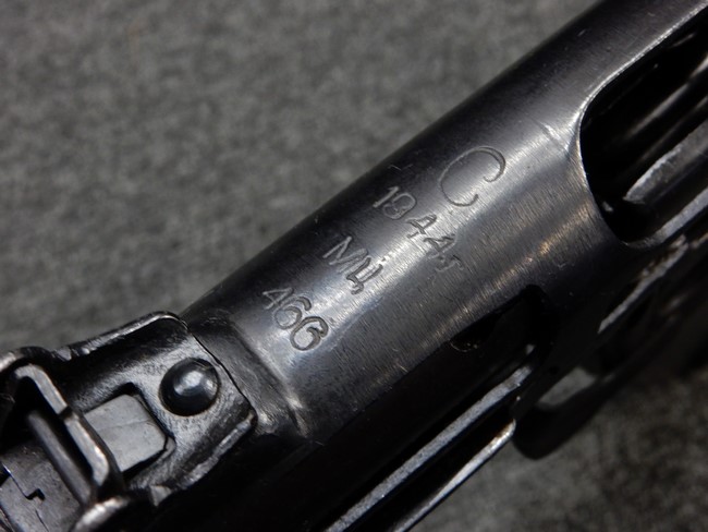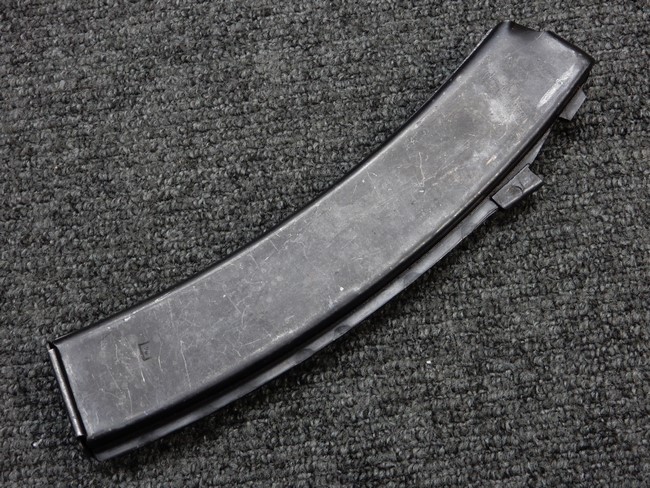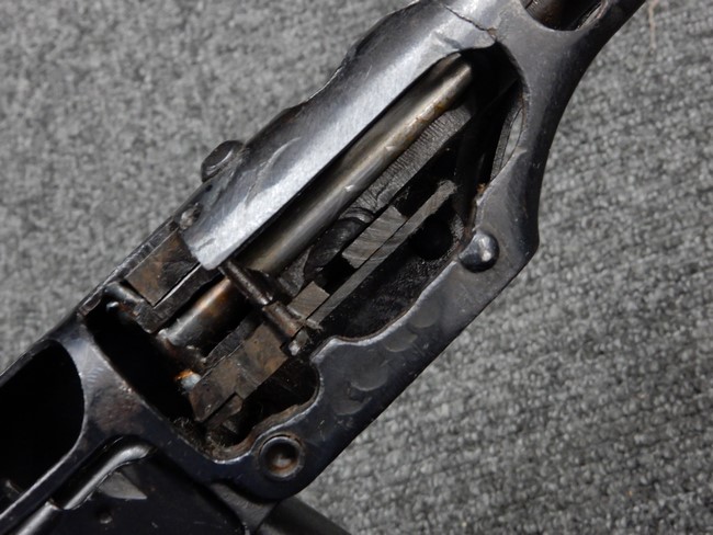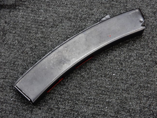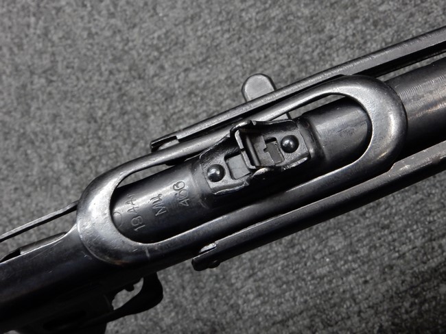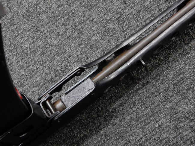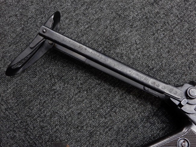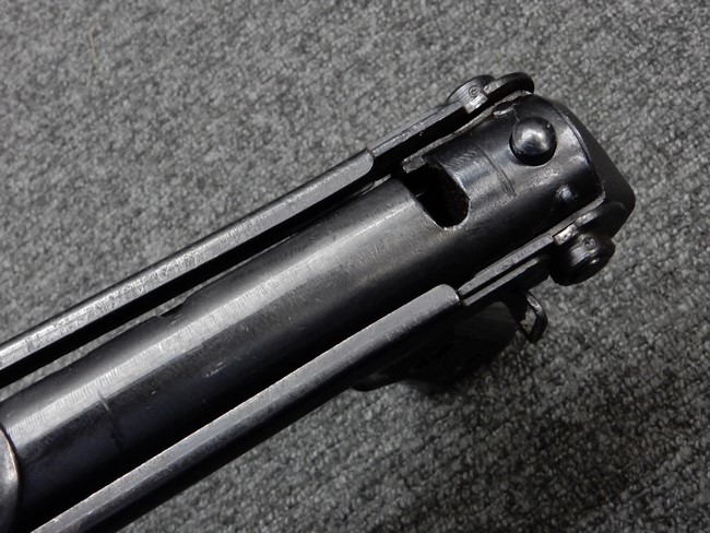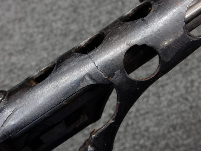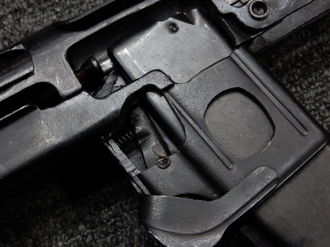機関部右側面にカット箇所が集中しており、カット面にペイントなどはありません。 マガジンのみ前面2ヶ所がカットされ赤いペイントで縁取りされています。 銃本体は戦時生産のためか全体的にツールマークの残る粗い仕上げの表面ですが、目立つ傷や錆はありません。 バレルジャケット上に一ヶ所のみ細かな亀裂がありますが、構造上、これ以上広がる事は無く、強度的にも問題ありません。 ストックは初期型が装着されています。展開収納の作動は固すぎず柔らか過ぎずで程よいタイトさで、ストック自体に歪みもありません。 樹脂製グリップも細かな擦り傷はあるものの、破損の無い良好な物が付属します。トリガーガードはトリガー前方で拡がった他に見られない独特な形状の物が装着されています。
