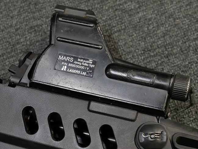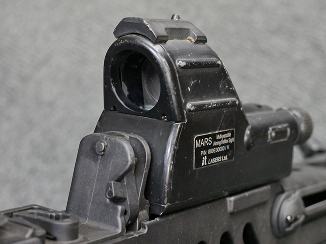 マガジンはM16系のSTANAGタイプの物が装着でき、付属しているマガジンは純正のIMI製又は、IWIの刻印が入った物です。 タボールの純正装備品でもあるMARSリフレックス・サイトも付属しております。 こちらは外見上は大きな欠損はなくコンディションも良い状態ですが、サイト本来の機能は保障しておりません。 MARSリフレックス・サイトが付属した品は本品が唯一の品です。