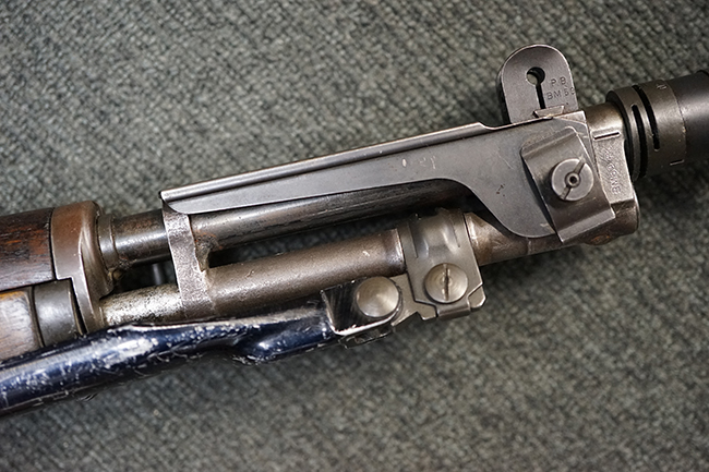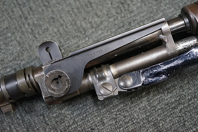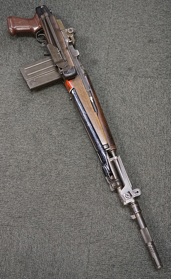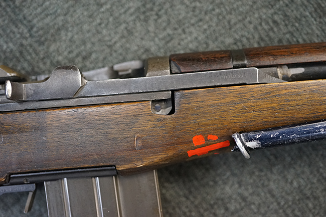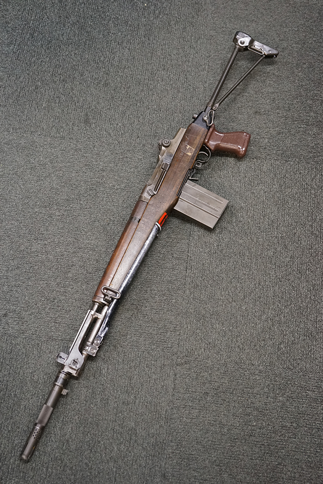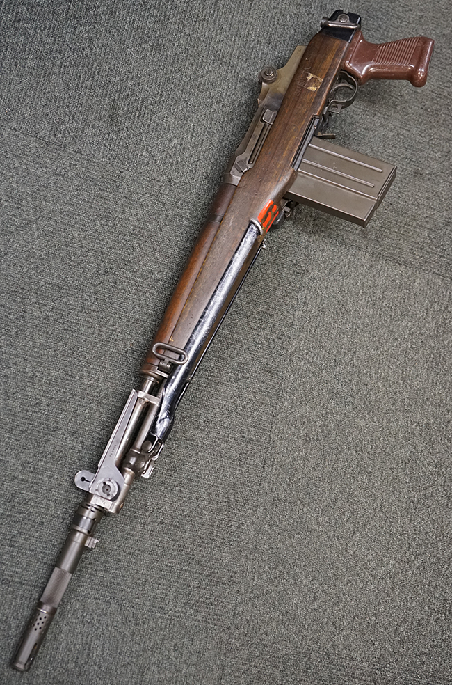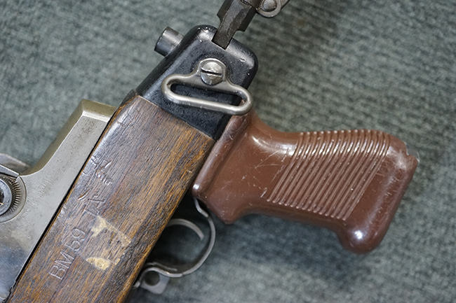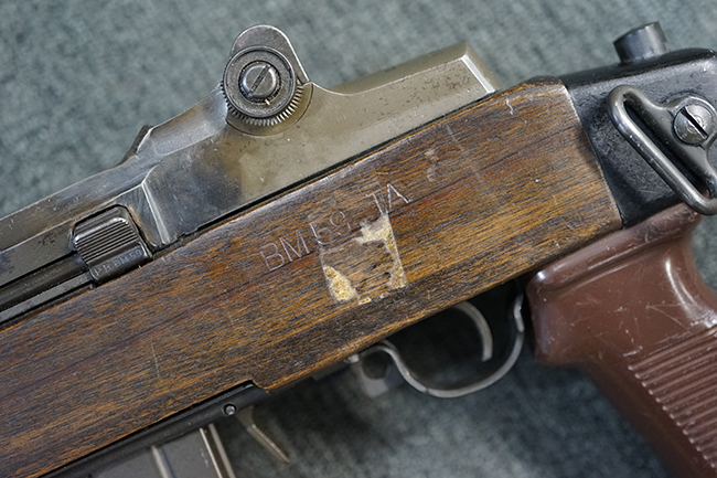 状態は軍からの払い下げ品の為使用感があり、軍での管理番号などがペイントされております。M1 ガーランドのレシーバーを流用した個体で、アメリカで生産された際のシリアルが削り取られ、新たにシリアルが打刻されています。 また木部ストックに「BM59 TA」の表記がみられます。これは山岳モデルの表記ですが、本品は榴弾発射機の脱着が可能な落下傘部隊モデル「BM59 TP」です。