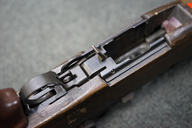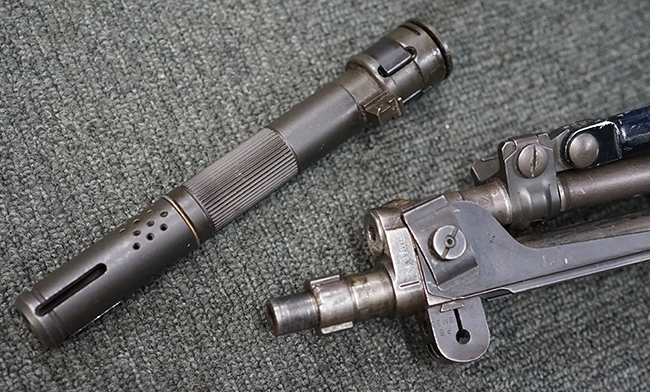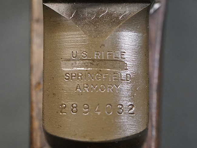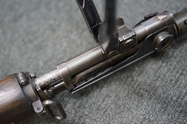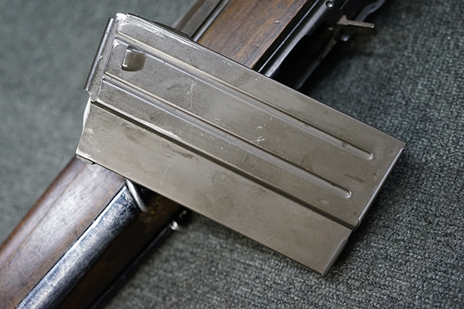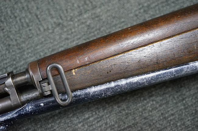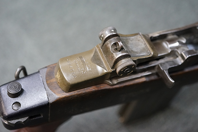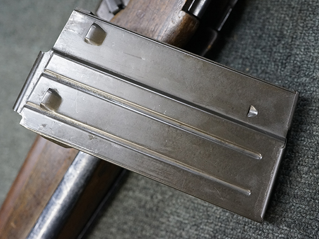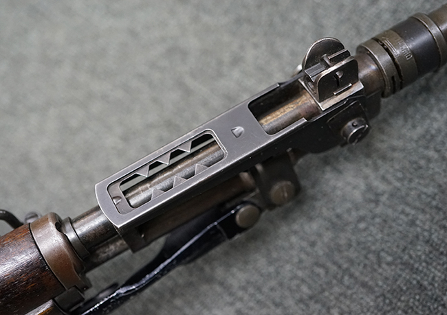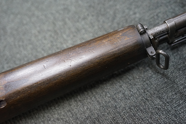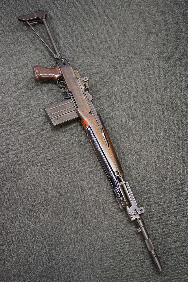状態は軍からの払い下げ品の為使用感があり、軍での管理番号などがペイントされております。M1 ガーランドのレシーバーを流用した個体で、アメリカで生産された際のシリアルが削り取られ、新たにシリアルが打刻されています。 また木部ストックに「BM59 TA」の表記がみられます。これは山岳モデルの表記ですが、本品は榴弾発射機の脱着が可能な落下傘部隊モデル「BM59 TP」です。