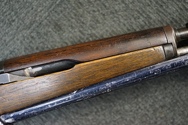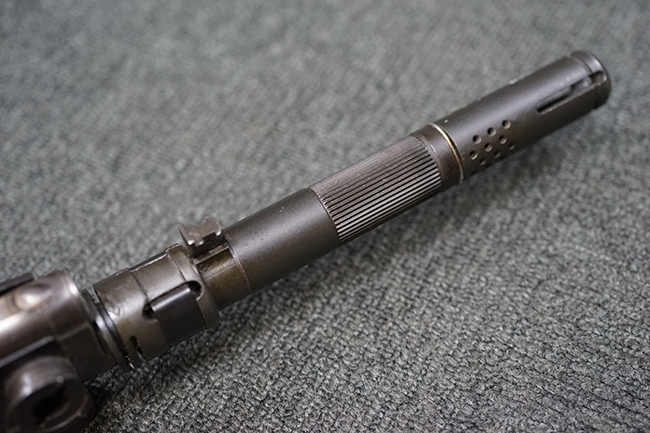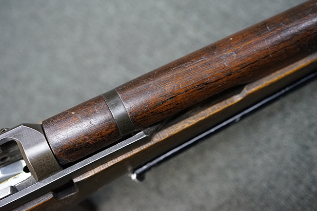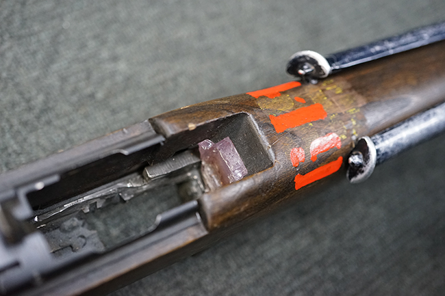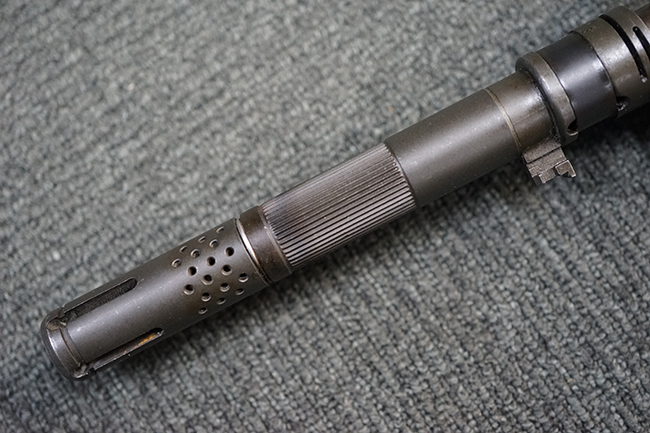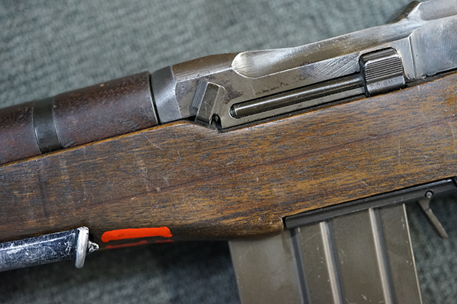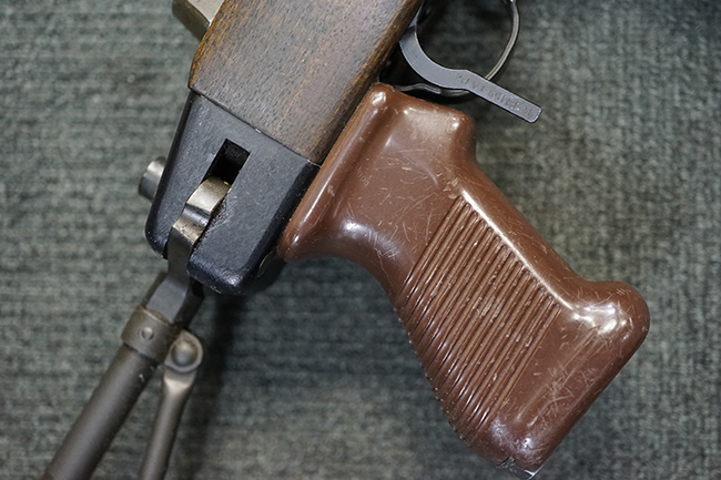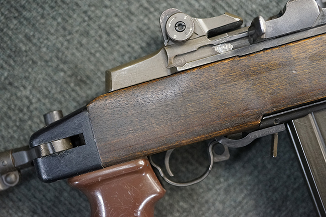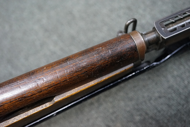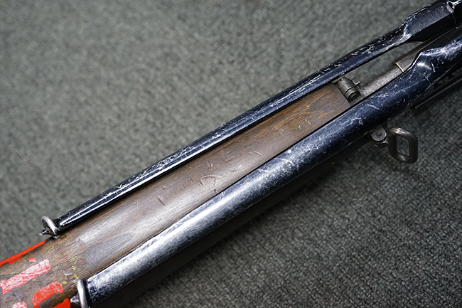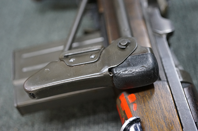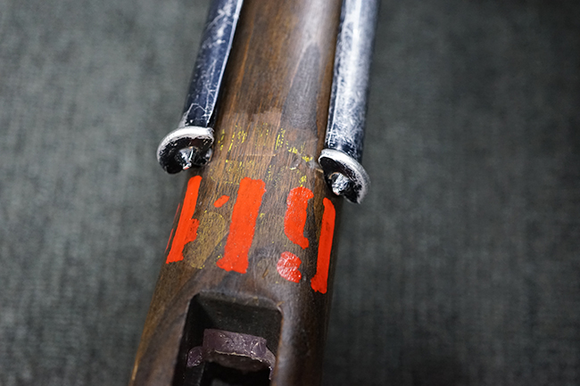木部はストックとハンド・ガードで若干色味が異なりますがそれほど気になるものではありません。 やはり小傷が散見されますが目立った破損はなくしっかりとしています。ストックした面に管理番号と思われる赤色のマーキングが施されています。BM59独特のセレクターなどの部品は付属しておりますが、溶接で固定されております。特に本個体はレシーバーの溶接固定のために通常の分解も一切できない状態になっております。