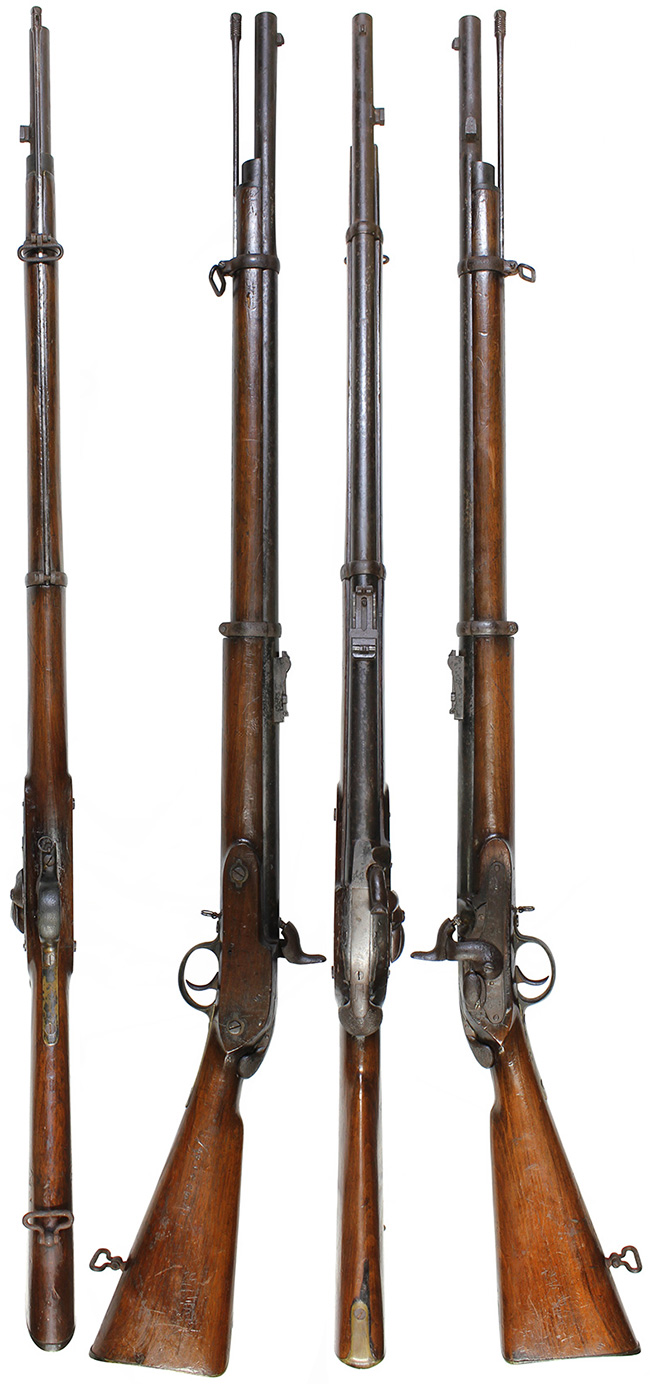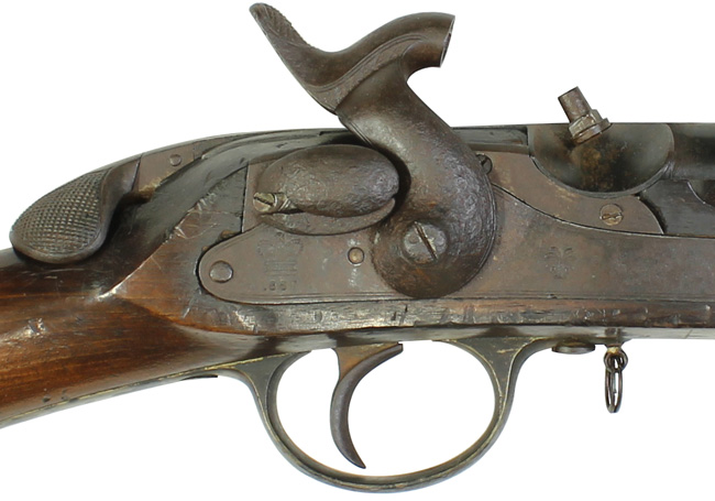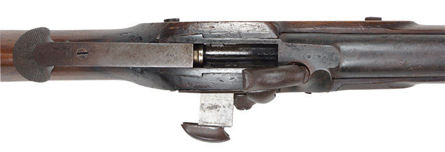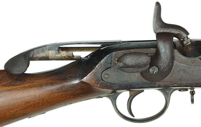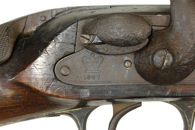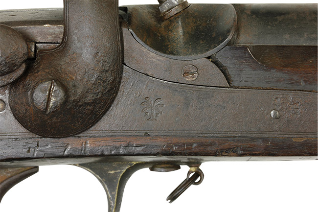 本品は一言でいうと「オリジナルの状態を良く残した資料的価値の高い品」と呼べる珍しい品です。 本品の特徴である後装式部分は完全で機関部の楔(くさび)状の部品のスプリングを使ったロック、楔の左右出し入れを始め、遊底の海老尻部分の機能、そしてそれを持ち上げての遊底前後動は問題ありません。 ハンマーのハーフコック、フルコックの動きもスムースで、コックの際にカキッ!カキッ!と小気味良い音がする程です。 ハンマーと楔、サイド・ロック・プレート、後部スリング・スイベルなどの一部には朽ち込み錆がございますが、全体的に日本で発見された品としては非常に良好な状態です。 トリガー・ガードとバット・プレートは真鍮製でとても時代感がある濃緑青が出てオリジナルの状態を保っています。 サイド・プレートのクラウンの刻印、そしてハンマーの前に「1867」の年号と「ヤシの木」の刻印が入っています。 この「ヤシの木」の刻印は弊社でも初めて見るもので重要な研究課題です。 木部は全体に経年使用の小傷や小さな打ち傷が極僅か見られますが、時代感が色として良く出ており飴色の美しい、良い時代の付いたストックです。