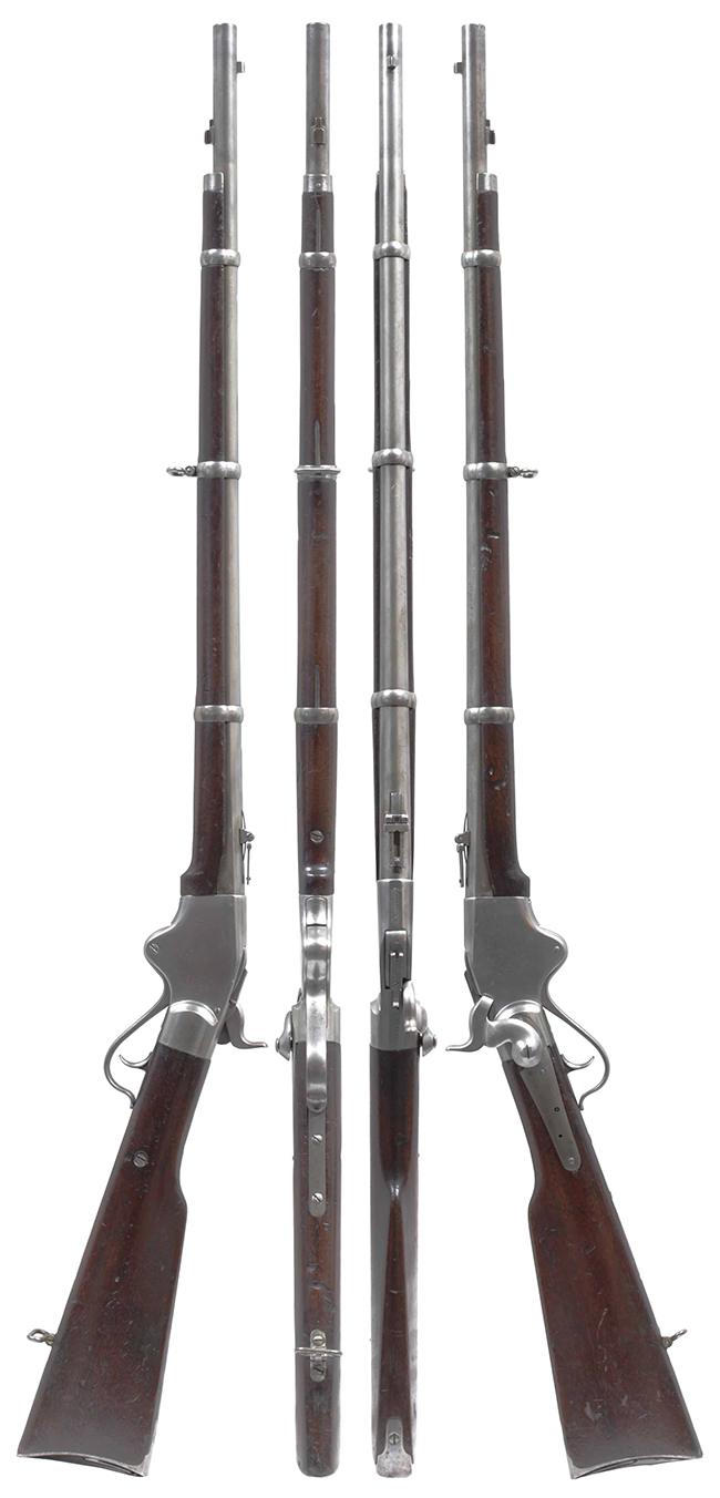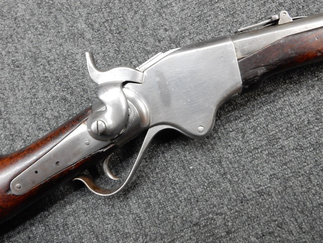 スペンサー連発銃(Spencer repeating rifle)はクリストファー・スペンサー(Christopher Miner Spencer、1833年6月20日-1922年1月14日)が開発した後装内火式の7連発レバー・アクション ライフルで1860年から1869年の間に生産されました。 レバーを下方に引くことによってブリーチが下がりバット・ストック内の管状弾倉(Tube Magazine)から弾丸を薬質に送り込むと同時に空薬莢を上部から排莢します。 当時スペンサー ライフルに対抗できる連発銃はヘンリー ライフルのみでしたが、ヘンリー弾は.44RFという拳銃弾程度の威力しかなく、軍用としてのストッピング・パワーではスペンサーがヘンリーに勝っていました。 しかしながら13連発という装弾数と同じレバー操作ながら、ハンマーも同時に起すことのできるヘンリー ライフルの方に軍配があがりました。 スペンサーはレバー操作とは別にハンマーを親指で起す必要がありました。