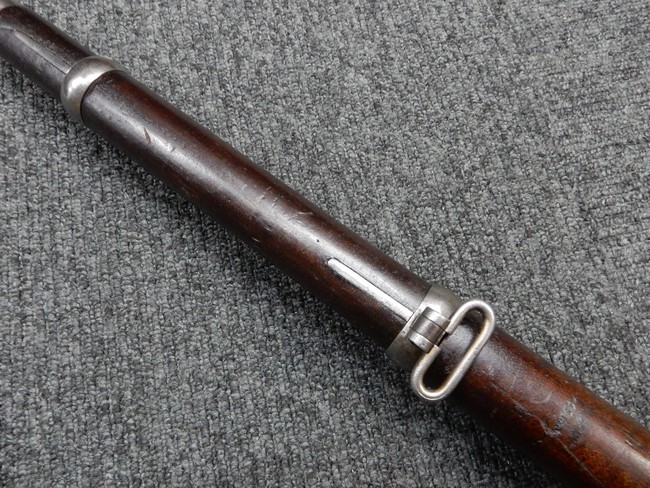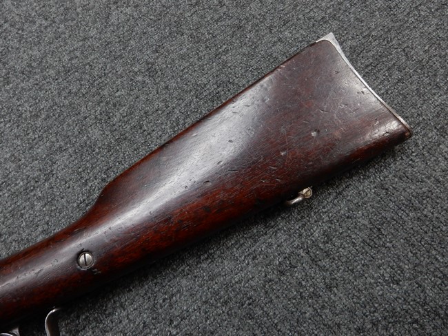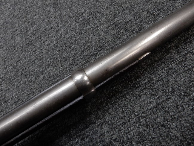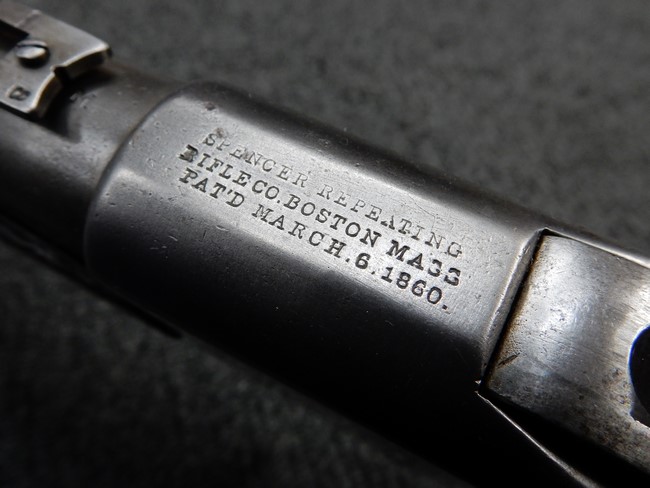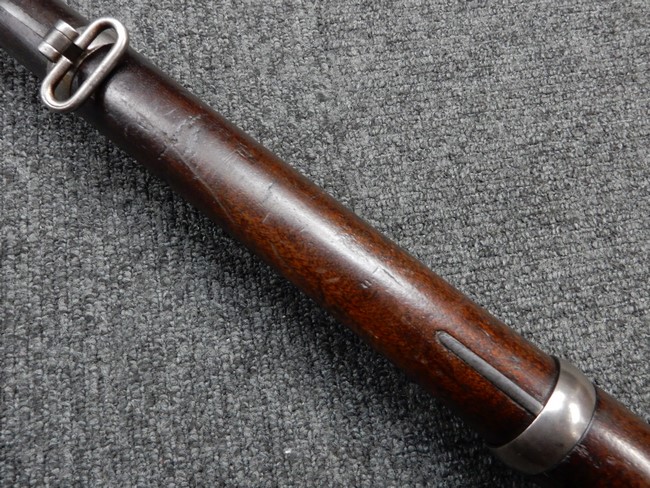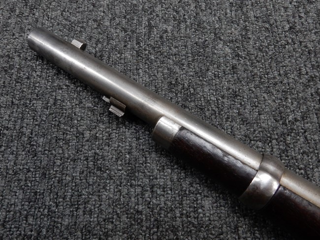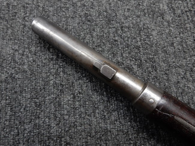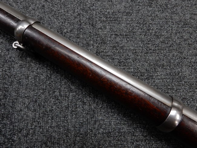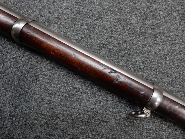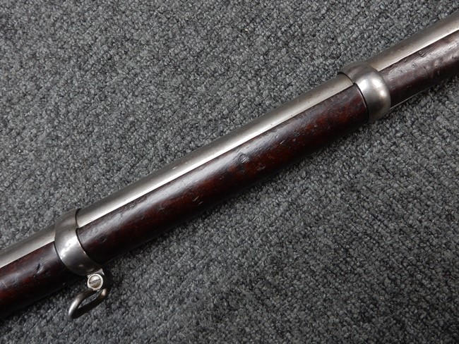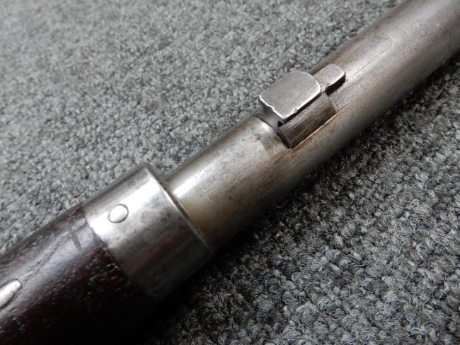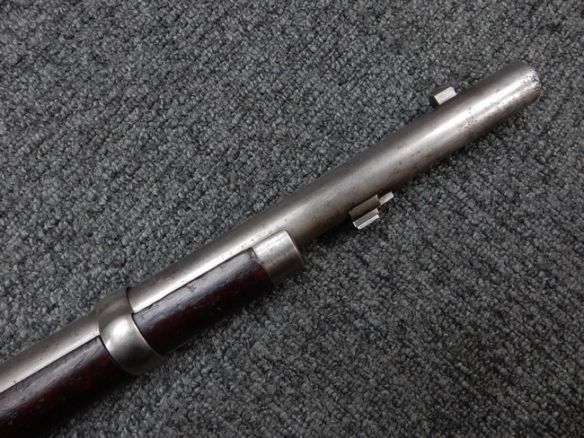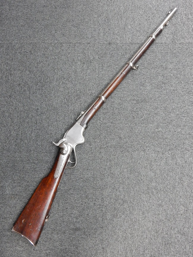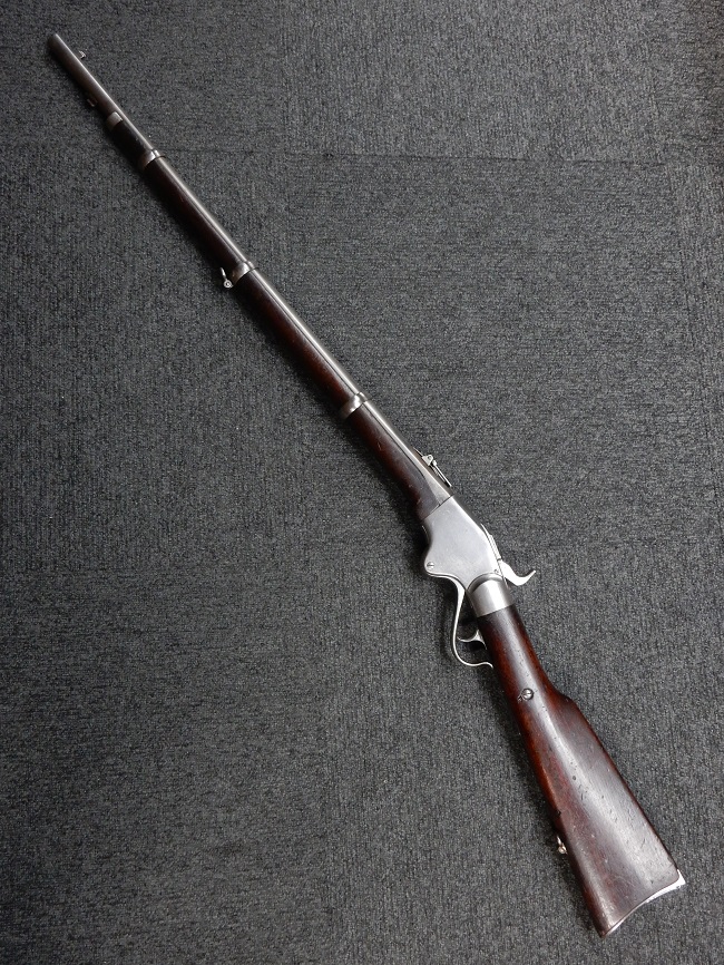 本品は1865年にモデル・チェンジされたNew Modelと呼ばれた改良型です。 銃身後部上方にNew Modelを意味する「N.M.」の刻印が打たれています。 Burnside社製のカービンをスプリングフィールド造兵廠でライフルに改造したモデルはハンドガードを留めるバンドが2個になっています。 Spencer社製のオリジナルのライフル・モデルはバンドが3個があり、本品もその3個のモデルです。また3 バンド・モデルの中にも着剣装置の有無で海軍用と陸軍用に分かれます。 海軍用は銃身の下(フロント・サイトの反対側)に着剣装置が付いてヤダカン式銃剣を装着するようになっています。 陸軍用は南北戦争当時の主力小銃のM1855やM1861と共用のスパイク銃剣を装着するため追加の着剣装置の必要はありませんでした。 本品はその銃身下着剣装置のあるスペンサー社の海軍用で、幕末の日本にはこの海軍用は輸入されていないと思われますので希少価値のある品です。
