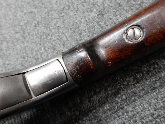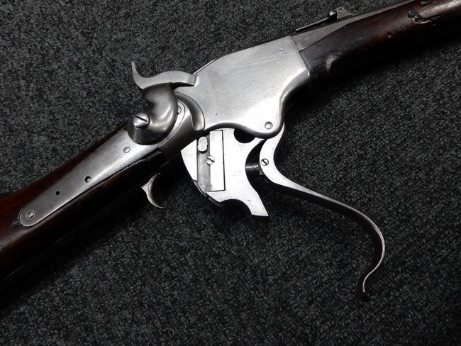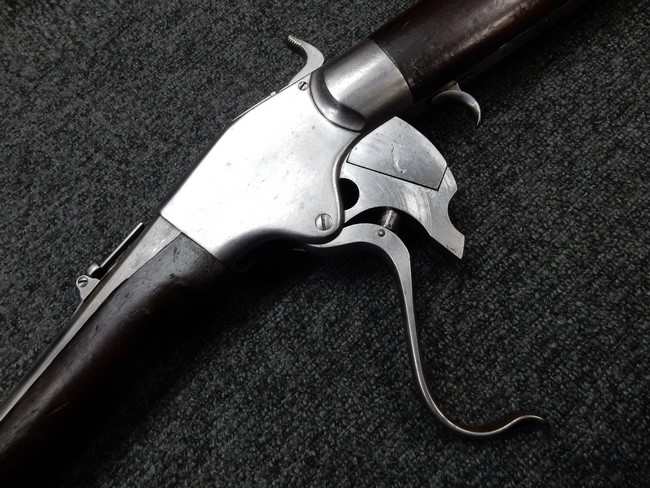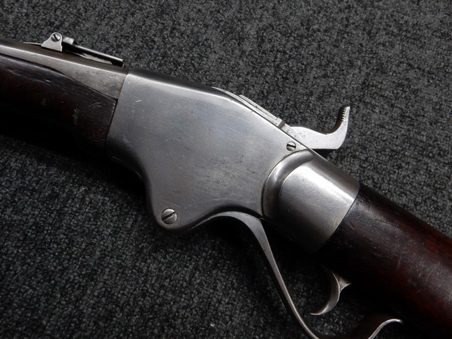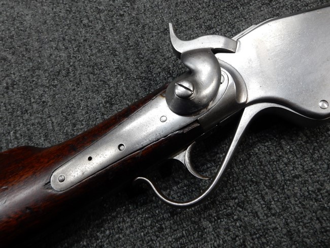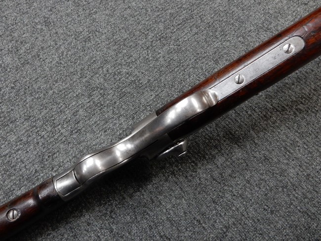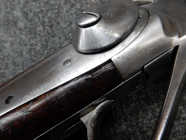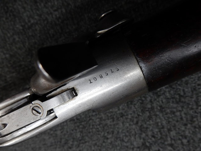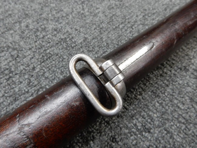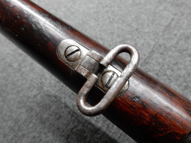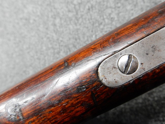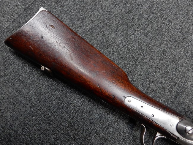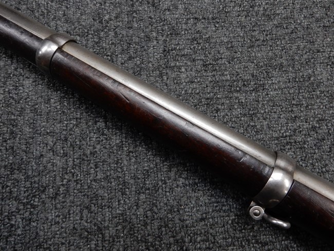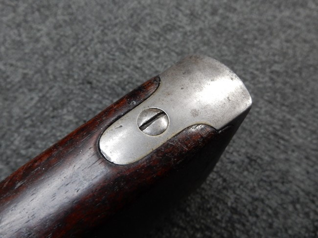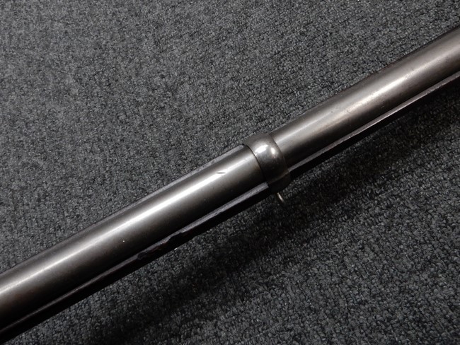 本品は1865年にモデル・チェンジされたNew Modelと呼ばれた改良型です。 銃身後部上方にNew Modelを意味する「N.M.」の刻印が打たれています。 Burnside社製のカービンをスプリングフィールド造兵廠でライフルに改造したモデルはハンドガードを留めるバンドが2個になっています。 Spencer社製のオリジナルのライフル・モデルはバンドが3個があり、本品もその3個のモデルです。また3 バンド・モデルの中にも着剣装置の有無で海軍用と陸軍用に分かれます。 海軍用は銃身の下(フロント・サイトの反対側)に着剣装置が付いてヤダカン式銃剣を装着するようになっています。 陸軍用は南北戦争当時の主力小銃のM1855やM1861と共用のスパイク銃剣を装着するため追加の着剣装置の必要はありませんでした。 本品はその銃身下着剣装置のあるスペンサー社の海軍用で、幕末の日本にはこの海軍用は輸入されていないと思われますので希少価値のある品です。