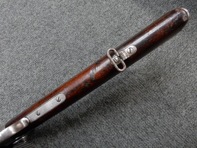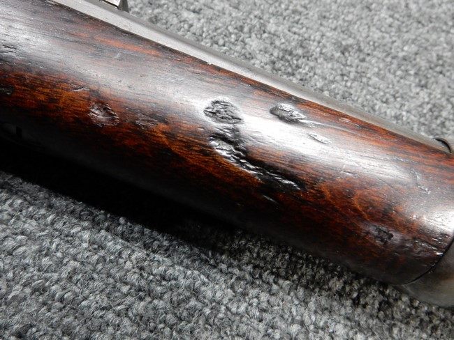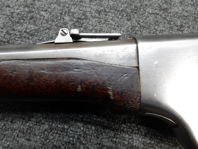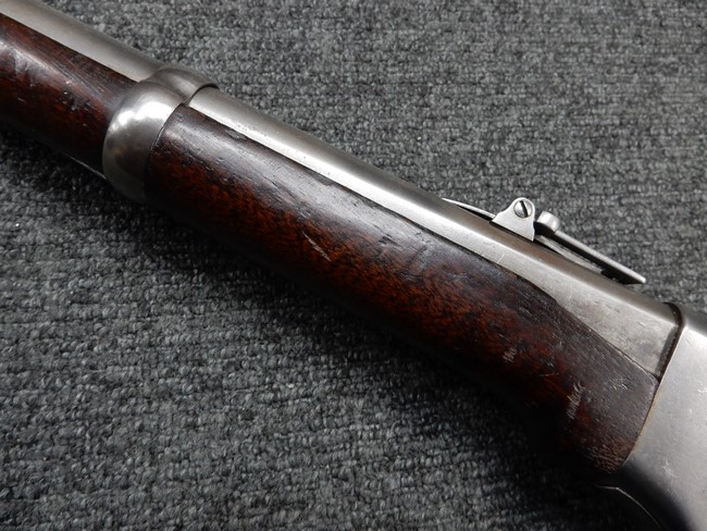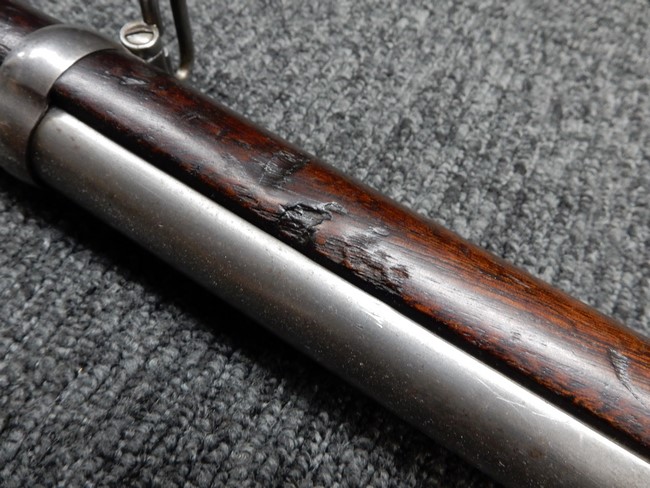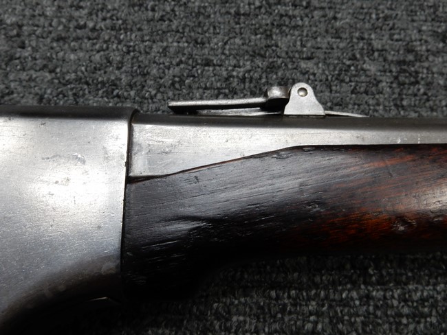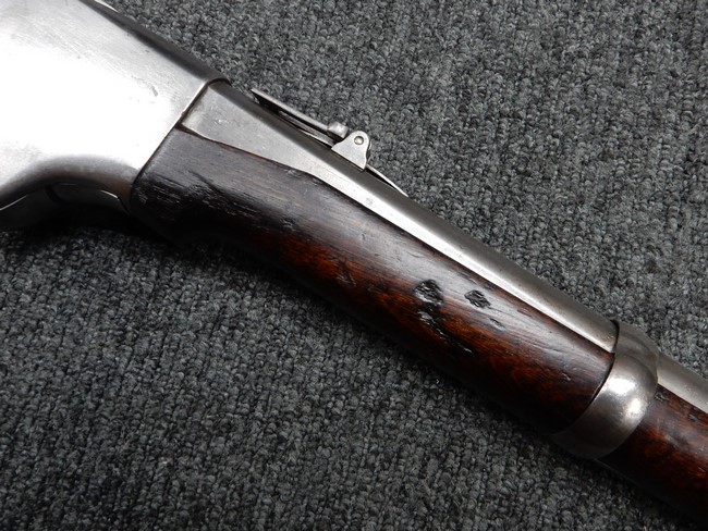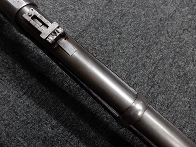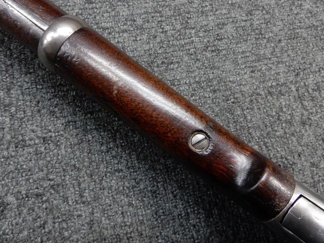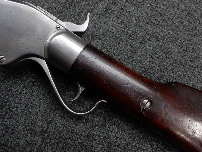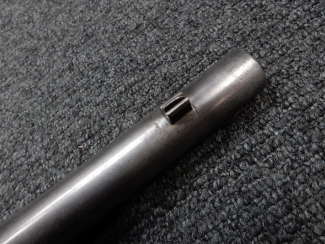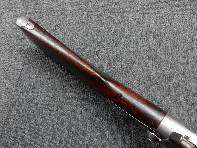 本品は米国海軍で使用されたオリジナルのスペンサー New Model ライフルです。本体(レシーバー)上部にはっきりとSENCER REPEATING(一行目) RIFLE CO. BOSTON MASS.(二行目) PATD MARCH 6, 1860(三行目)のメーカー刻印とパテント刻印が三行に刻まれています。海軍用と呼ばれるようにヤタガン式銃剣用の着剣装置が付いているのが特徴となっていて、銃身後部上方(薬室上方)にNew Modelを意味する「N.M.」の刻印が打たれています。 いずれの刻印も一部薄れて見難くなっている箇所はあるものの全体的に確りと判読することができます。 スペンサーは刻印が比較的浅く打たれているため、薄れていることが多いこと考えればかなりのプラス条件になります。 銃身、機関部を含む金属部全体的に白磨きされており、オリジナルの仕上げは残っていません、また表面的な時代黒錆が一部に出ています。 バット・ストック内に収納されている独特のチューブ・マガジンも使用感はありますが、完全品で作動も良好です。 フロント・バンドにはがたつきは見られませんがセンターとリアのバンドには取り付けに問題は無い物の僅かにがたつきが見られます。 美しい色調の木部はハンド・ガードとバット・ストック共に良いオリジナルの仕上げが残った非常に良好な状態ですが、ハンド・ガードの右側面部中央部や後部等に若干目立つ打ち傷が散見され、ハンドガード後端左右上部が均一に欠けています。 バット・ストックには一部に打ち傷が見られ、ハンマー基部直下の木部に僅かな欠け、ストック右下面中央部には強度に問題は無いものの僅かなヘアライン・クラックが見受けられます、しかし約150年程前の品としては十分に許容範囲内と思われます。 前後のスリング・スイベルや起倒式のラダー・サイトの作動は完全品です。 レバーを下げるとブリーチ・ブロックはスムーズに下方に下がり、薬室の溶接が確認出来ます。 リム・ファイアの撃針は取り外されていますが、スペンサー独特の構造が無可動実銃でも味わえます。 トリガーのテンションはありません。 全体に大変状態の良いスペンサーです。 スペンサー・ライフルは登録証付きの古式銃になると本品の3倍の価格になりますので、無可動実銃である本品はバリエーションを集めやすい価格帯になっています。 (AW)