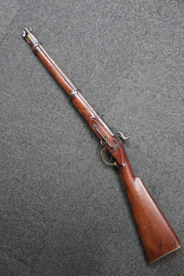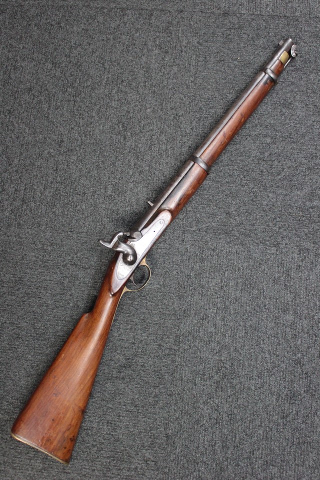 Pattern 1858 騎兵銃は、当時の英国の制式小銃であった.577口径のエンフィールドP1853 歩兵銃の大英帝国植民地専用モデルである Pattern 1858 歩兵銃の 騎兵モデルです。 Pattern 1858 騎兵銃は元々英国東インド会社(British East India Company)用として製造されましたが、後に現地のインド人で編成された英印軍のエリート騎兵部隊である「the Bengal Lancers Regiment」などで使用されました。 1857年から1589年にかけて発生したインド大反乱(セポイの乱、シパーヒーの乱)で現地人傭兵による反乱軍が敗北した後、軍部は現地人傭兵に対して英国正規兵と同等のエンフィールドP1853 小銃の代わりに、射程及び威力の劣った小銃を支給するべきであると考えました。 しかしながら、当時の英国の方針により、英国正規兵と現地人傭兵の携行する小銃の外観があからさまに異なるといった状況は避ける必要がありました。 この為、一見しただけでは英国制式小銃であるP1853によく似た小銃であるものの、実際にはライフリングのない.656口径のマスケット銃であるP1858 小銃を導入することが決定されました。 この小銃は、P1853 小銃が500ヤード以上の有効射程を有していたのに対して、僅か50ヤードの有効射程しかありませんでした。 P1858 小銃は一見するとP1853 小銃に極めて類似していますが、リア・サイトの形状がP1853 小銃とは異なりシンプルなV字型となっており、調整機能は省略されていました。 騎兵銃についても全くおなじ理由で滑腔銃身の前装管打式 Pattern 1858 騎兵銃が採用されました。 (MM)