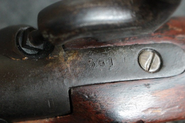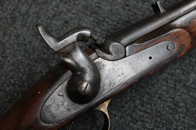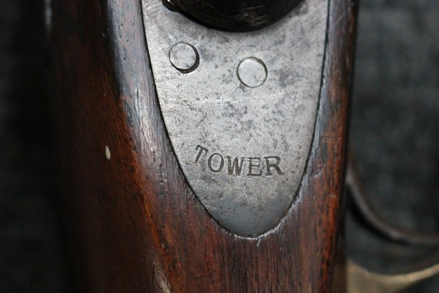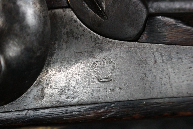 ライフリングがない滑腔銃身のブルー仕上げは落ちてはいますが程よい時代錆が付いており古式銃らしい味わいが出ています。 他の鉄製部品も同じ時代色が出ておりマッチしています。 機関部側面(サイド・プレート部分)に「TOWER」の刻印が入っています。 1856年代を表すの製造年号が入っていますが、判読が困難です。 「TOWER」軍用刻印はロンドン塔にあった英国政府の銃砲検査機関で軍用として耐えうる品質検査された証です(a military arm of Ordnance Dept quality made for the War Department)。 同じエンフィールド型ロックでも「TOWER」の刻印の代わりに民間メーカー刻印だけが入っている品もあります。 しかしながら、インド軍用ですので刻印のフォントが若干英軍用とは異なります。 またハンマーの前部分には王冠の刻印が入っています。 王冠刻印のみの品は当初からの輸出用と言われています。 英国国営造兵廠製か国営造兵廠コントラクト製の品には王冠の下に「V.R」の刻印が入っているので、本品は輸出用である事が判ります。