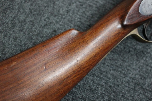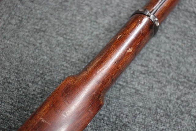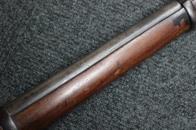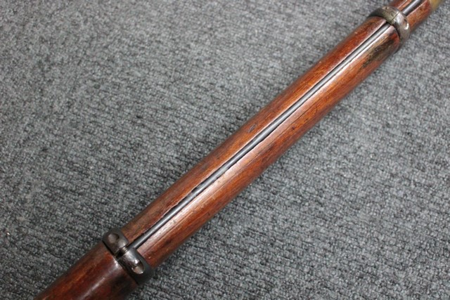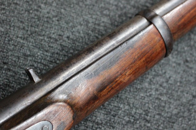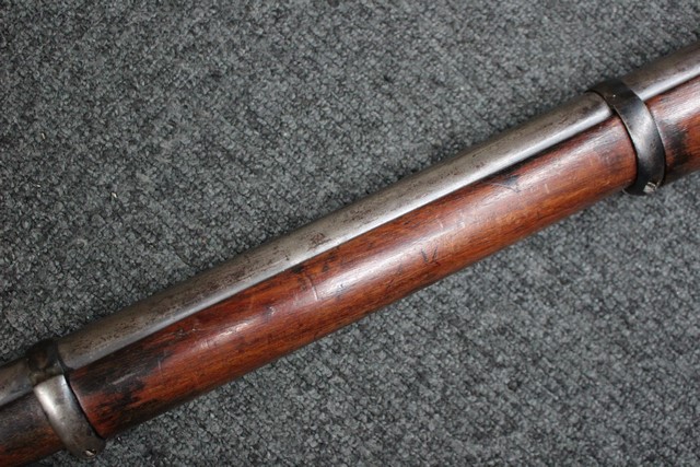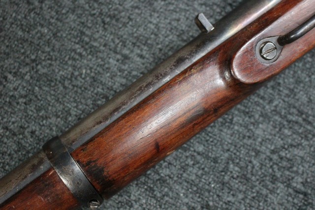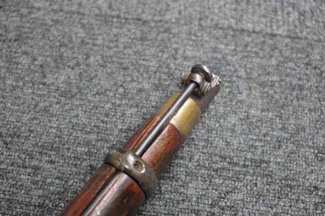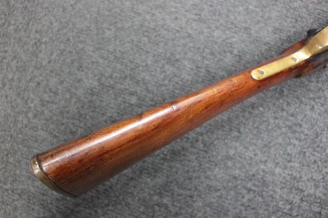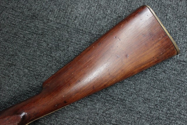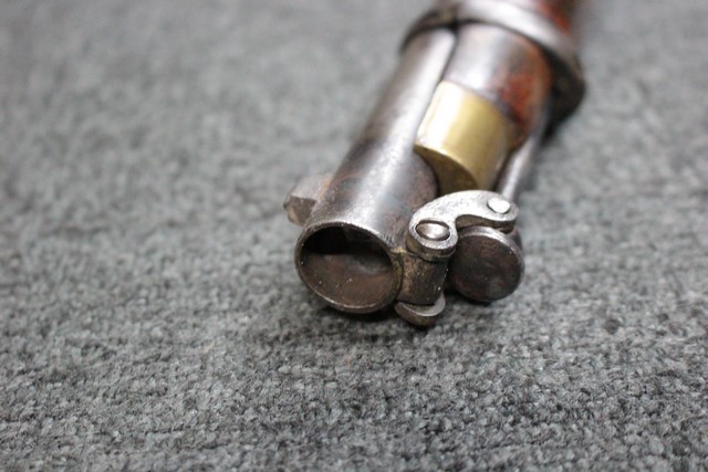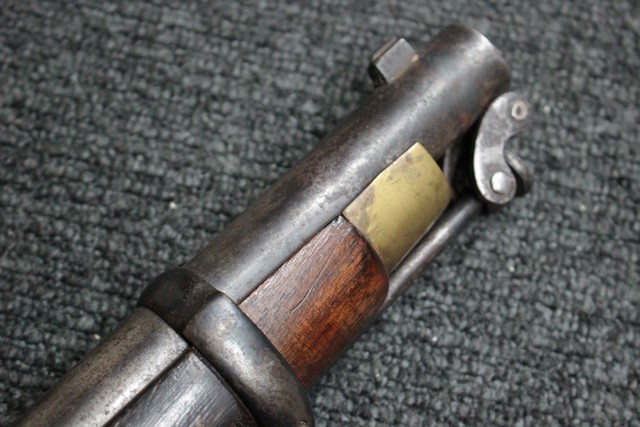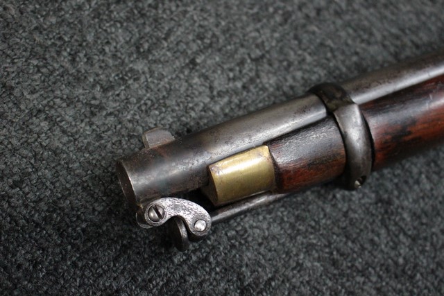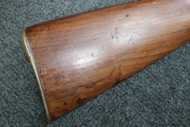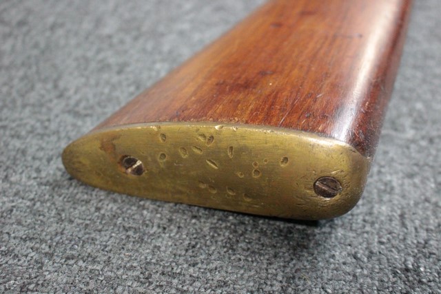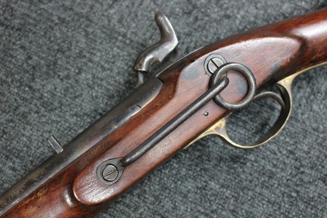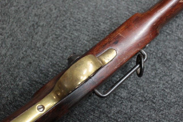 英軍用のストックはウォルナット製ですが、本品はメイプル材と思われる材質です。 160年近く前に製造された事を考えると艶のある程度の良いものです。 しかし経年の小傷はございます。 騎兵銃ですのでスリング・スイベルはなく、機関部左側面に騎兵用のサドル・リングが付属しています。 トリガー・ガード、バット・プレート、フロント・キャップは真鍮製で良い時代色が付いています。 銃身下に取り付けられた鉄製の回転式のラム・ロッドは銃身が無可動加工されていても問題無く動き、銃口前に移動可能です。 この時代の正式なエンフィールド 騎兵銃はどのモデルも少なく国内に輸入されている数も少ない品です。 (MM)