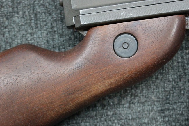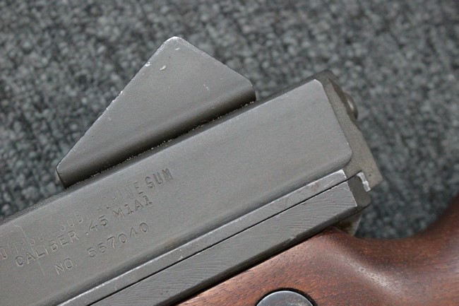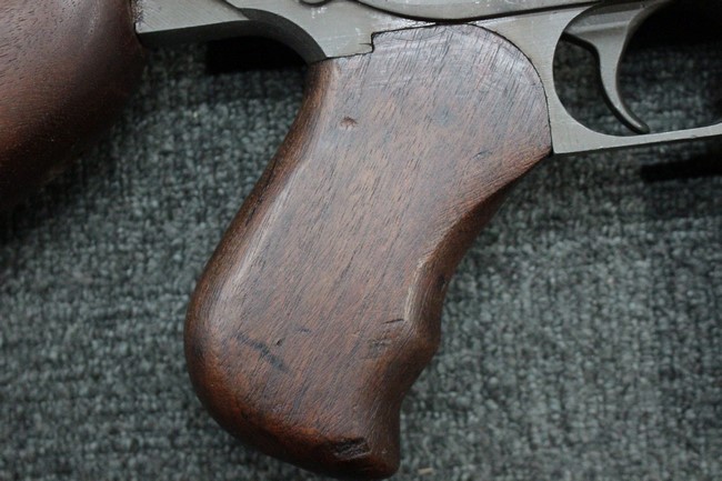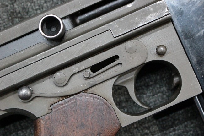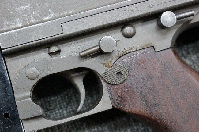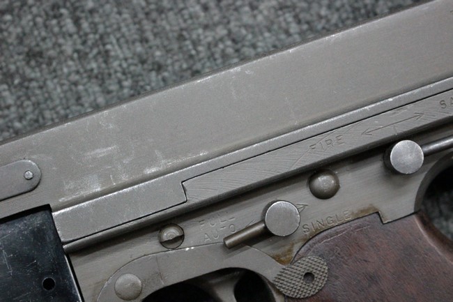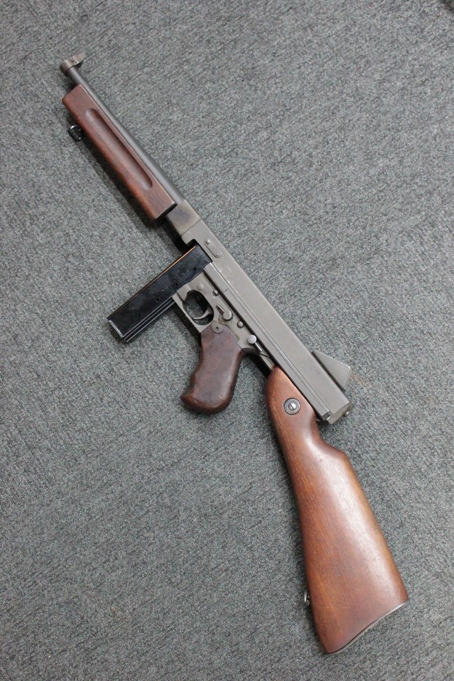 トンプソンM1928A1短機関銃の製造コストを下げるために各部を改良したトンプソンM1短機関銃に対して、さらに撃針の固定化等の追加改良を加えたモデルです。M1A1ではリア・サイトの変形を防止する為、三角形のリア・サイト・ガードが標準装備されるようになりました。また、元々はM1として製造された物の中にも、後にM1A1に準じた改修を受けてA1刻印を追加された個体も存在します。