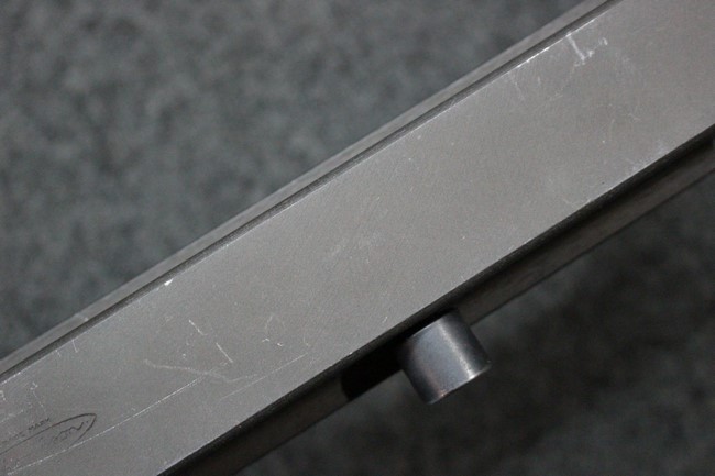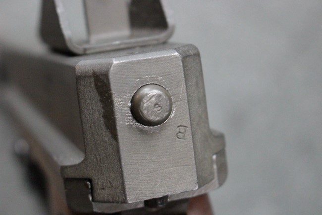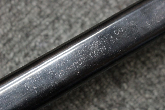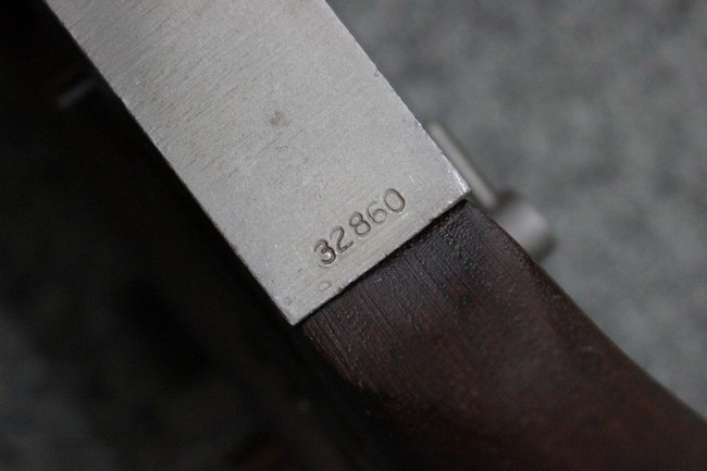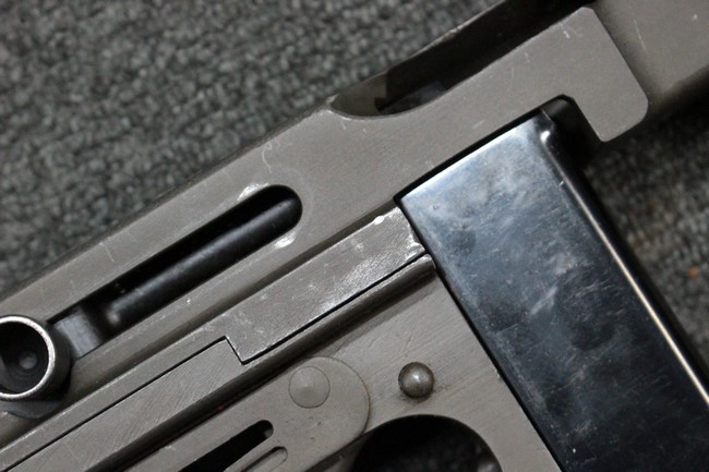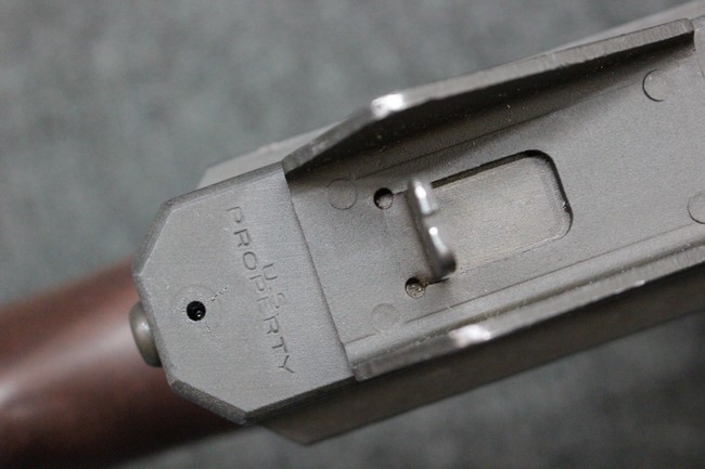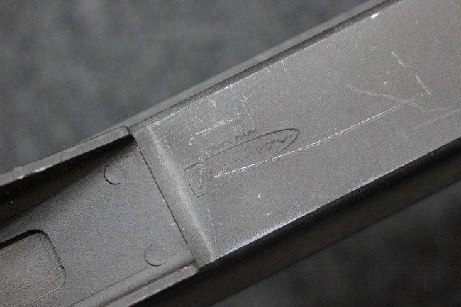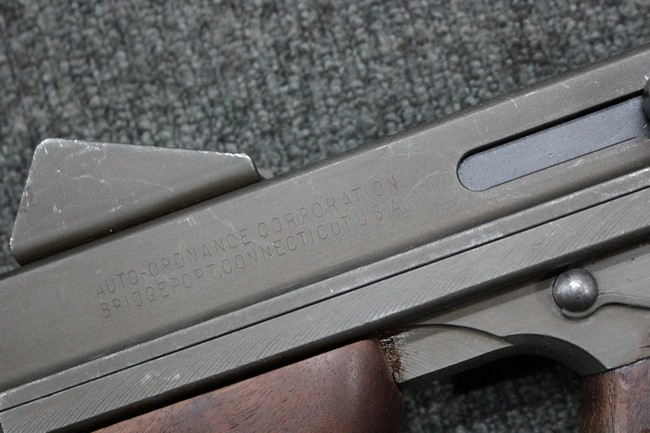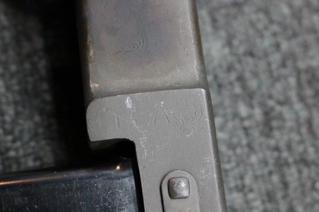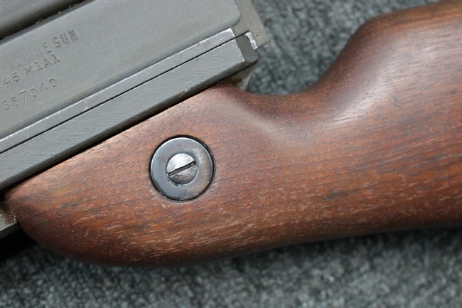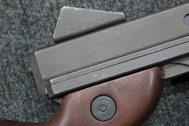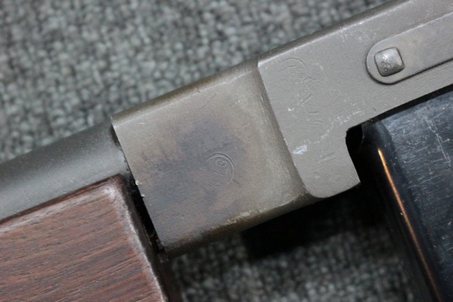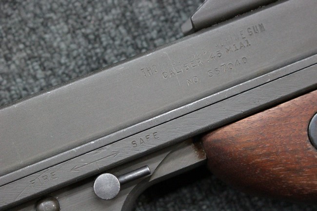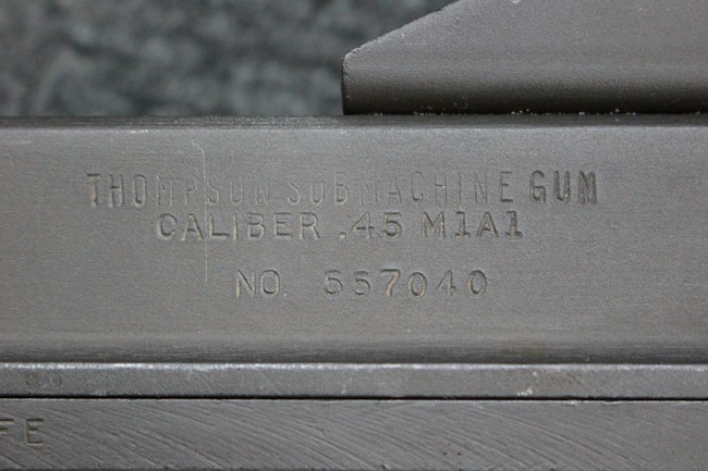 本品はレシーバー左側面に「THOMPSON SUBMACHINE GUN CALIBER .45 M1A1」の刻印及びシリアルNo.557040の刻印が見られます。 シリアルNo.はロア・レシーバーが32860となっています。 また、レシーバー右側面には「AUTO-ORDNANCE CORPORATION BRIDGEPORT, CONNECTICUT, U.S.A」の刻印が入っています。 その他、レシーバー上面にはトンプソンのロゴ及び「U.S. PROPERTY」の刻印が入っており、アッパー・レシーバー左側面にはやや薄くなっていますが、1942年から1946年にかけて陸軍のロチェスター兵站管区で調達を担当していたFrank J. Atwood中佐のイニシャルを示す「FJA」の検査官刻印や、米国武器省 (Ordnance Department) の検査刻印であるクロス・キャノン刻印、オート・オードナンス社検査官のGEG (Geroge E.GOll) の刻印が確認出来ます。 また、ロア・レシーバーとスプリング・ガイドにはサベージ社製を表す「S」の刻印が入っています。