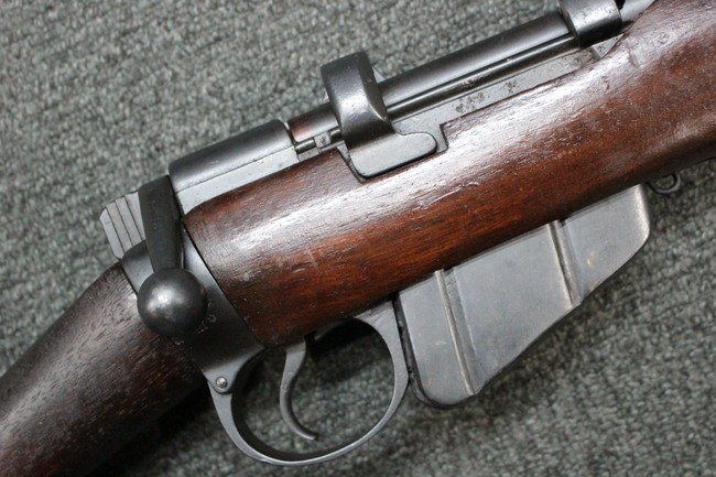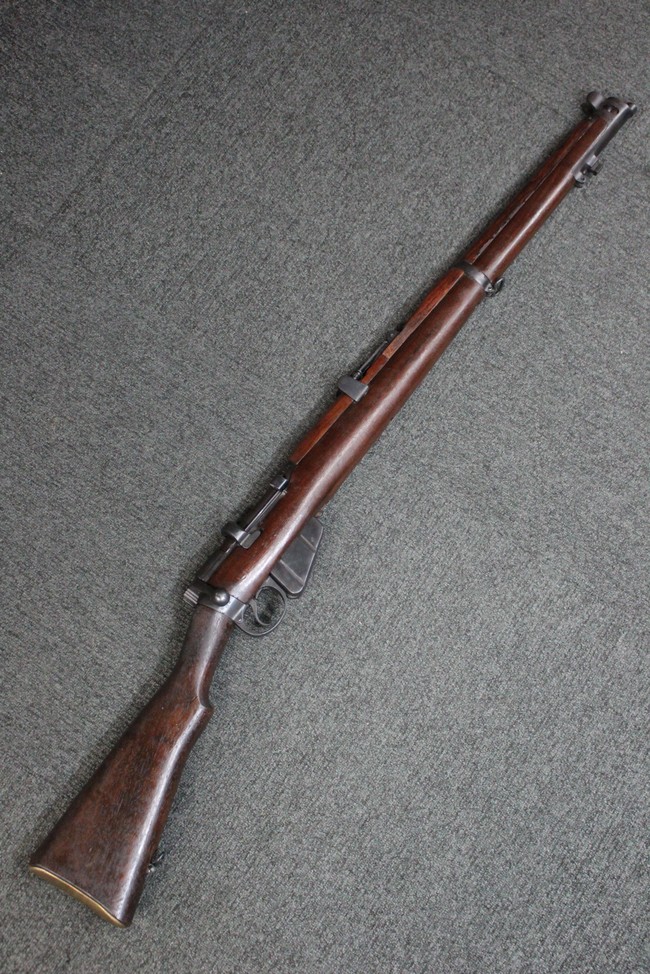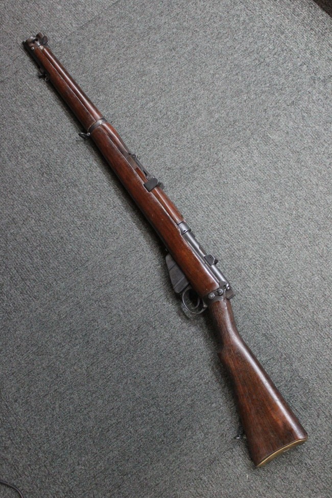 SMLE No.1 Mk III小銃は、SMLE No.1 Mk Iを改良して1907年に英軍制式となったボルト・アクション・ライフルで、第一次、第二次両大戦を通じて使用されました。 SMLEとはShort Magazine Lee-Enfieldを意味します。 SMLE小銃はボルトのロッキング・ラグが同時期の他のボルト・アクション・ライフルと比較して後部に配置されていた為、ボルト・ストロークが短くなり、速射性に優れていました。 SMLE No.1 Mk IIIではリア・サイトが簡略化された他、No.1 Mk Iではボルト・ヘッドに設けられていたクリップ・チャージャー機能が本体側に移されました。 また、ハンドガードやマガジンのデザインも変更され、薬室形状も高初速の尖頭弾であるMKVII弾を使用出来るよう改良が加えられています。 Mk III*はMk IIIの製造コストを下げる為に一部を改良したモデルで、第一次世界大戦中の1915年に登場しました。 Mk IIIに装備されていたマガジン・カットオフ機能が廃止された他、長距離射撃用のボレー・サイトやリア・サイトのウインデージ調整機能も省略されています。 また、コッキング・ピースの形状も円形から滑り止め溝の付いた板状に変更されました。 イギリスでの製造は1943年まで行われましたが、インド、オーストラリアでは50年代まで生産が続けられました。 SMLE No.1小銃はその後、第二次世界大戦中期以降のイギリス軍主力小銃となったNo.4小銃への更新が徐々に行われました。 No.4小銃ではリア・サイトが機関部後方へと移された他、着剣ラグも延長された銃口部へと移されましたが、内実は大きな変更は見られません。 最終的にはFALの英国仕様であるL1A1が採用されるまで、シリーズを通して実に約60年間主力小銃であり続けた英軍を代表する名銃です。 (KK Updated)