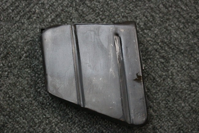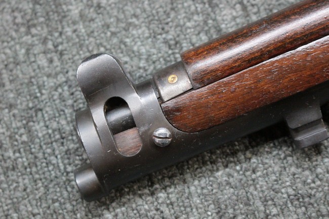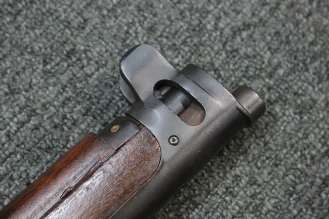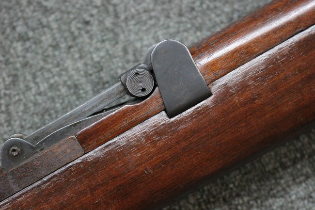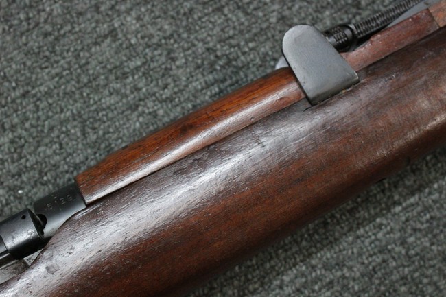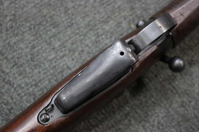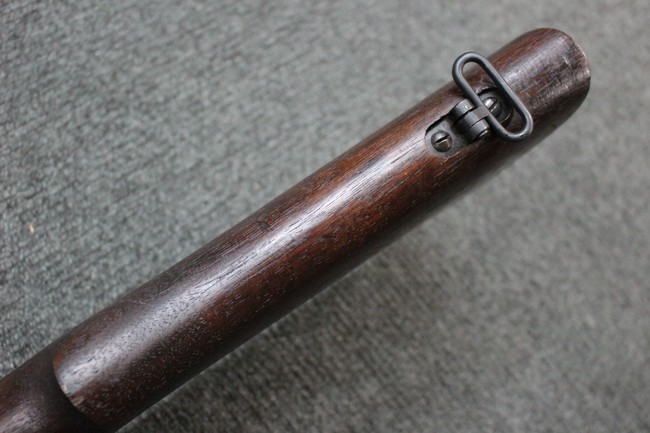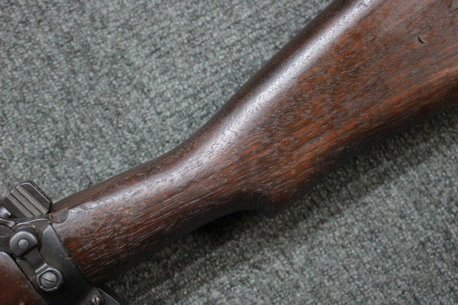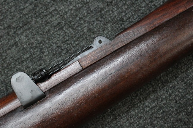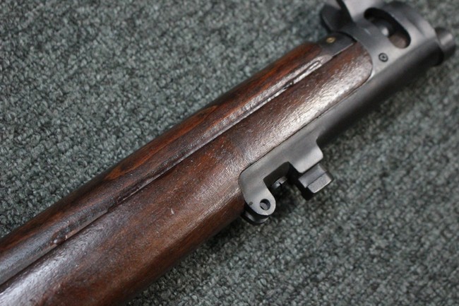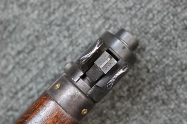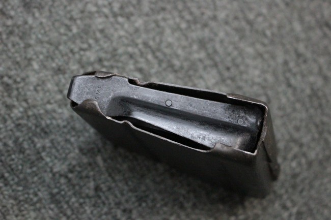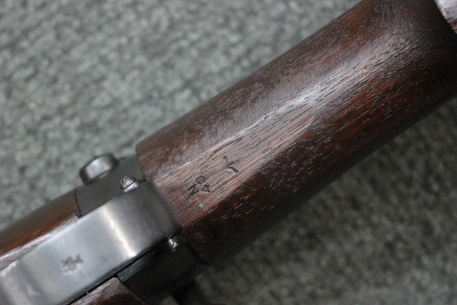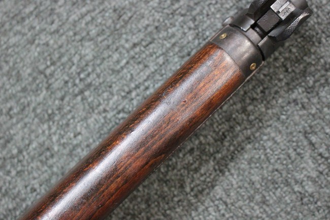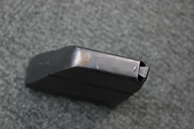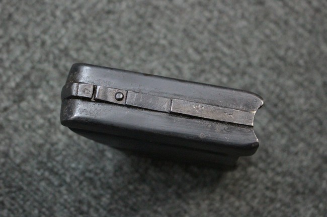 金属部は全体にやや打ち傷や経年による褪色、若干の表面錆痕が見受けられますが、全体としては大きな欠損等は見受けられず、概ねしっかりとした状態が保たれています。 また、金属部は焼き付け塗装となっています。 木部の色味については、アッパー・ハンド・ガードのみ複製品で、仕上げに若干の差がありますが、ストックの色味にかなり近い為、違和感はありません。 木部は若干の打ち傷や線傷を除いて大きな欠損などは見受けられません。 ストックの取り付けに極僅かながたつきは見受けられますが、十分許容範囲です。 リア・ハンドガード上面に正規の補修痕が見られるものの、強度的にしっかりした状態が保たれており、ハンド・ガードの取り付けにガタつきも見られません。 バット・プレートは真鍮製で、細かな打ち傷が散見されるものの、大きな腐食や変形などは見られず、ストック内コンパートメントの蓋の開閉についても問題なく行う事が可能です。 リア・サイトの調整やマガジンの着脱については問題なく行う事が可能です。セーフティの操作は数cmほど下げられますが、完全に下げることは出来ません。 マガジンについては底面の仕上げが落ちて地の金属色が現れていますが、大きな腐食や変形は見られません。 尚、マガジン内にフォロアーとスプリングは入っています。