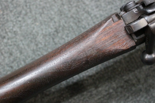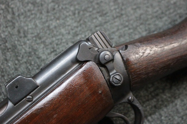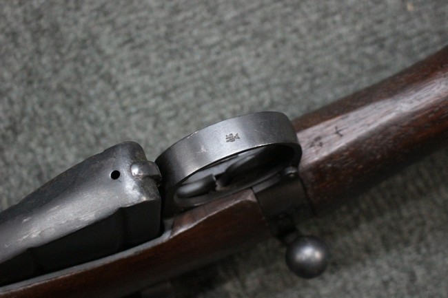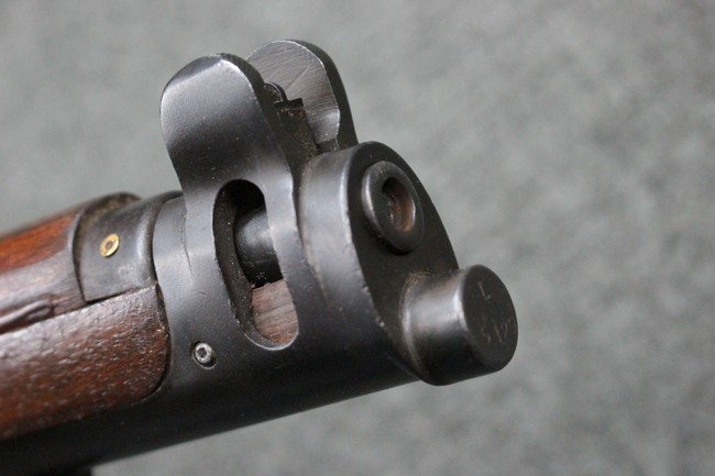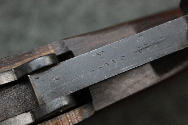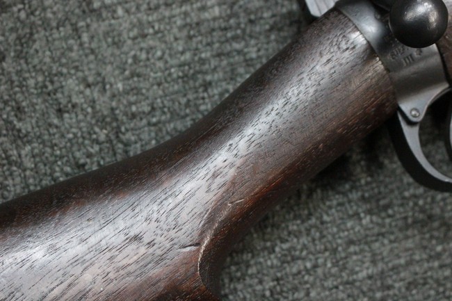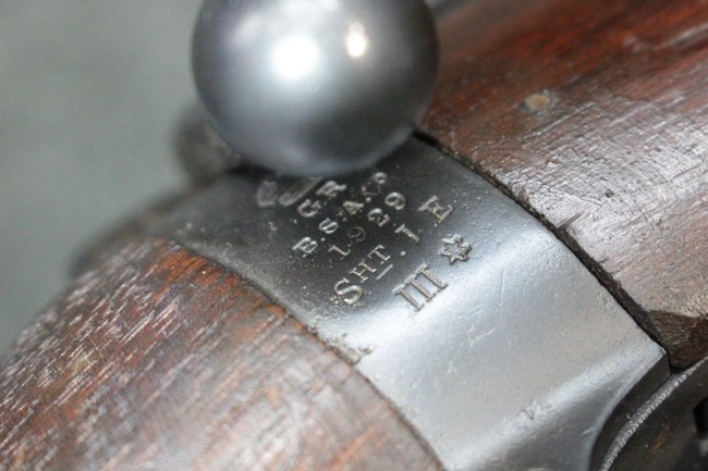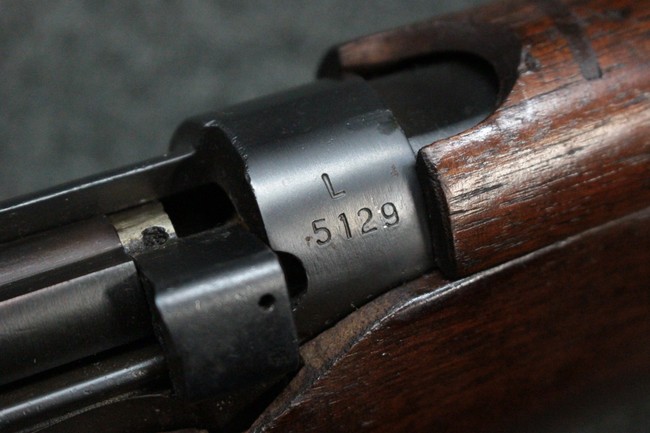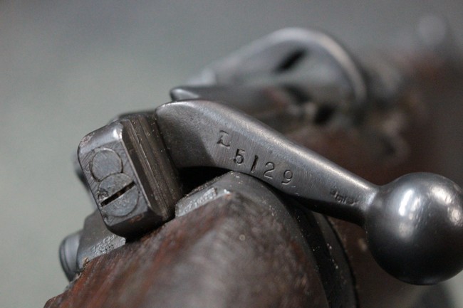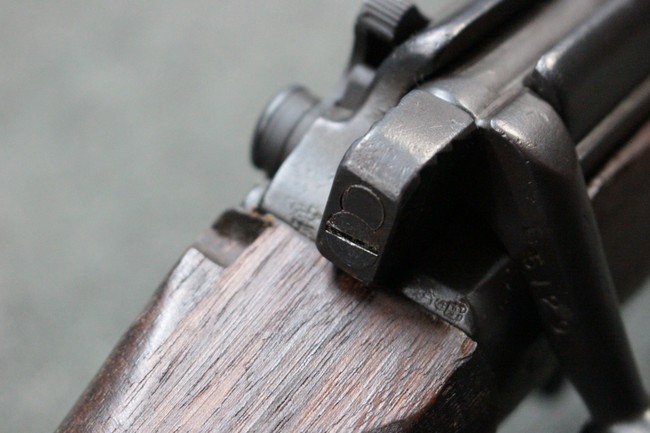本品のバット・ソケット右側面には王冠及びGeorgius Rexを示す「G R」の刻印や、Birmingham Small Arms Companyを示す「B.S.A.Co 1929 SHT. I.E III*」の刻印が入っている事から、1929年英国Birmingham Small Arms社製である事が分かります。 薬室右側面にはシリアルNo.L5129が入っており、ボルト・ハンドルとマッチしています。 その他の箇所ではリアサイトがY5500となっています。