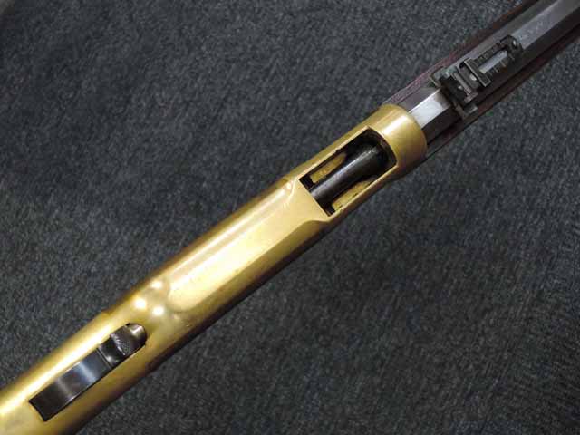 本品のオクタゴン・バレル、チューブ・マガジン、トリガー・ガードを兼ねた装弾用のアンダー・レバー等は白磨きとなっており鈍く輝いております。 イエローボーイの名の由来であるフレームの砲金部分は、若干の打ち傷や一部経年による変色は見られるものの、現状目立った欠損や腐食等は見られません。 白磨きと砲金製レシーバーのコントラストが大変美しく、復刻品ならではの魅力があります。 ウレタン仕上げの木部は、オリジナルとは仕上げこそ異なりますが、復刻品ならではの贅沢さで、状態も良く、本体の美しさにマッチしています。 木部はやや打ち傷や線傷が散見されるものの、目立った破損等は見受けられません。 バット・プレートについても、僅かな小傷を除いて目立った腐食等は見られず、比較的良好な状態が保たれています。 銃床とバット・プレートの間に僅かに隙間が見られますが、銃床への取り付けはがたつきもなくしっかりとしています。 アンダー・レバーは途中まで引き下ろす事が可能ですが、エレベーターとの連動等はありません。 尚、ハンマーは固定されています。 リア・サイトの起倒については問題なく行う事が可能です。