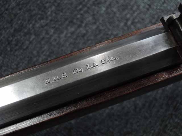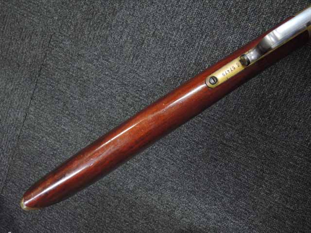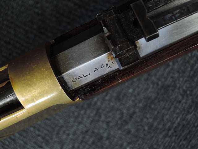 本品はイタリアで製造された実射用の復刻品を無可動化したものです。 銃身上面には「E.M.F. Co. L.A. CAL.」と打刻されており、アメリカのE.M.F.社がイタリアのUberti(A.ウベルティ)社にOEM生産させた品である事が分かります。 銃身上面には、「WINCHESTER'S-REPEATING ARMS. NEW HAVEN.CT:」及び「KING'S-IMPROVEMENT-PATENTED-MARCH 29.1866. OCTOBER16.1860」の刻印が二段にわたって打刻されており、当時のウィンチェスターの刻印をかなり忠実に再現しています。 通常のUberti社製のM1866 イエローボーイにはこのオリジナルと同じ刻印は入っていません。 銃身基部右側面には「CAL.44」の口径表示刻印が入っており、アッパー・タングには「MODEL 1866」のモデル名刻印が入っています。 シリアルNo.57479はロア・タングに打刻されています。 本品のリア・サイトは折り畳み式のピープ・サイトとなっています。
