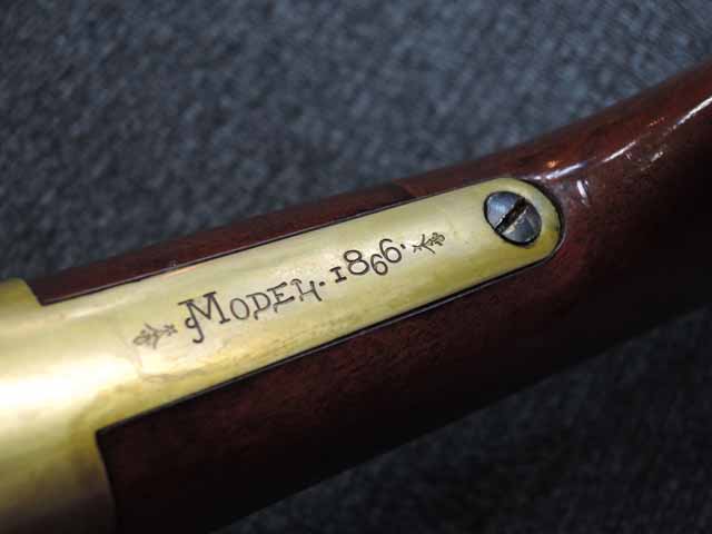 M1866には銃身長が27インチのマスケット、24インチのライフル、20インチのカービンがありました。 本品は銃身長24インチのライフル・モデルです。 バット・プレートについては、マスケットはカービン型と呼ばれるなだらかなカーブを描いた形状、ライフルはクレセント型 (三日月型) と呼ばれる、強いカーブを描き、角が尖った形状で、カービンにはカービン型とクレセント型の両方が見られます。