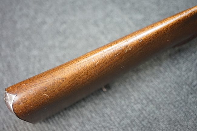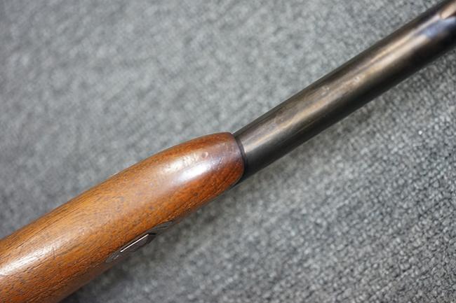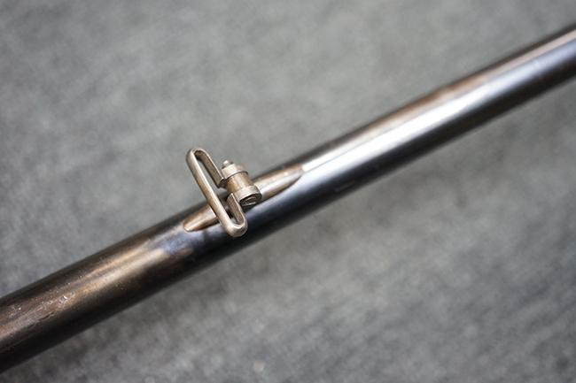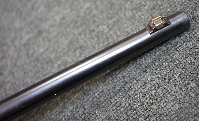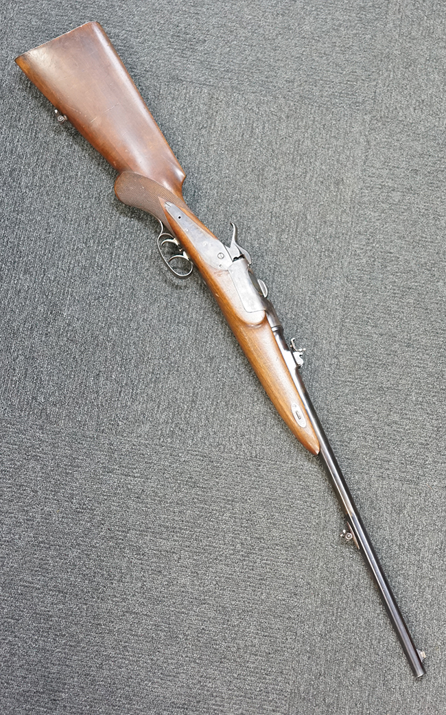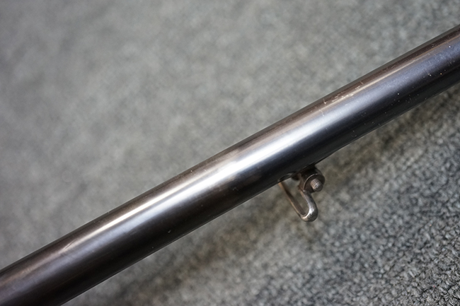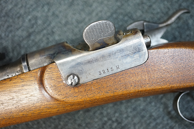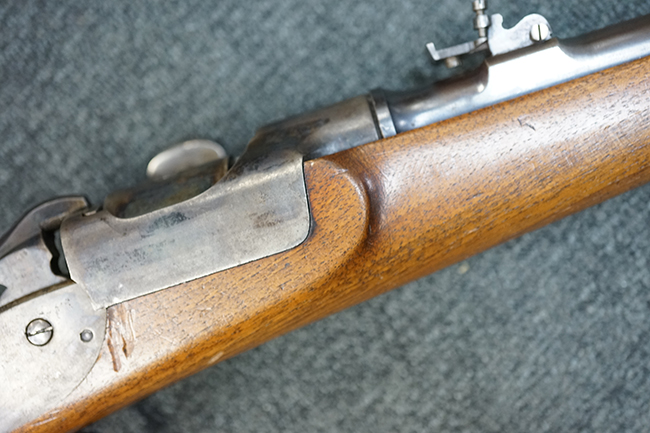 M1877は1877年から1885年の間に約20万丁が生産されました。 M1873はM1867の改良型で外見上の違いはドラム式ブリーチを回転させて薬室を開くためのノブの形状が変わり、より使用し易くなっています。 レシーバー右側面が下方に広くなっている点の方が見分けがつき易くなっています。 また構造的にもM1867ではサイド・ロック方式でハンマーがサイド・プレートの外側に付いていたのが内部に収まっています。 それによって内部構造も近代的になっています。 口径は11mmでリムドの11x42mm センター・ファイア弾を使用します。 1877年に多くがリムドの11x58mm弾を使用出来るように改造されM1873/77となりました。 そしてM1877は当初から11x58mm弾用として生産された最終型です。 本品は更に8mm マンリッヒャー弾にリチャンバー/リバレルされています。