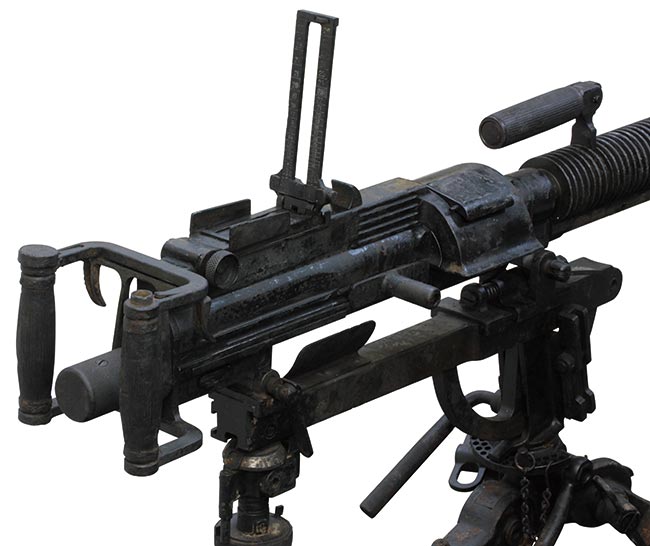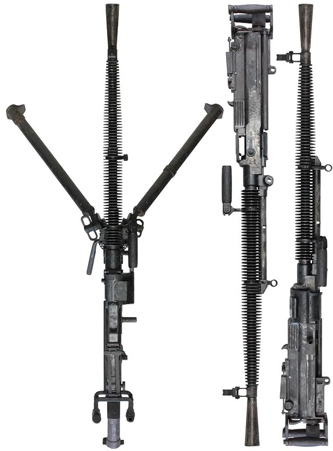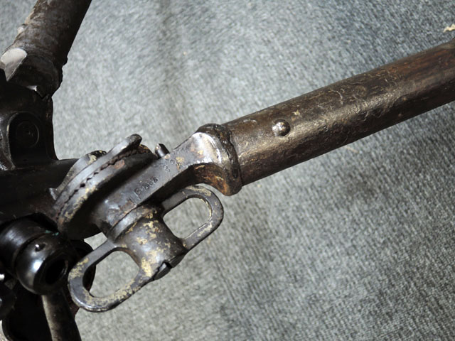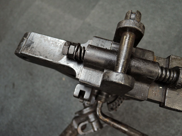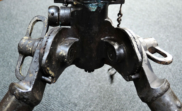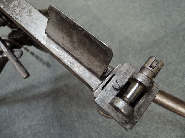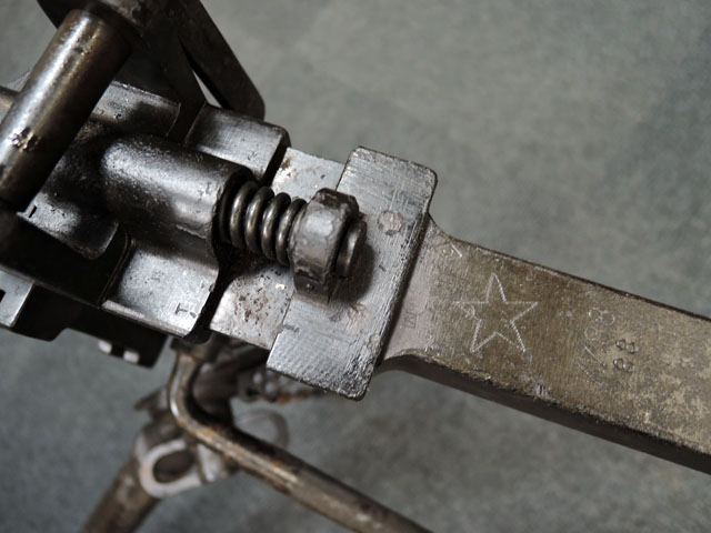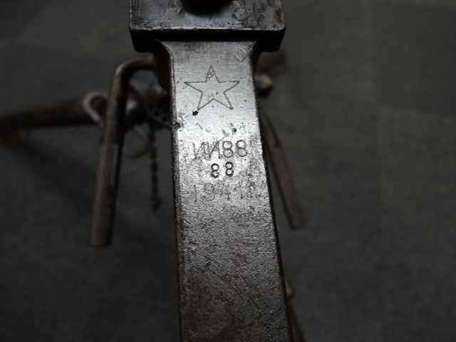 専用の三脚が付属し、銃本体を取り付ける事が可能となっています。 三脚は1941年製を示す刻印が入っており、銃本体とシリアルNo.はマッチしておりません。 三脚後部の上下微調整用ダイヤルは固着しているものの、上下左右の調整自体は可能となっています。