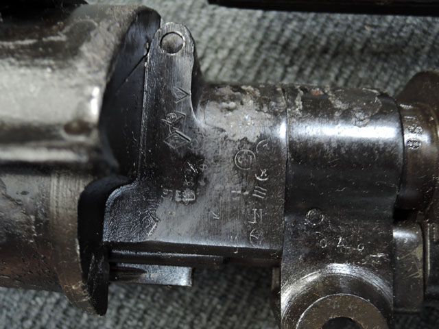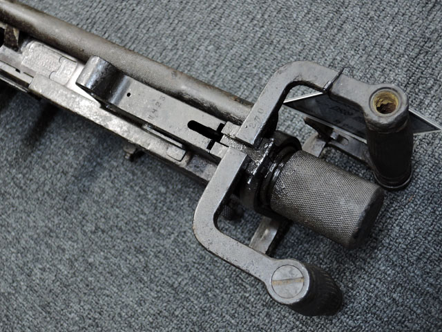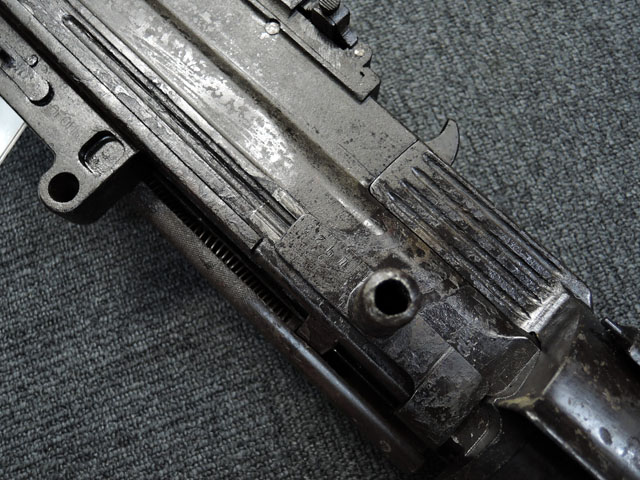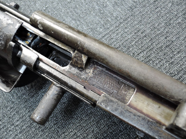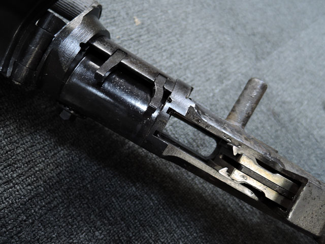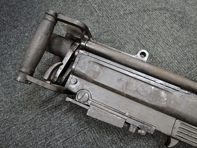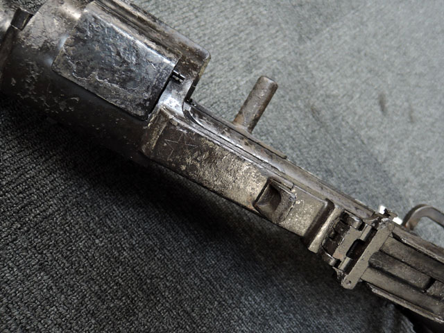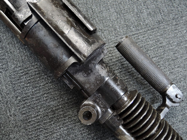 フィード・カバー上には星のマーク及び製造年を示す1940の刻印が確認出来ます。 シリアルはレシーバー、フィード・カバー、グリップ上部、リア・サイト・ベースでマッチしており、銃身やグリップ下部、ガス・シリンダーのシリアルNo.は異なっています。 残念な事にスペード・グリップ右側上部のオイラーが欠損していますがそれ以外には欠品は見られません。