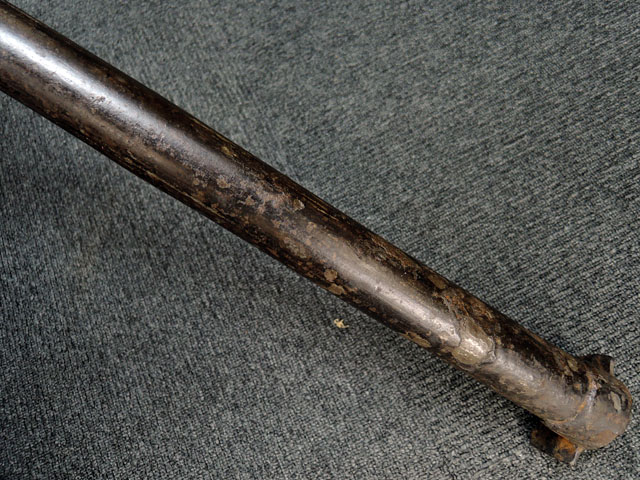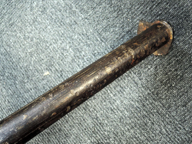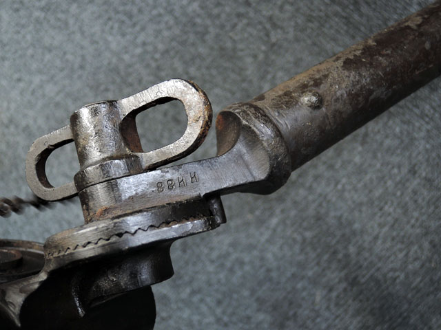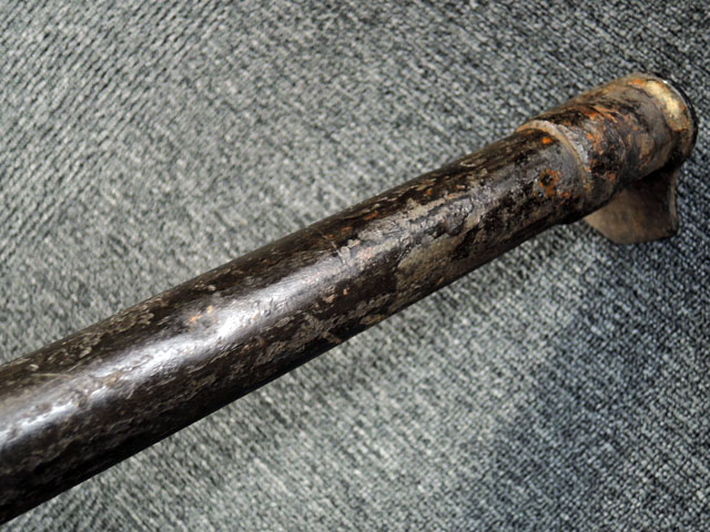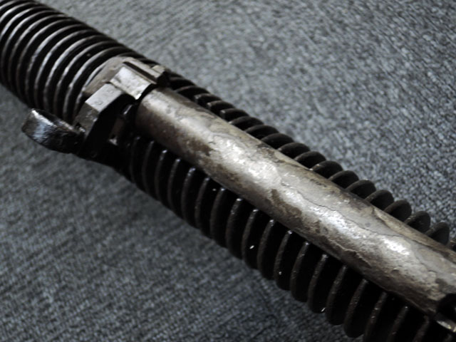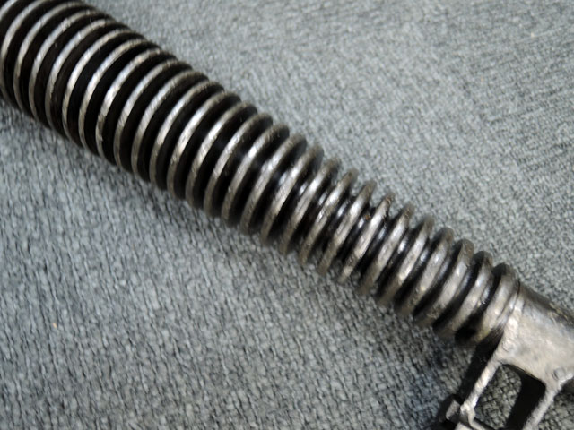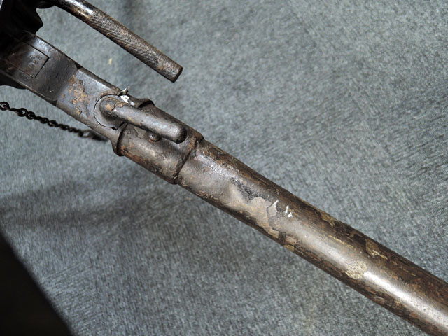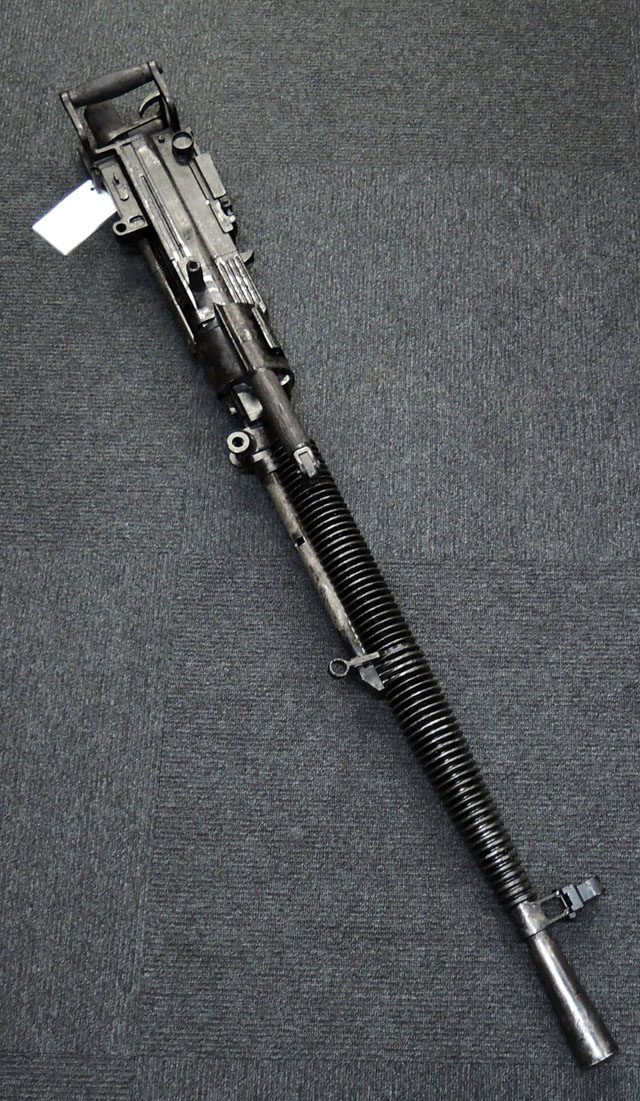 本品は某国の湖から引き揚げられた品です。 約70年間水中に沈んでいた品であるにも関わらず朽ち込み錆も比較的少なく、シリアルNo.などの刻印が確認出来る他、一部にオリジナルの仕上げが残っているなど、全体の状態は比較的良好と言えます。 また、フィード・カバーのラッチやスペード・グリップ左上部のセーフティ・ボタンなどのバネもしっかりと残っており作動します。 欠損しやすいバレル・フィンも破損や変形は見られず、良好な状態を保っています。 木製のスペード・グリップやキャリング・ハンドルは黒色に変色しているものの、目立った割れや欠損は見られず、しっかりとした強度が保たれています。