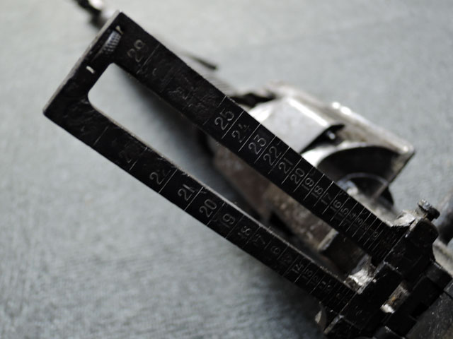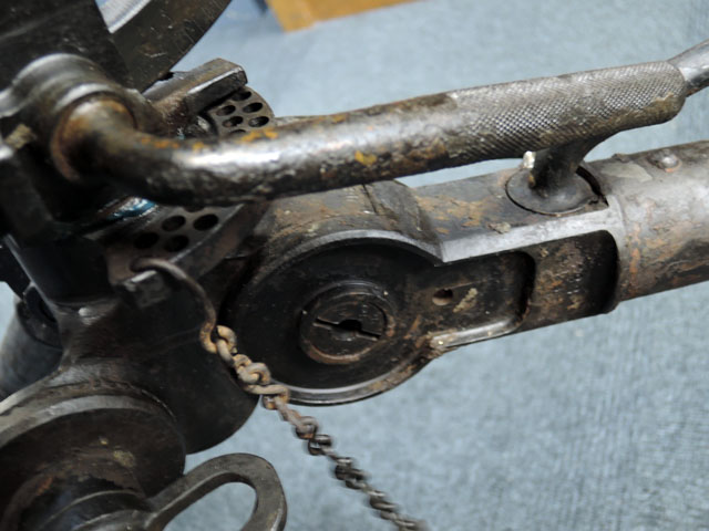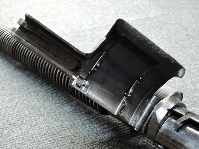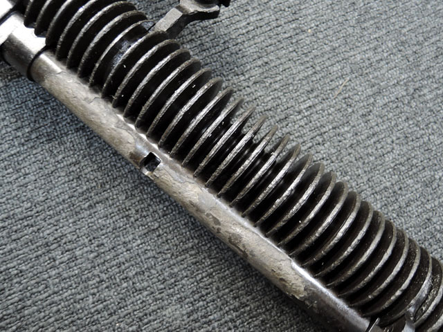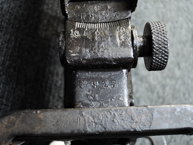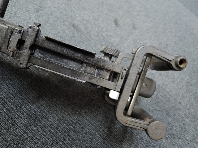 リア・サイトは上下左右の調整が可能となっておりますが、上下微調整用のダイヤルのみ固着して回転しない状態となっています。 フィード・カバーを開いた内部は水に触れる事が少なかった為か、オリジナルの仕上げが大部分残っており、DS39の特異な給弾構造が確認できます。