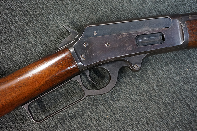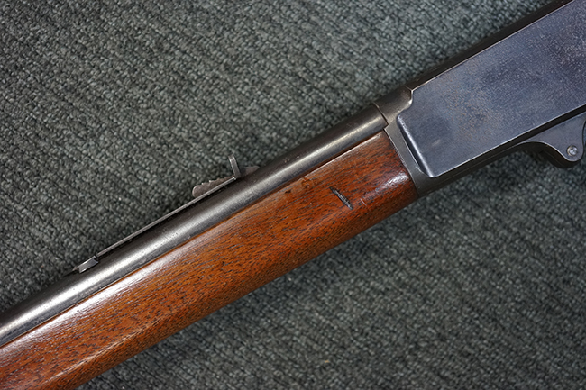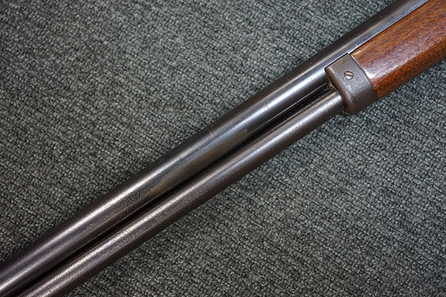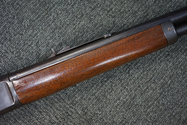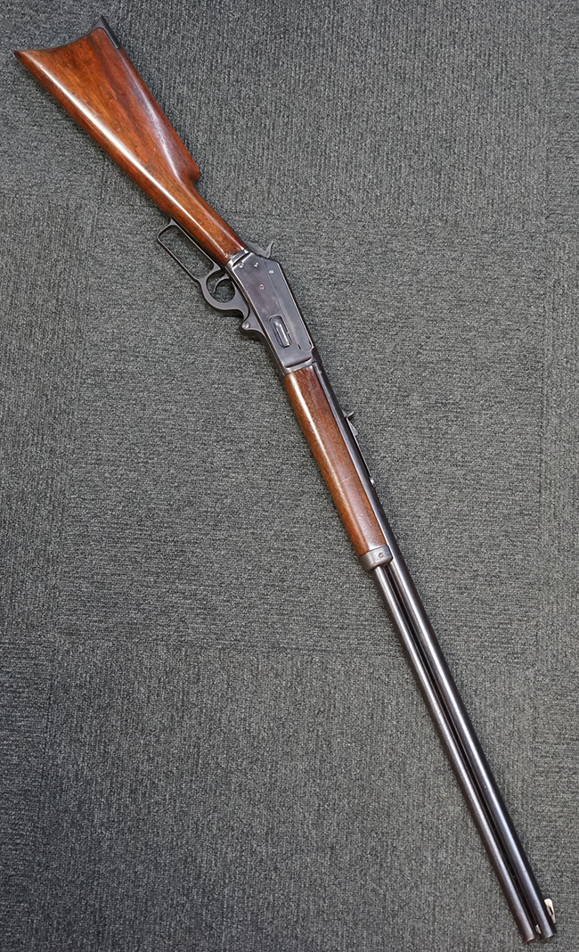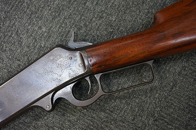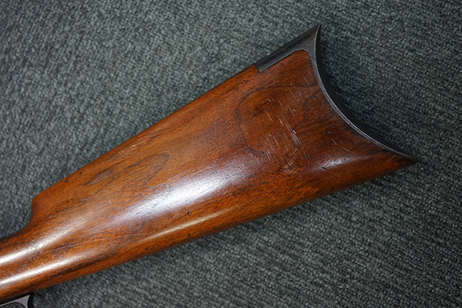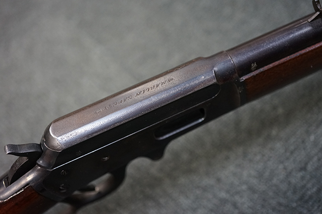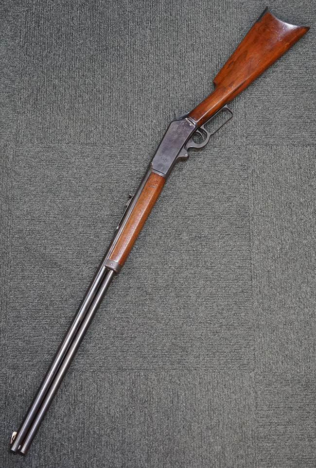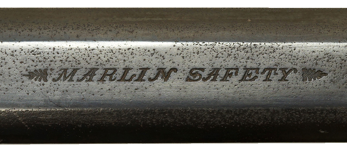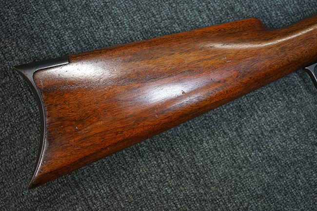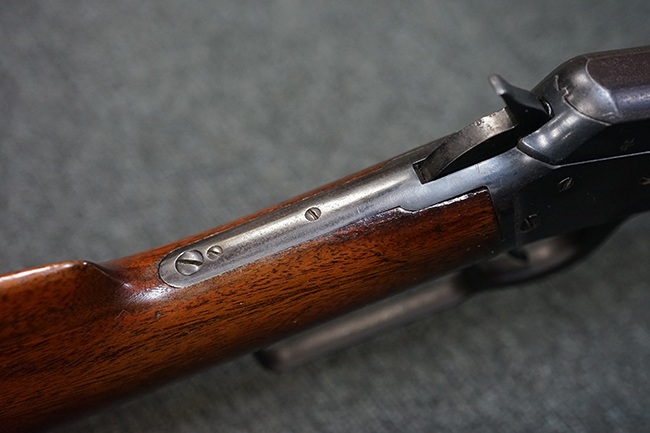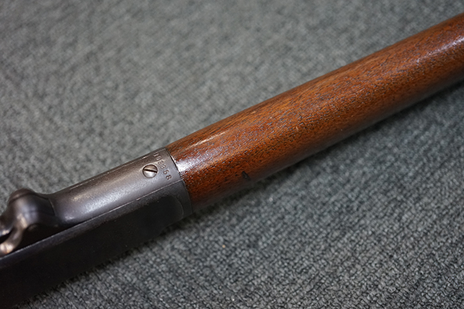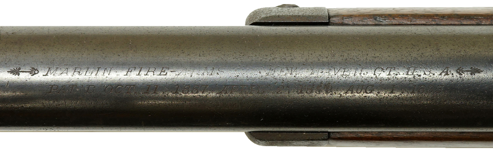 本品はシリアル??103358から1894年製の初期生産品であることが判ります。 19世紀末の辛うじて西部開拓期に製造された品と言えます。 シリアルNo.は他のM1881からの連番となり、10万台でも製造開始から二年目になります。 口径は最もポピュラーな.38口径 (.38-.55Win.弾) で、銃身長は26in.のラウンド (円形) バレルです。 機関部上部の「MARLIN SAFETY」の刻印ははっきりと判読する事ができ、銃身中央部には、やや薄れていますが「MARLIN FIRE-ARMS CO. NEW-HAVEN CT. U.S.A. PAT.D OCT.11.1887 APRIL.2.1889.AUG.1.1893」の刻印が見られます。 また、機関部底面にはシリアルNo.103358がはっきりと確認出来ます。